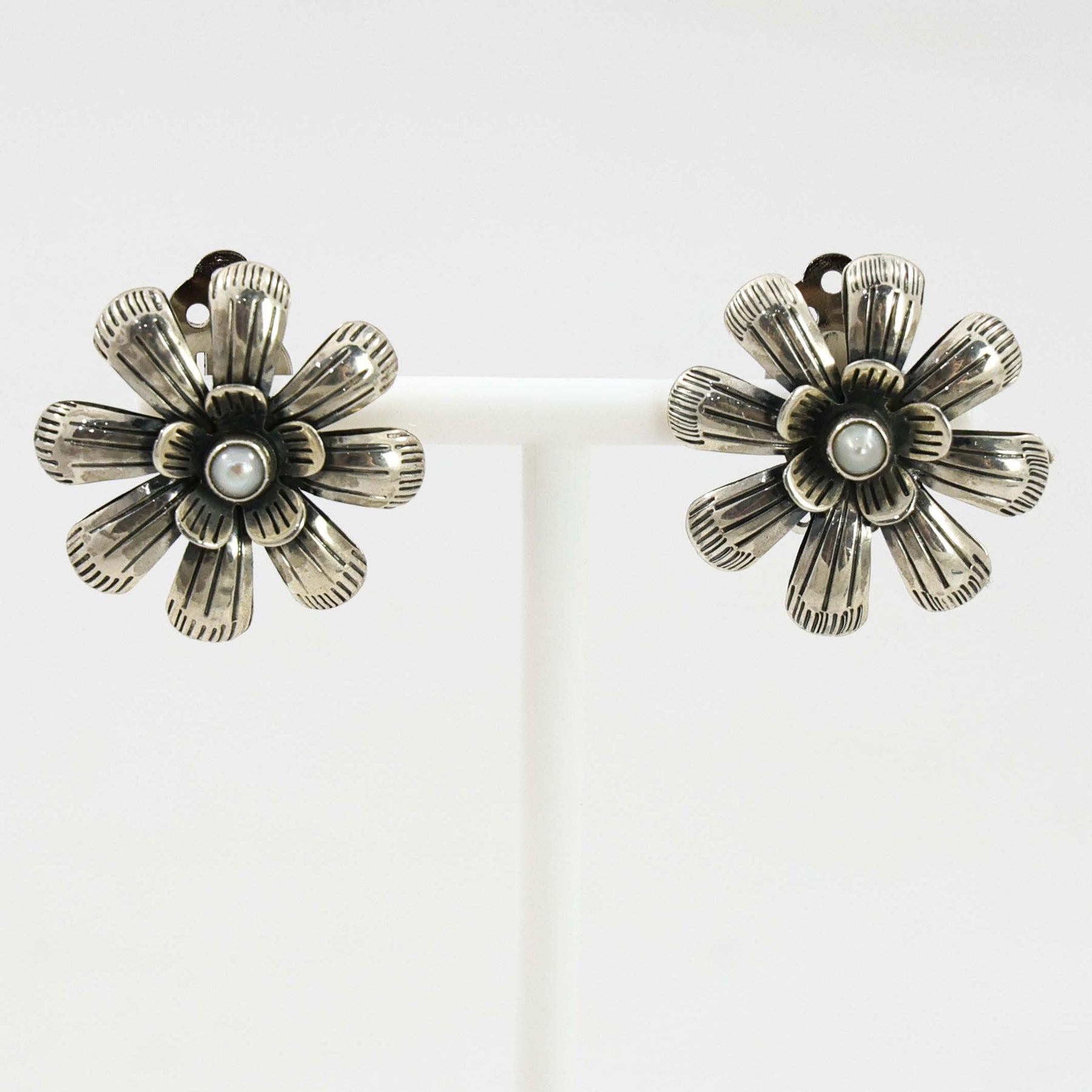 Sterling Silver Clip-on Flower Button Earrings set with Pearls.