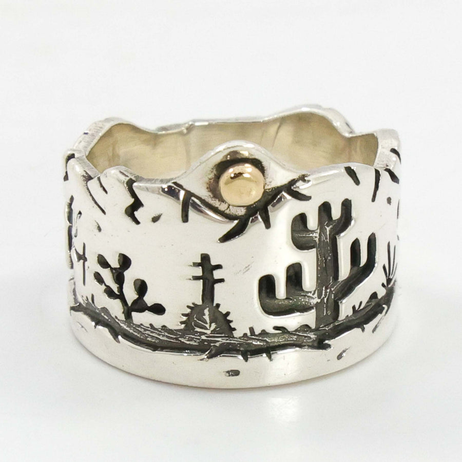 Sterling Silver Ring with Overlaid Desert Scene and a 14k Gold Sun.