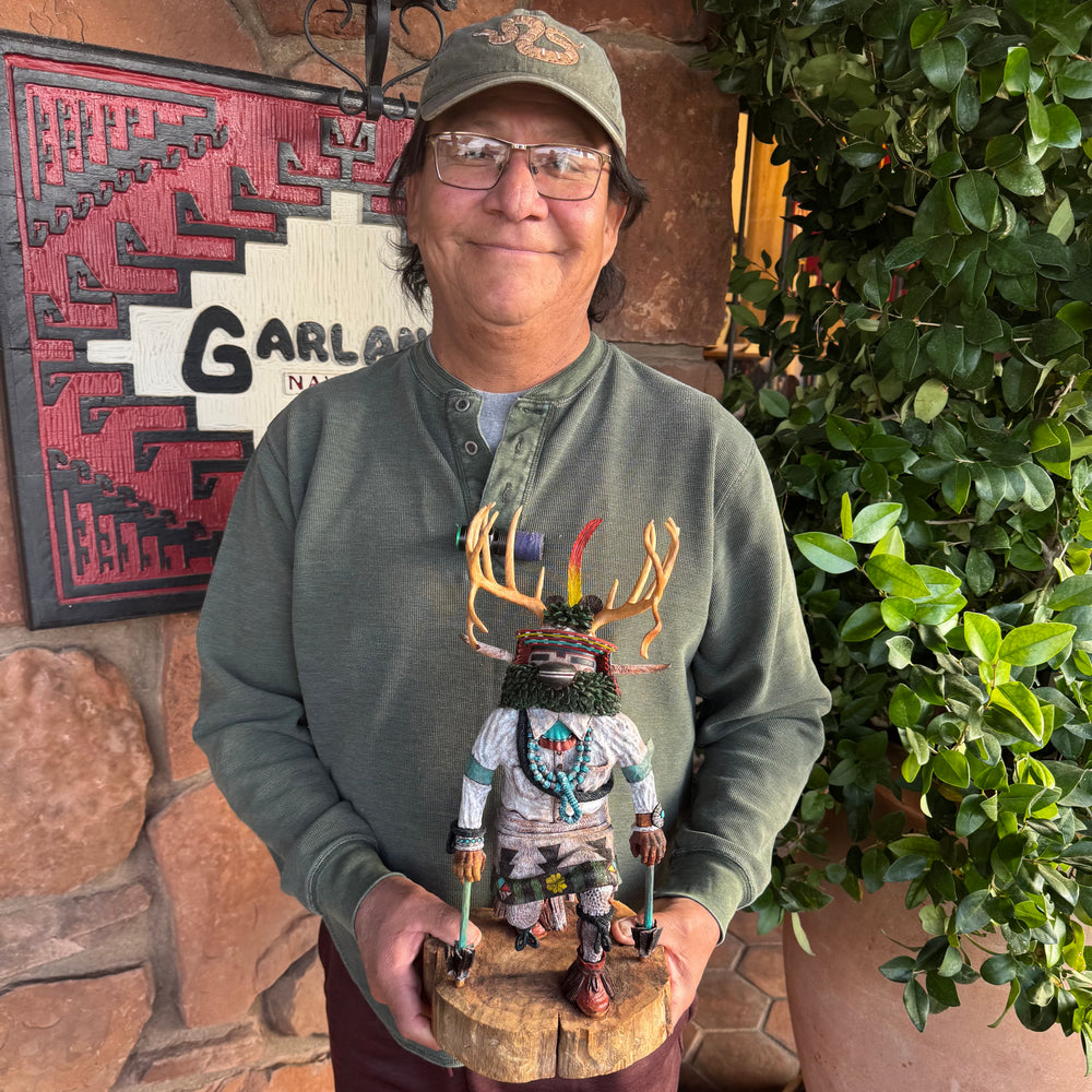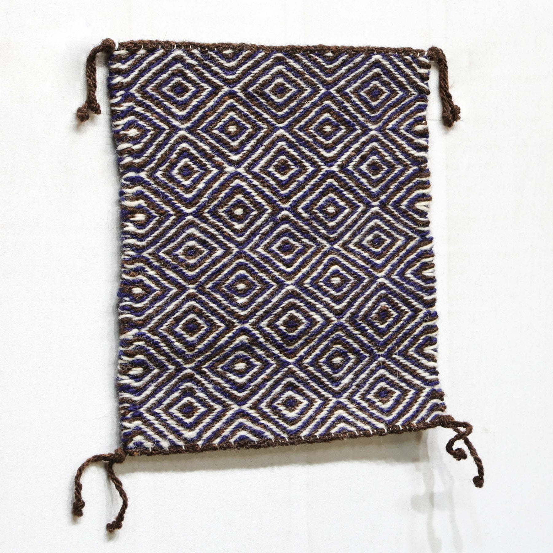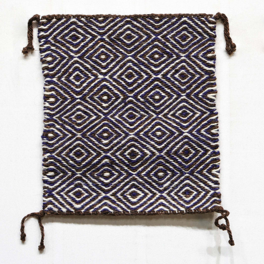 This small Diamond Twill weaving, also known as a Two-Face weaving, by skilled Navajo artist Brenda Joshevama showcases the challenging reversible technique unique to Navajo textiles. The interlocking diamond pattern creates a bold, optical design that reverses colors on the opposite side, with deep blue, rich brown, and cream forming concentric diamonds across the entire field.