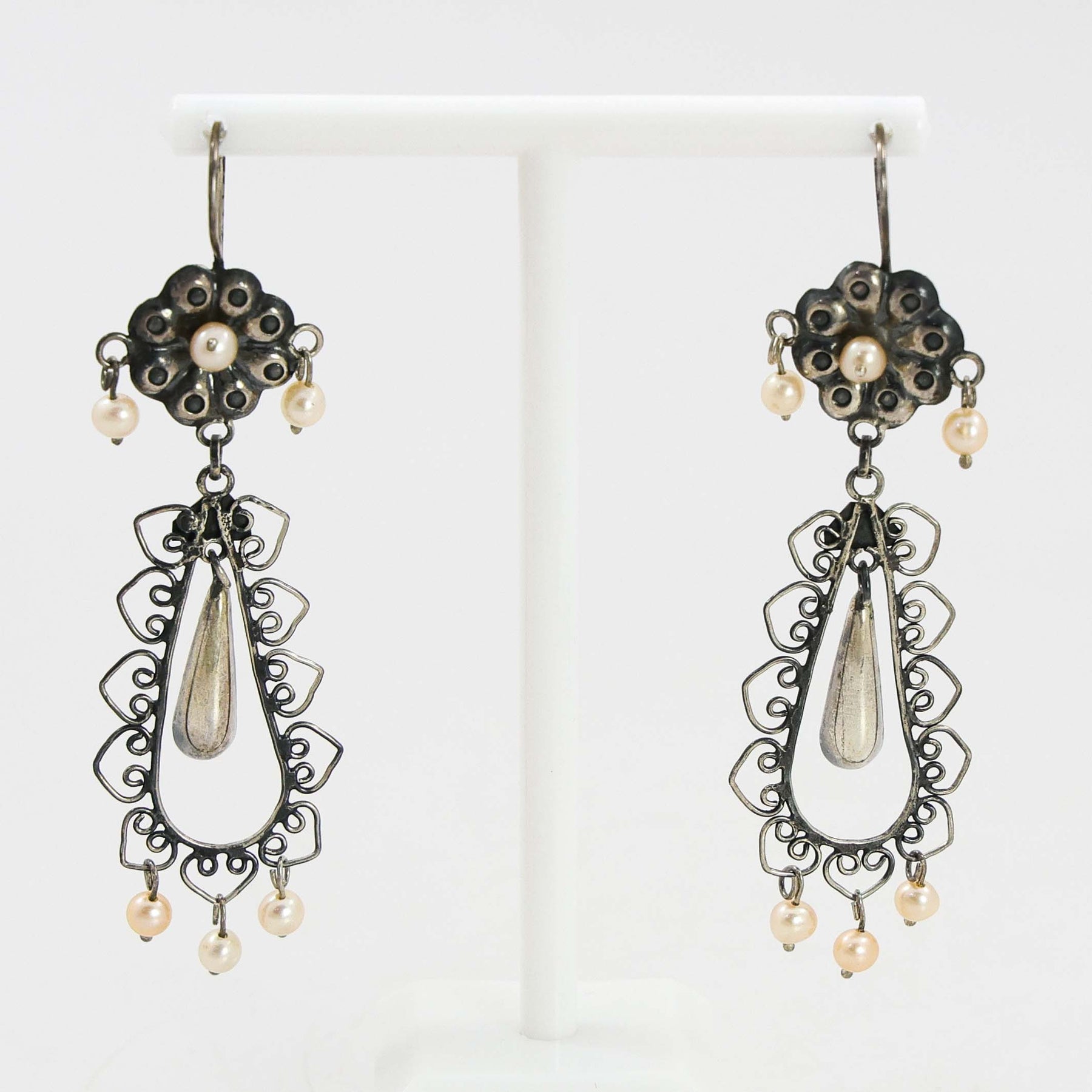 Sterling Silver French Hook Dangle Earrings with Fresh Water Pearls and Frida Kahlo Design Elements.