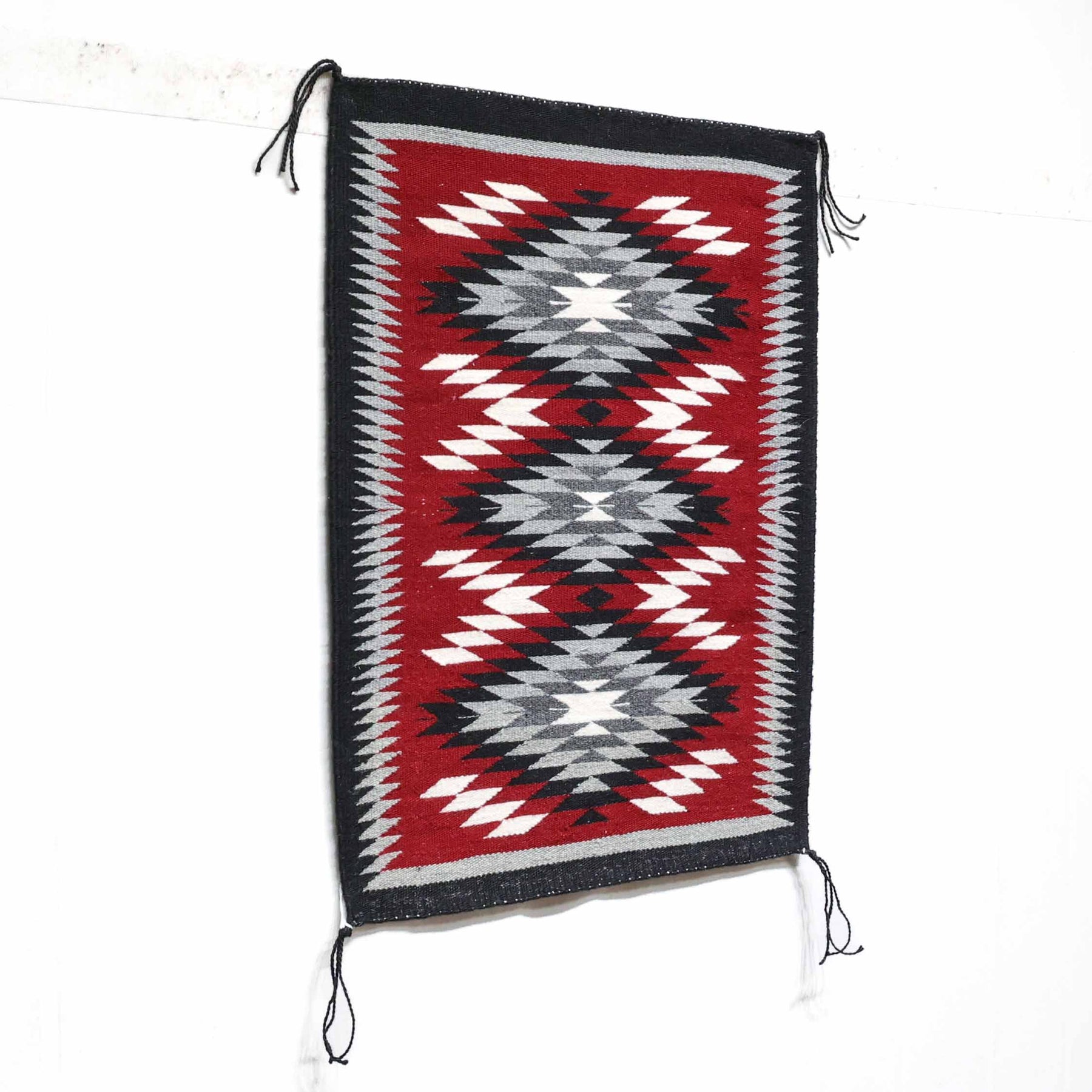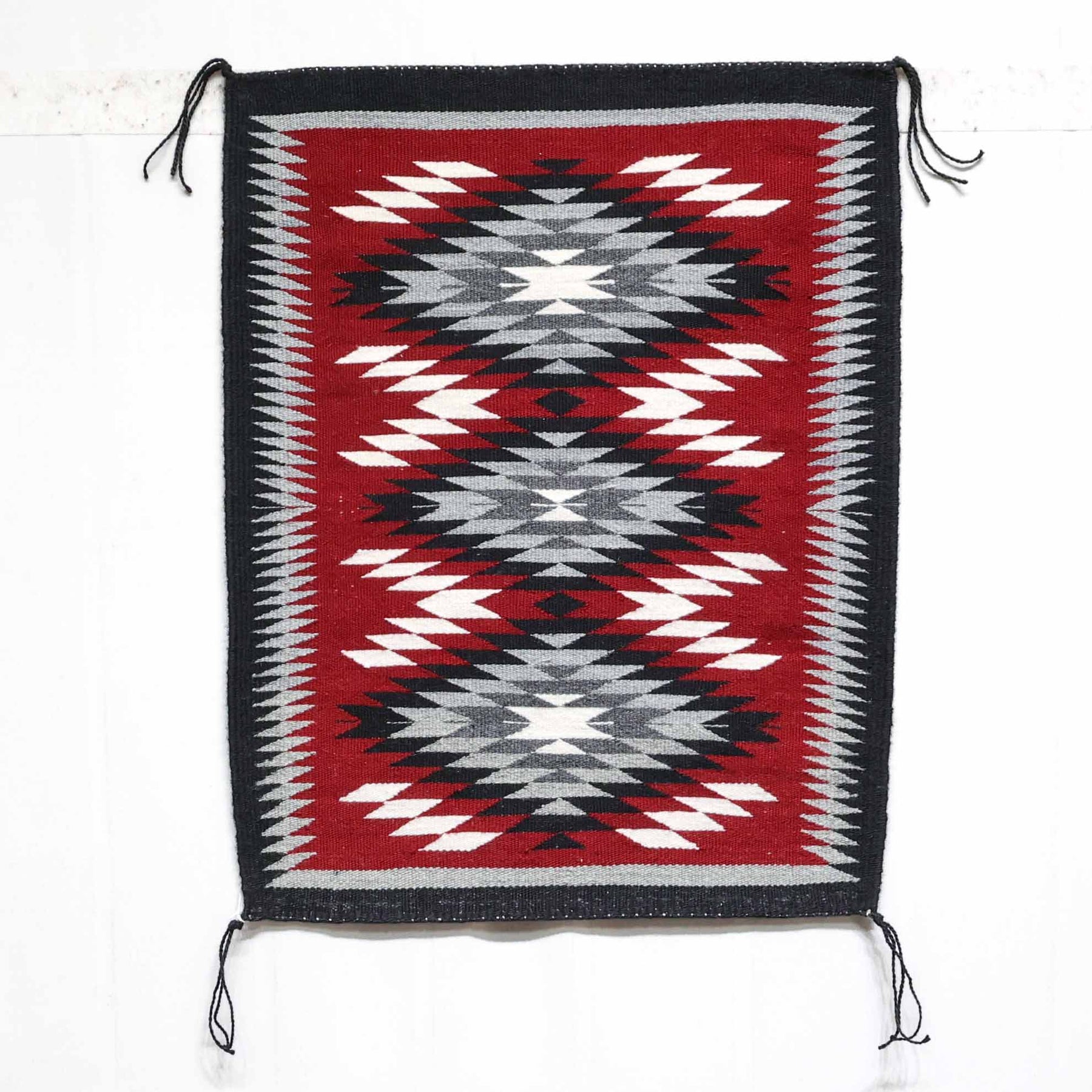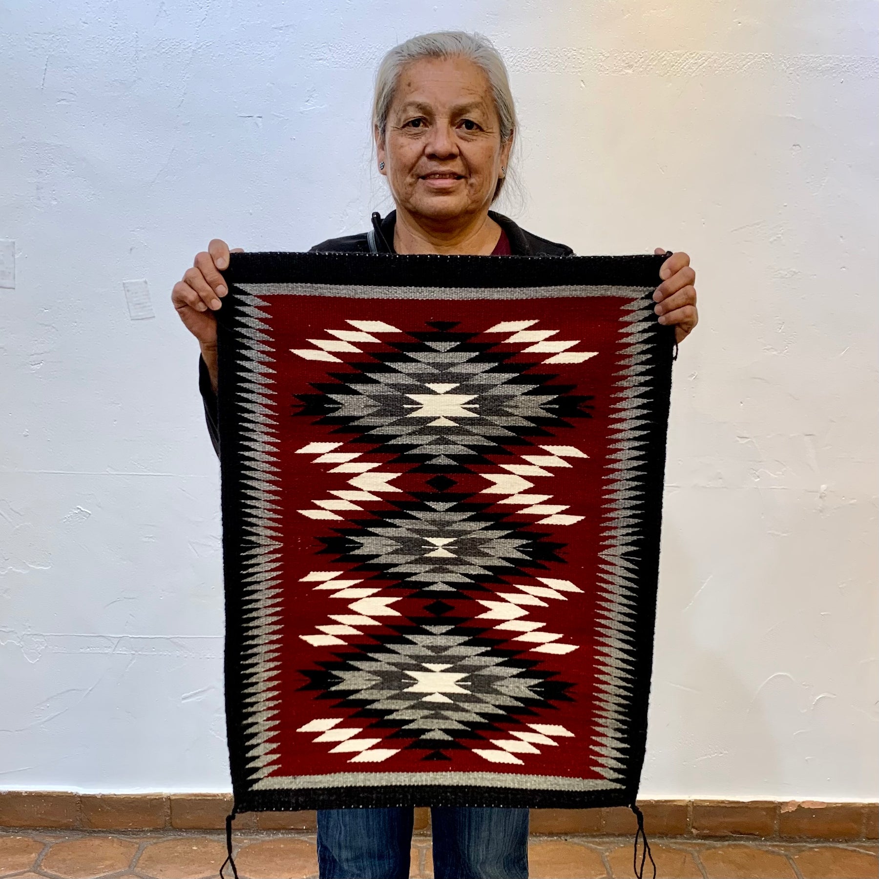 Ganado Red weaving by Mary Ann Tisi, handwoven in wool with a classic Ganado layout featuring three bold central diamonds set against a rich red field.