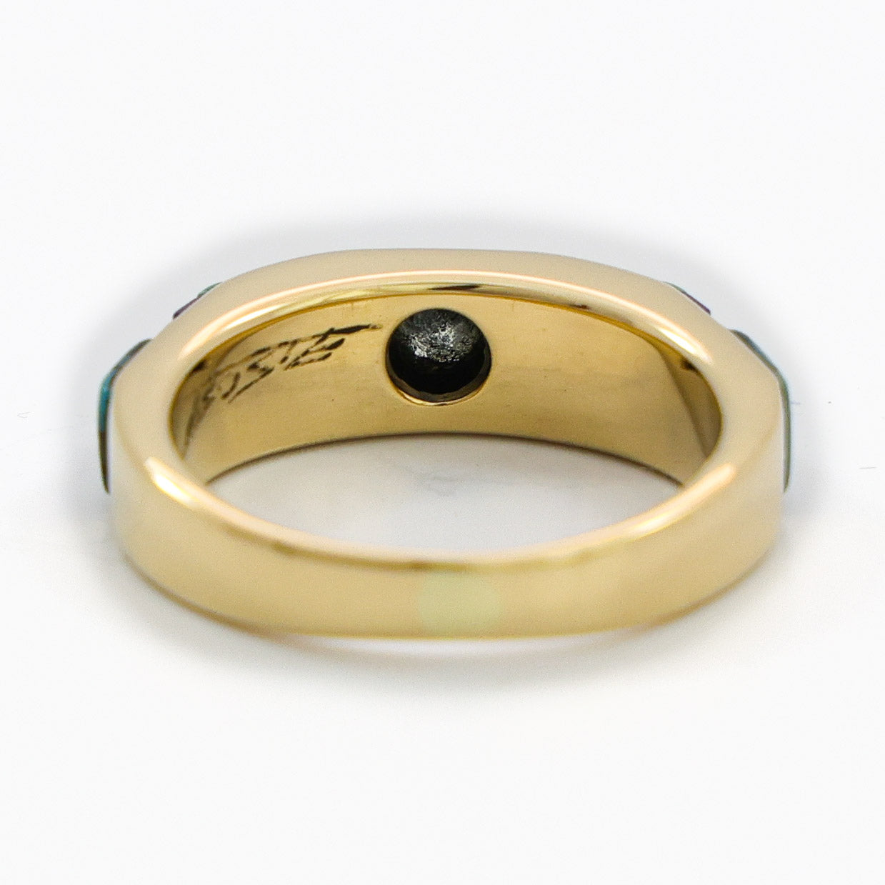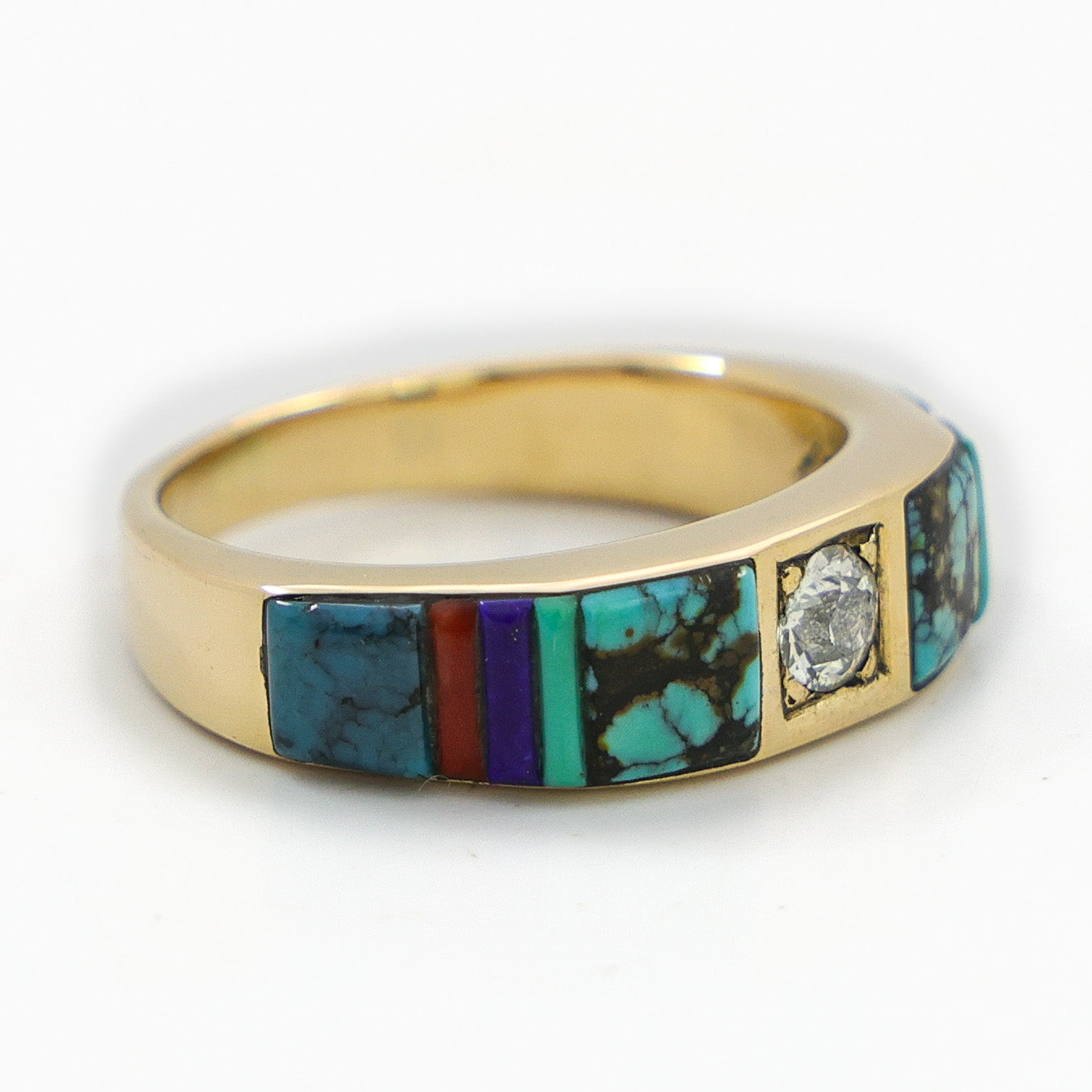14k gold Navajo inlay ring by Boyd Tsosie, featuring a clean, balanced mosaic inlay design with natural turquoise, lapis, and Mediterranean coral. A single natural diamond, 4.15 mm in diameter, is flush set at the center, adding a subtle point of contrast without overpowering the inlay work. Well-executed goldwork with a smooth, comfortable profile, designed as a refined and wearable piece that highlights strong materials, symmetry, and understated craftsmanship.