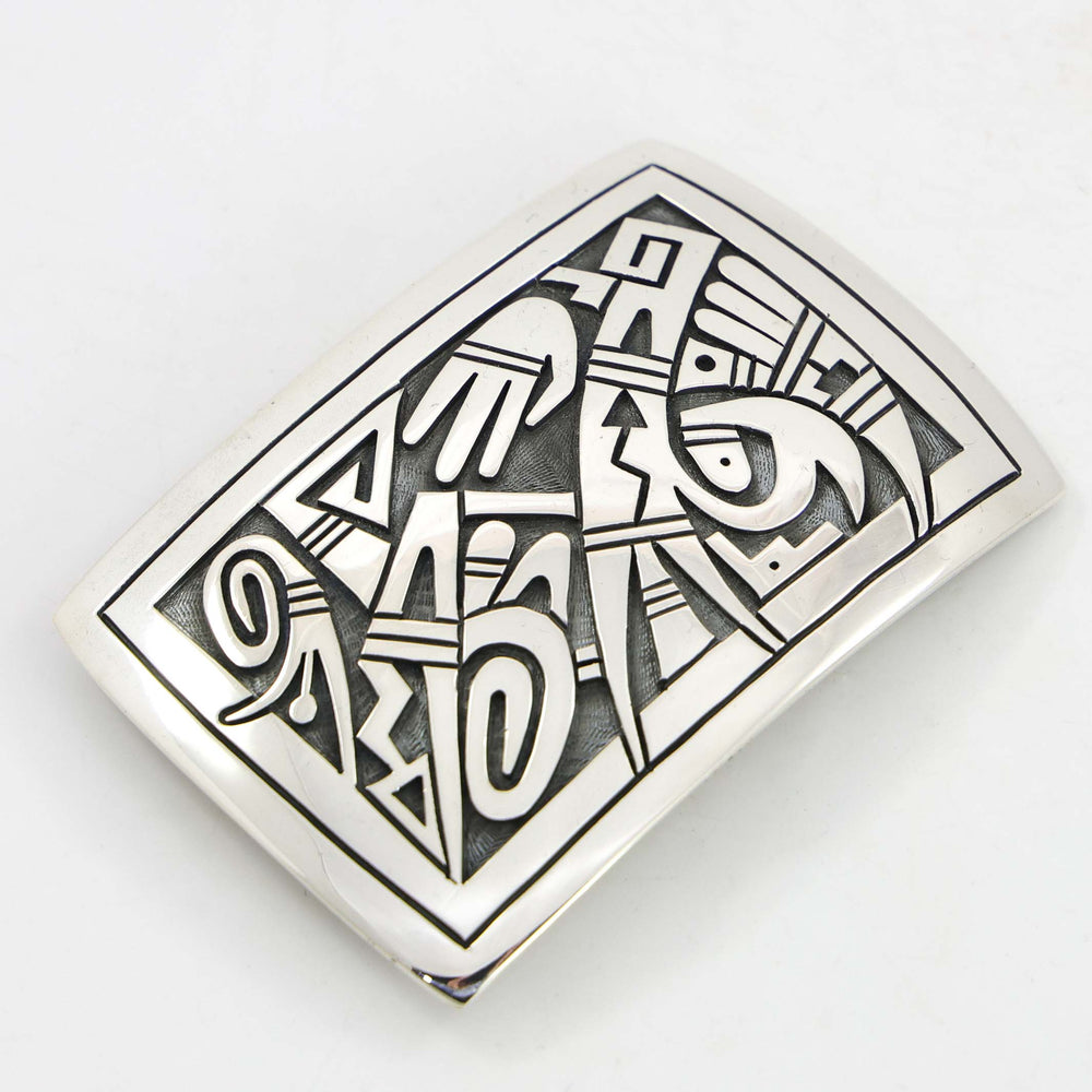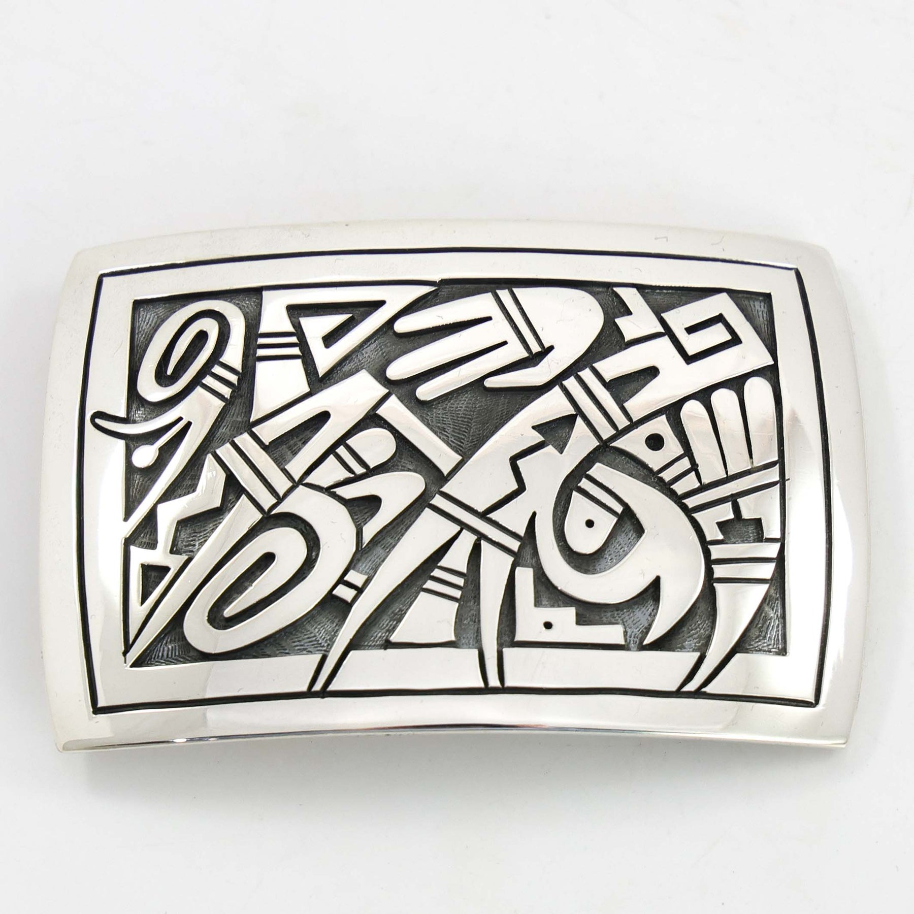 Sterling Silver Western-Style Belt Buckle with Intricate Sityaki-Style Hopi Overlay Design including Rain Clouds, Rain, Wind, Lightning, Healing Hands, and Prayer Feathers by the Talented Hopi Silversmith, Philbert Poseyesva.