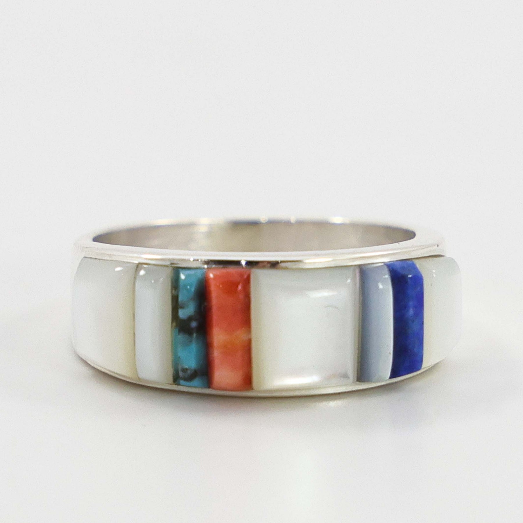 Sterling Silver Ring with Cobble Inlaid Mother of Pearl, Spiny Oyster Shell, Lapis, and Kingman Turquoise.