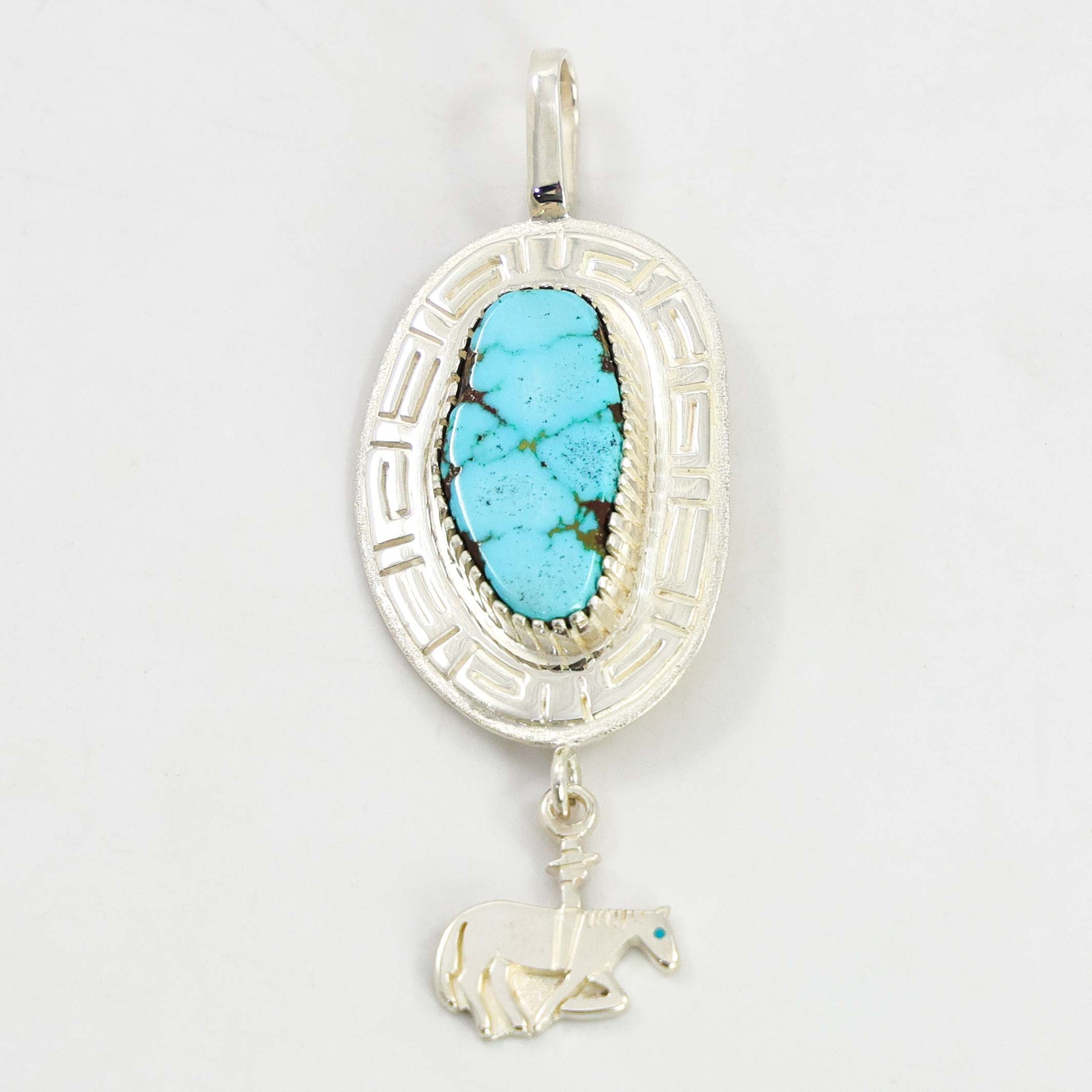 Sterling Silver Pendant set with Natural Kingman Turquoise and Featuring a Dangling Charm of a Cowboy on a Horse.