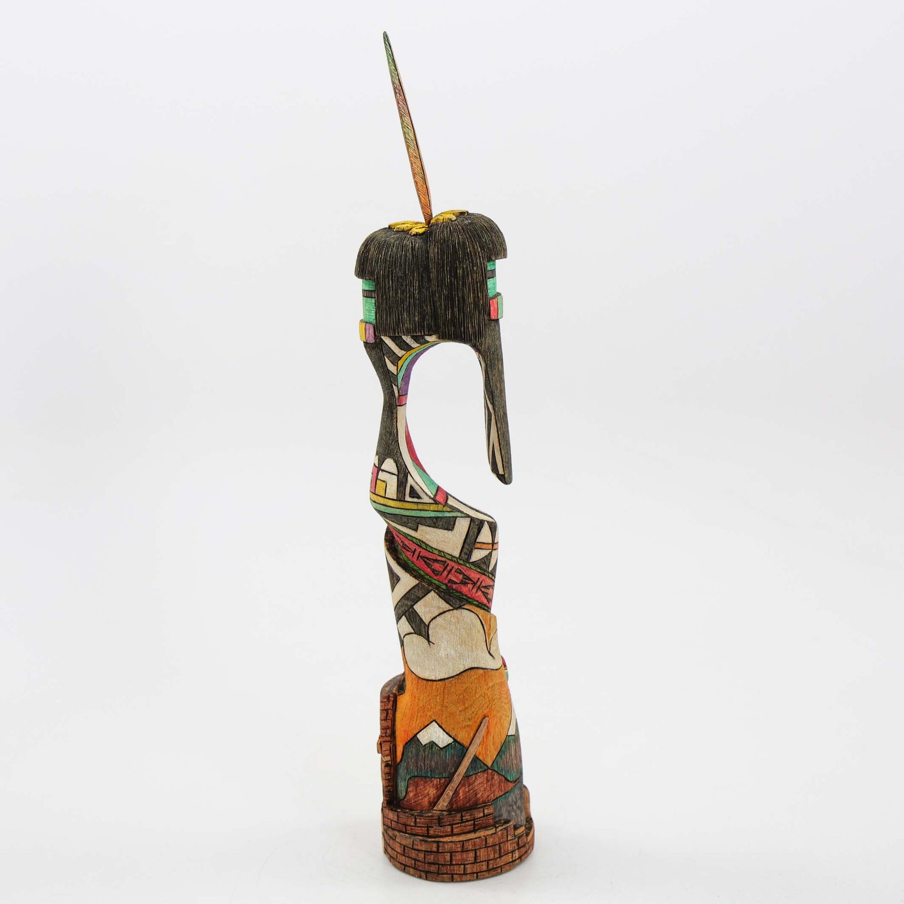 Hand- Carved and Painted Hopi Long Haired (Angka'china) Kachina Sculpture with Pueblo, Mountains, and Cloud Designs.