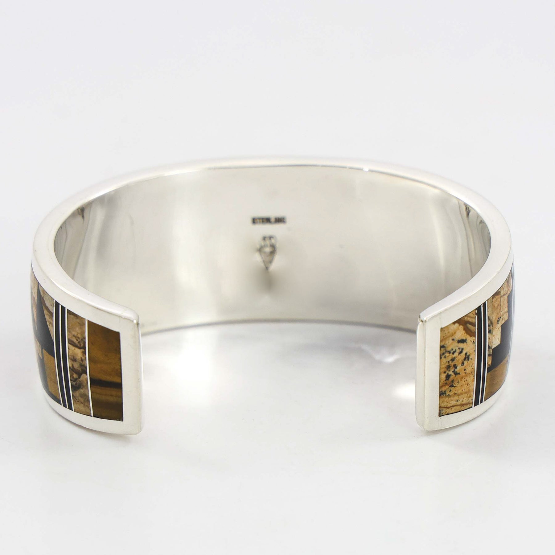 Sterling Silver Cuff Bracelet with a Channel Inlaid “Native Earth” Design using Black Jade, Tiger’s Eye, and Picture Jasper.