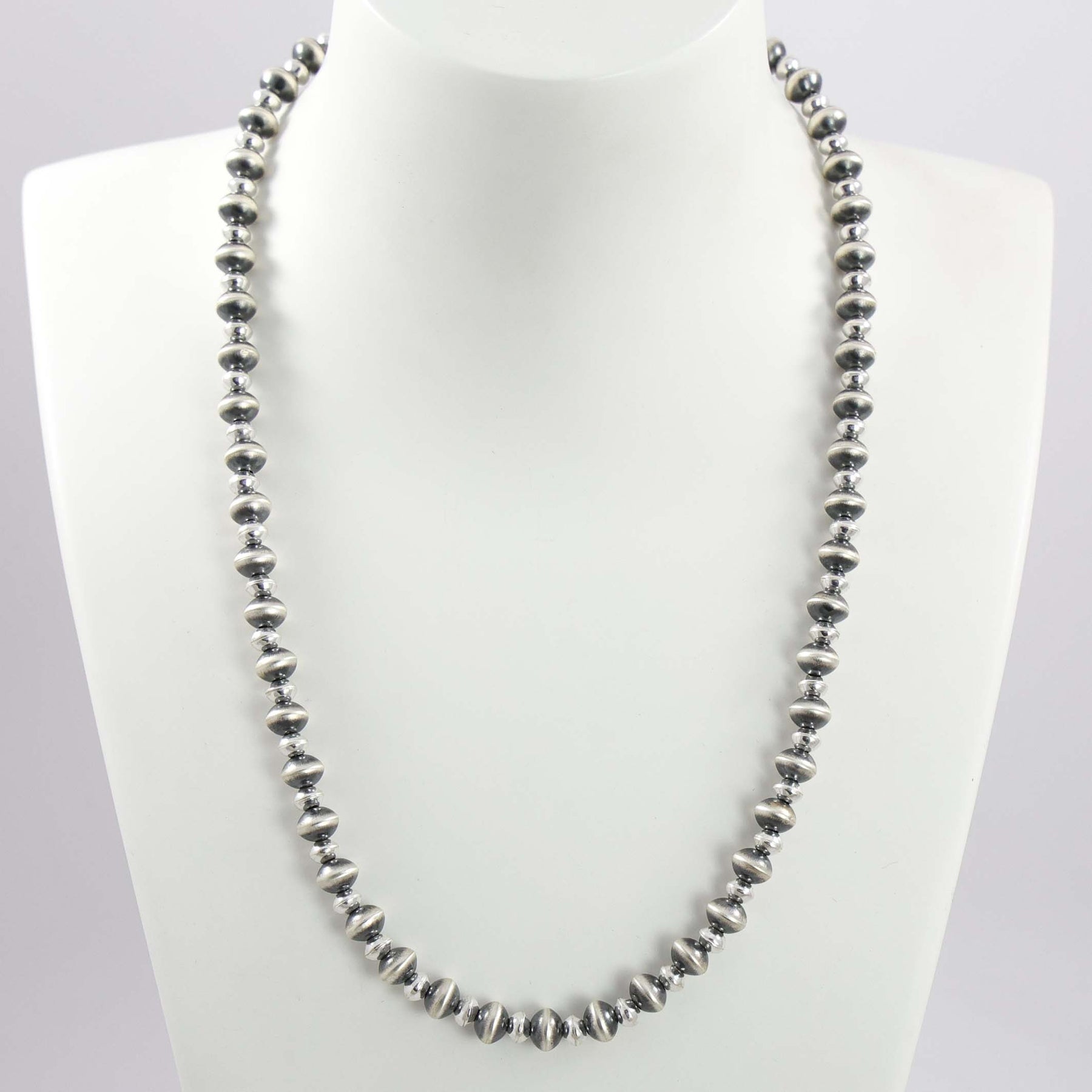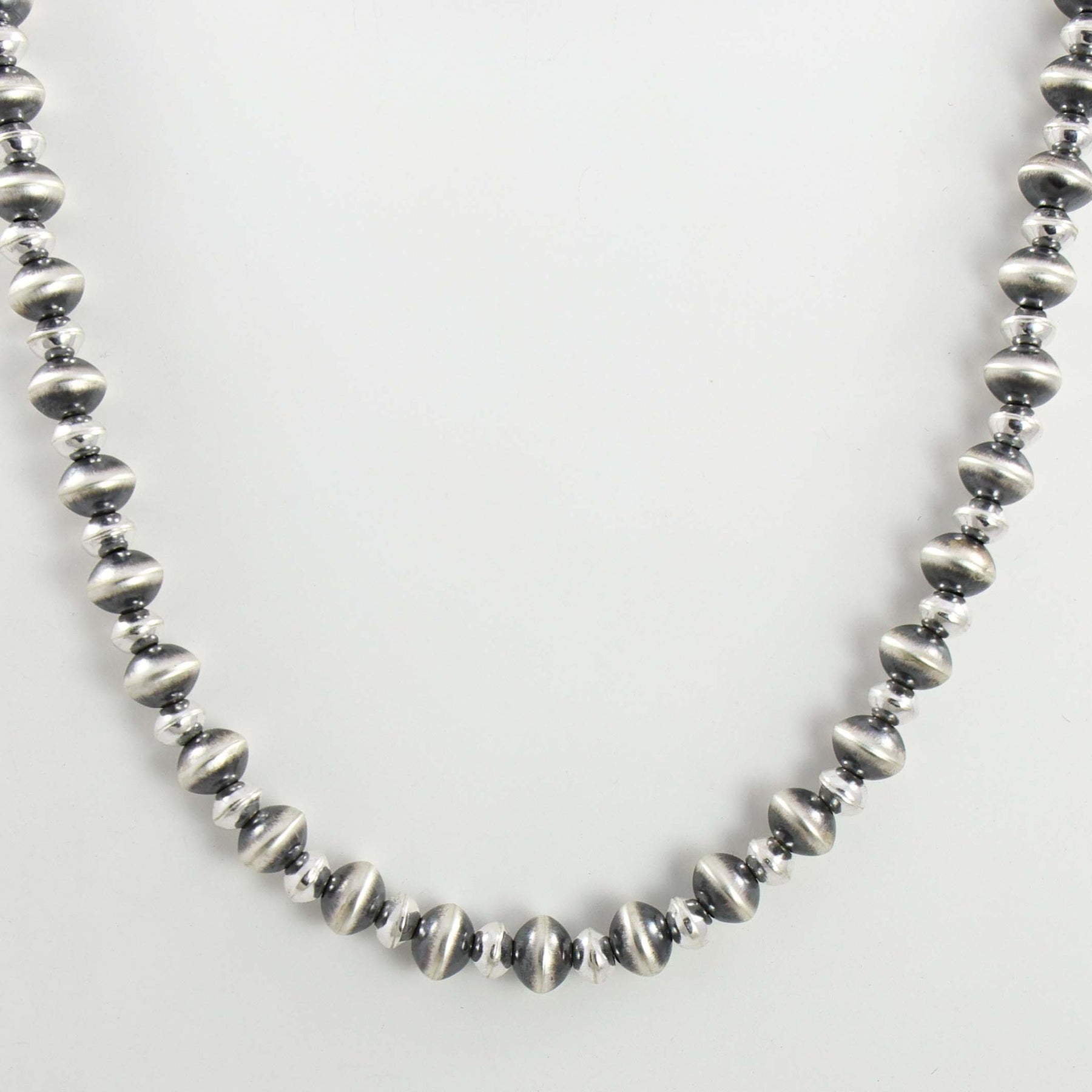 Sterling Silver Navajo Pearl Necklace with Alternating Handmade Beads in Oxidized and High Polish Finishes.