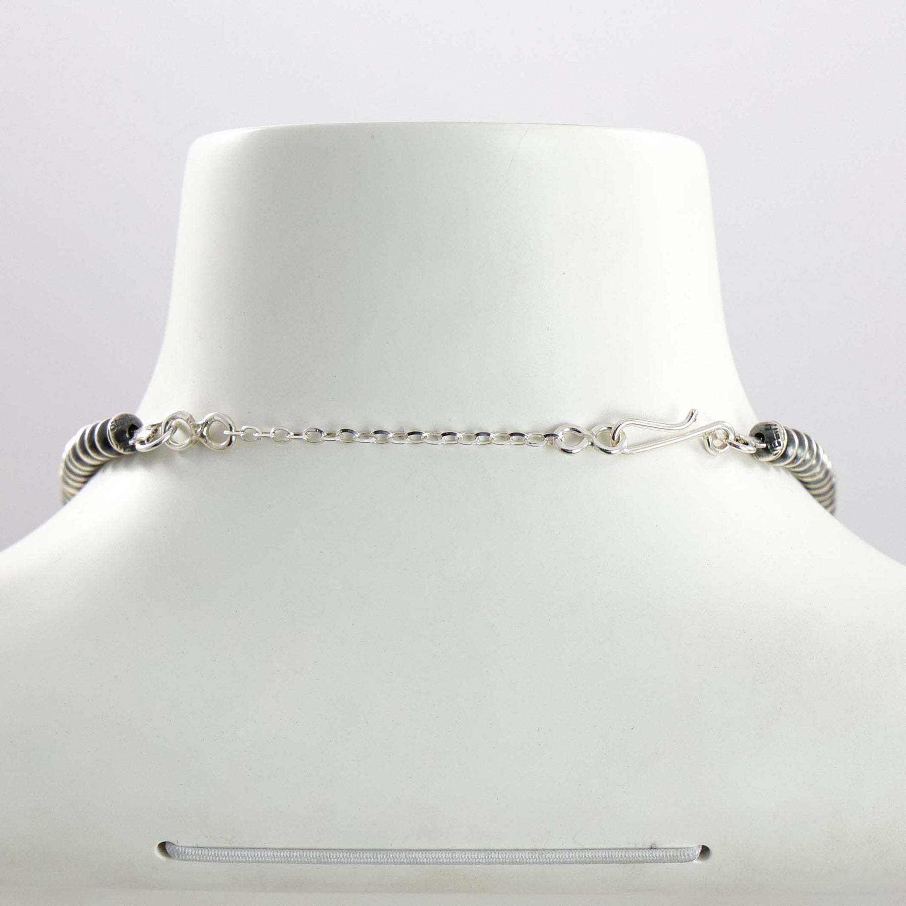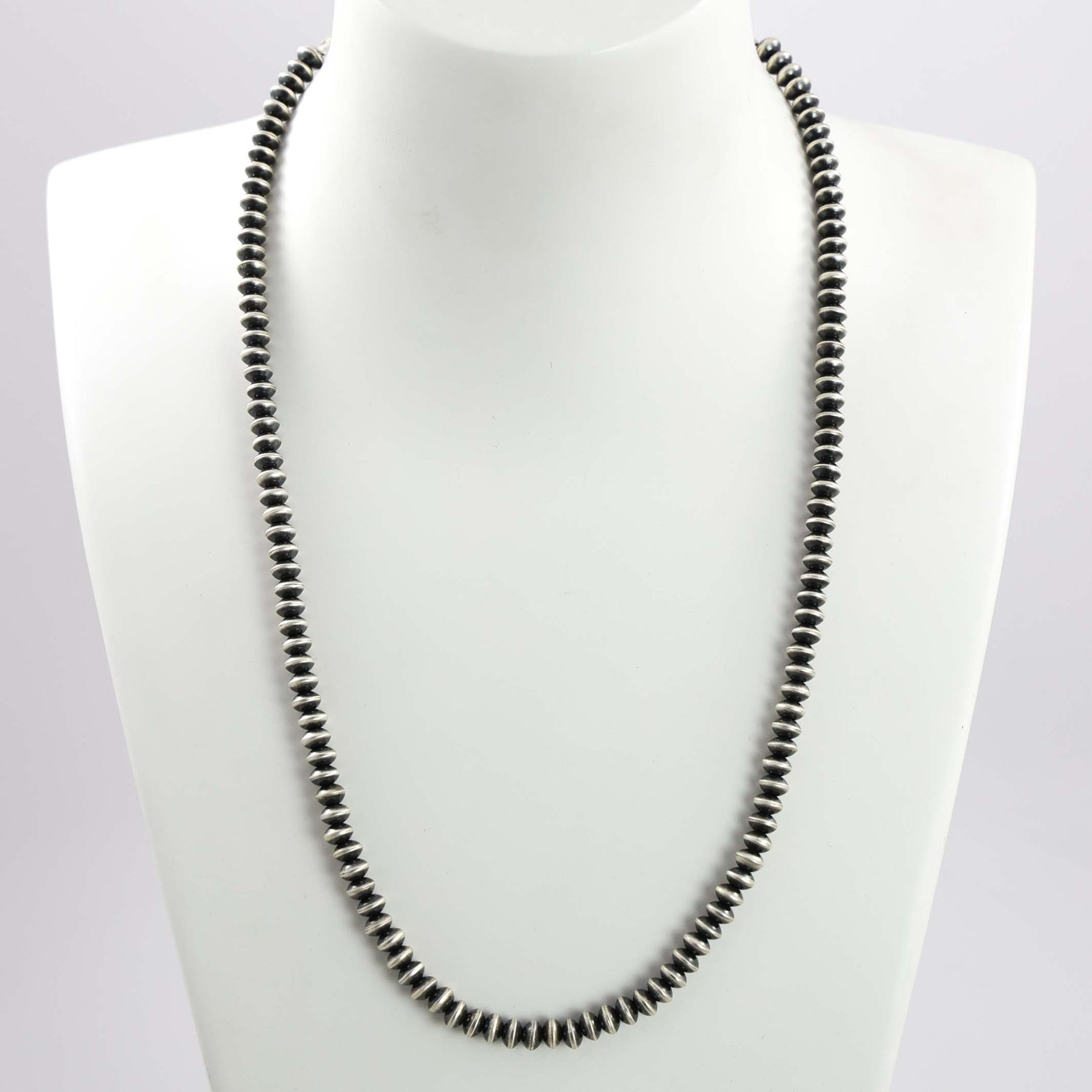 Sterling Silver Navajo Pearl Necklace with Handmade Beads in an Oxidized Finish.