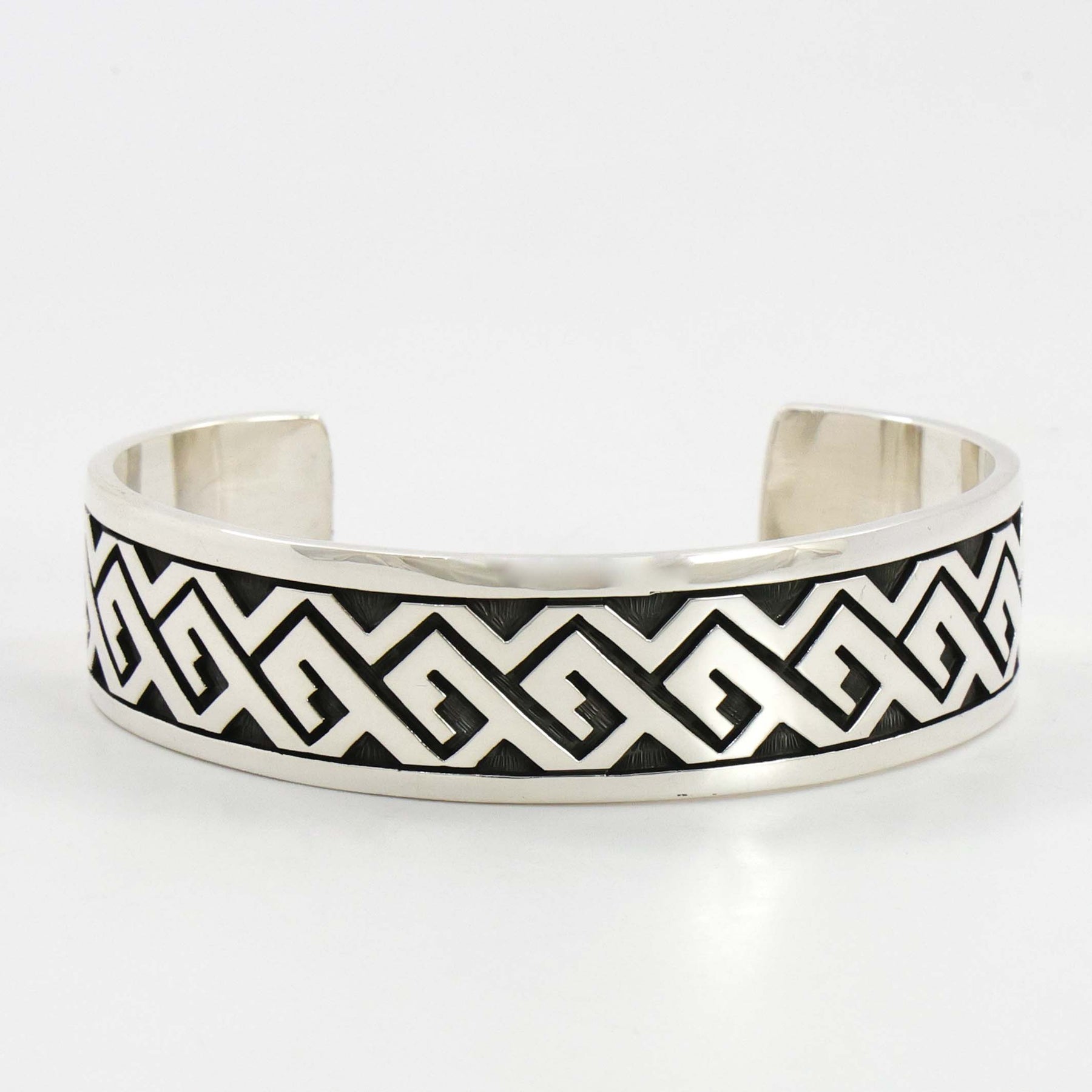 Sterling Silver Cuff Bracelet with Geometric Hopi Overlay Designs of Rain Clouds.
