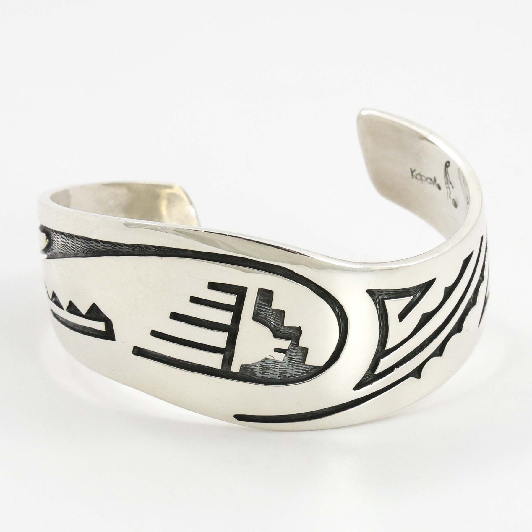 Sterling Silver “Twister” Cuff with Hopi Overlay Designs of Rain Clouds, Falling Rain, and Water, representing prayers for moisture and a good harvest.