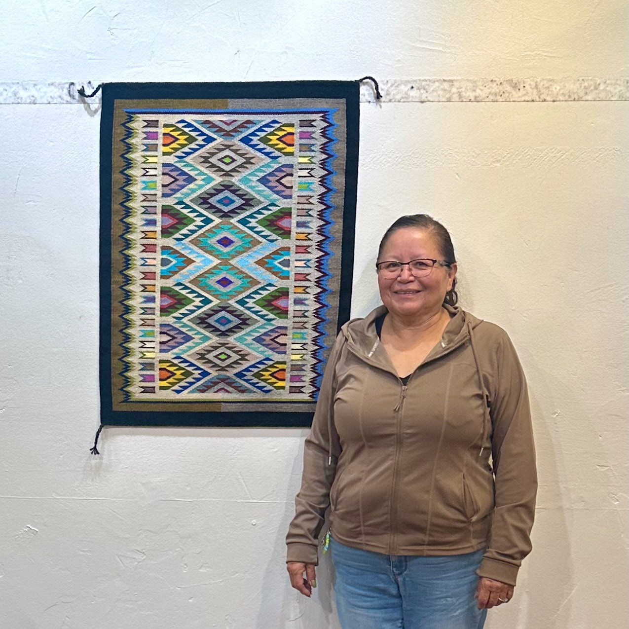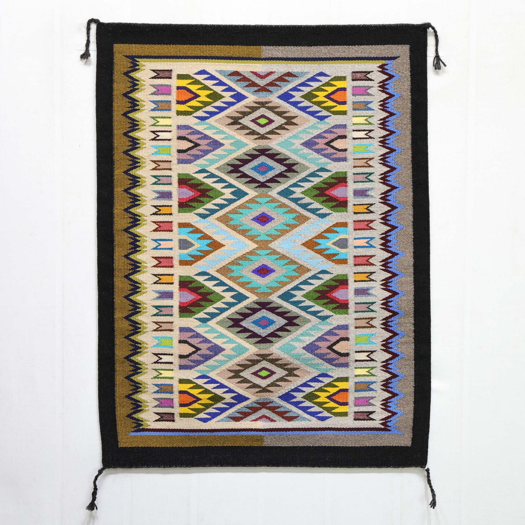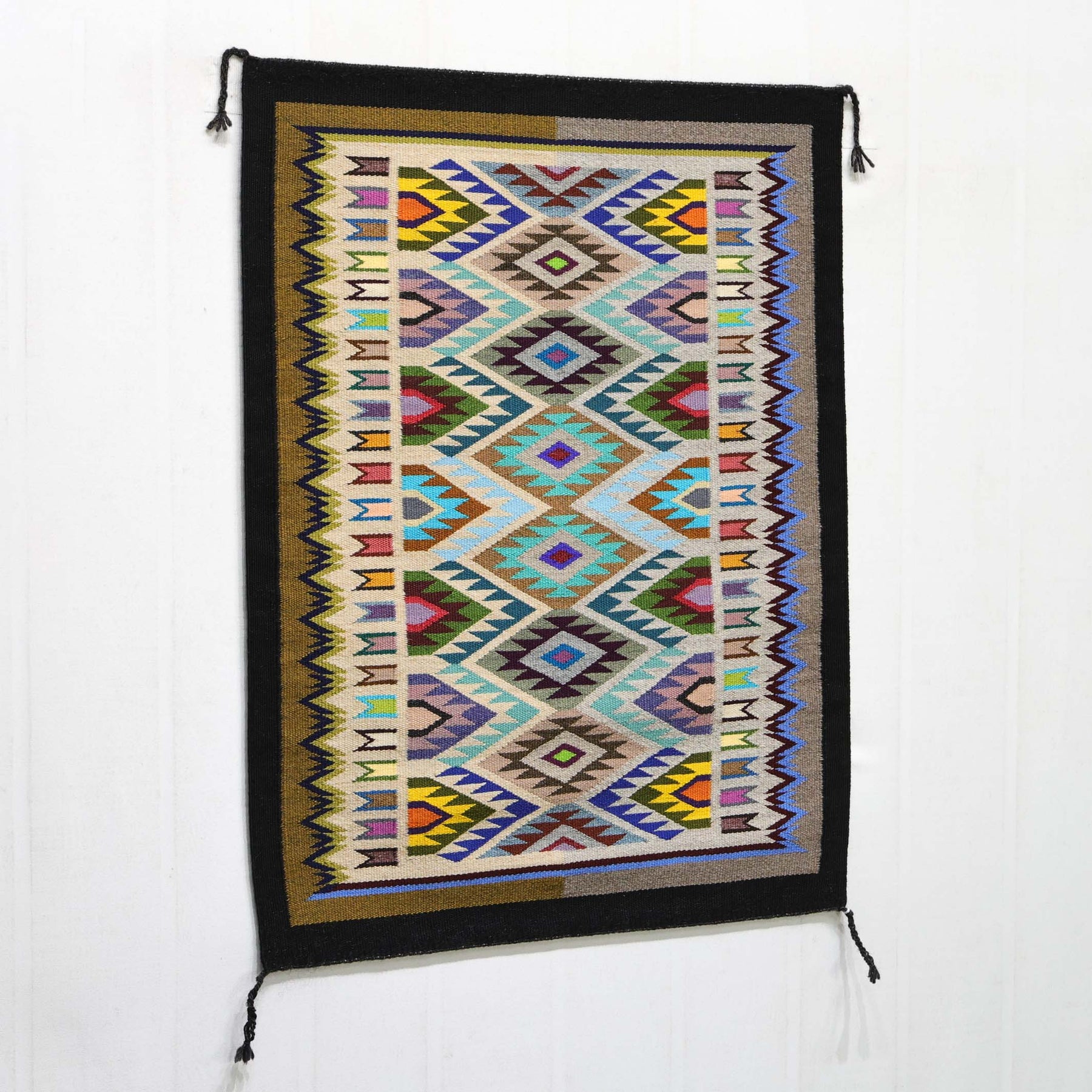 Handwoven Navajo tapestry in classic Red Mesa Eyedazzler style. Features central diamonds with layered serrated chevrons and zigzags, framed by a black border.
