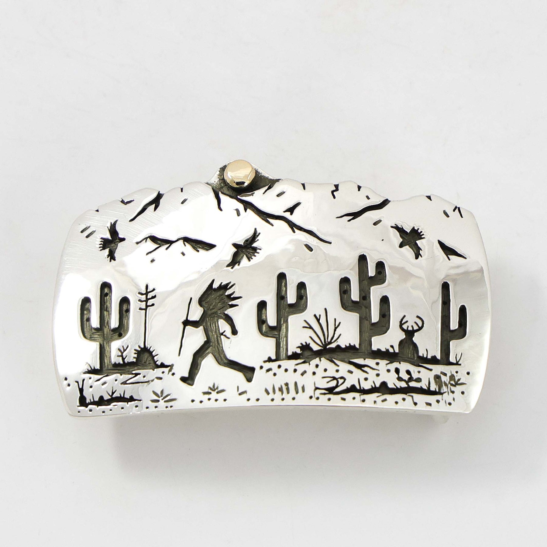 Sterling Silver Western Style Belt Buckle with Overlaid Designs Depicting a Runner in the Desert with a 14k Gold Sun.
