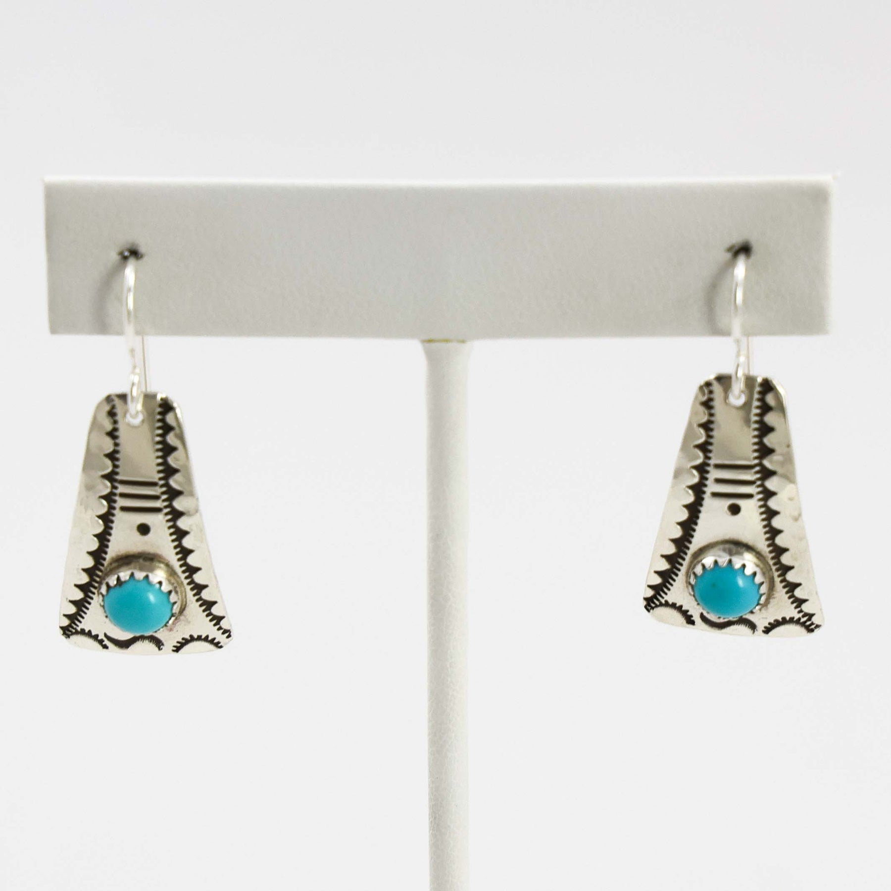 Sterling Silver French Hook Earrings with Hand-Stamped Designs and set with Sleeping Beauty Turquoise from Arizona.