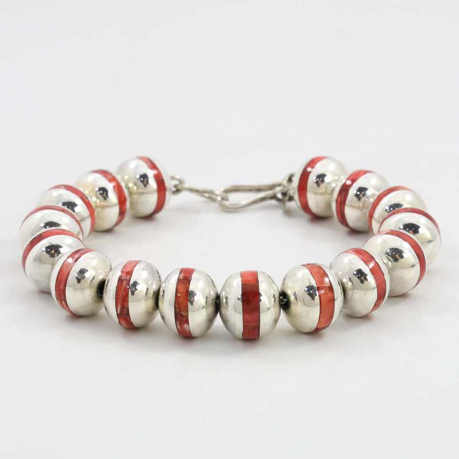 Sterling Silver Bead Bracelet with Inlaid Spiny Oyster Shell.