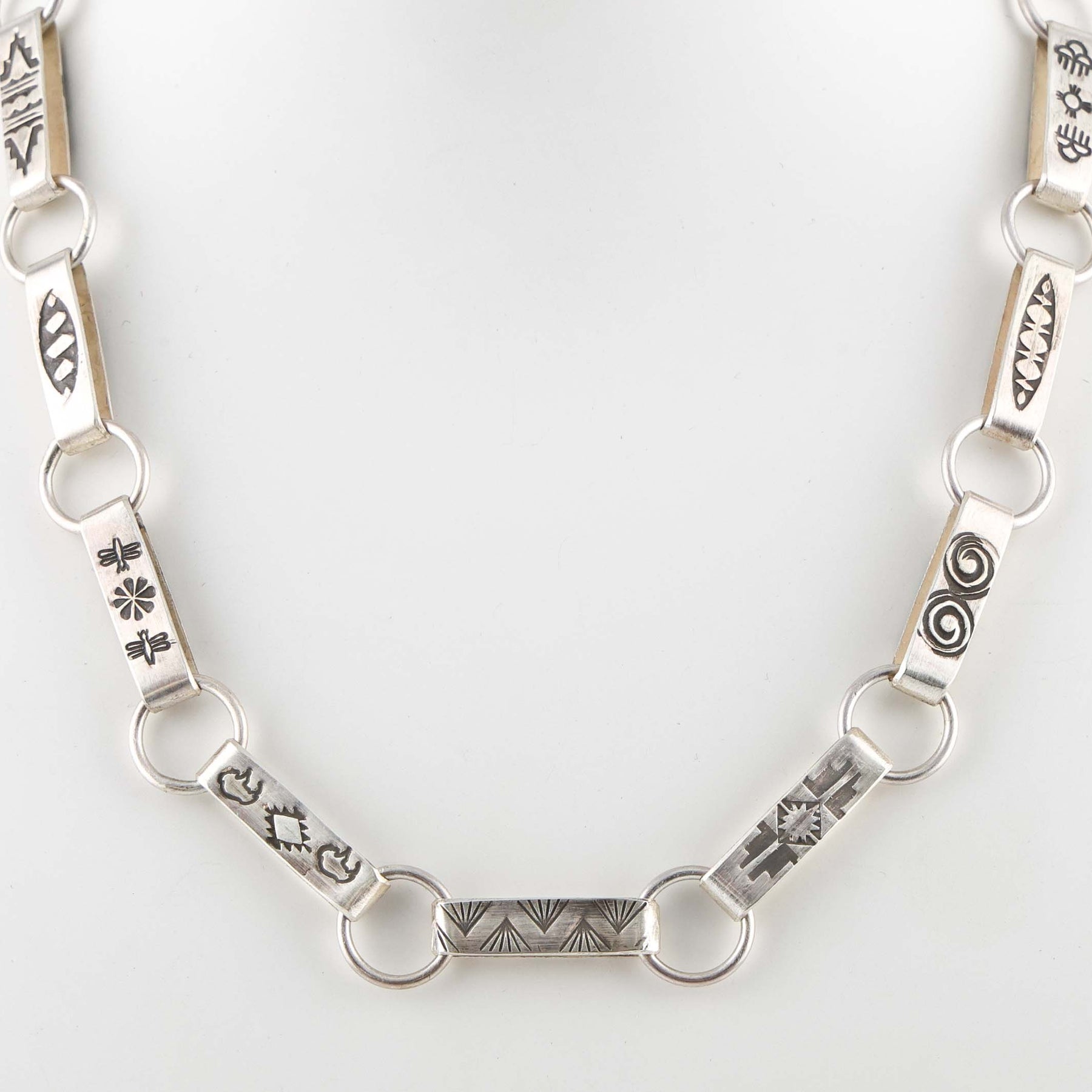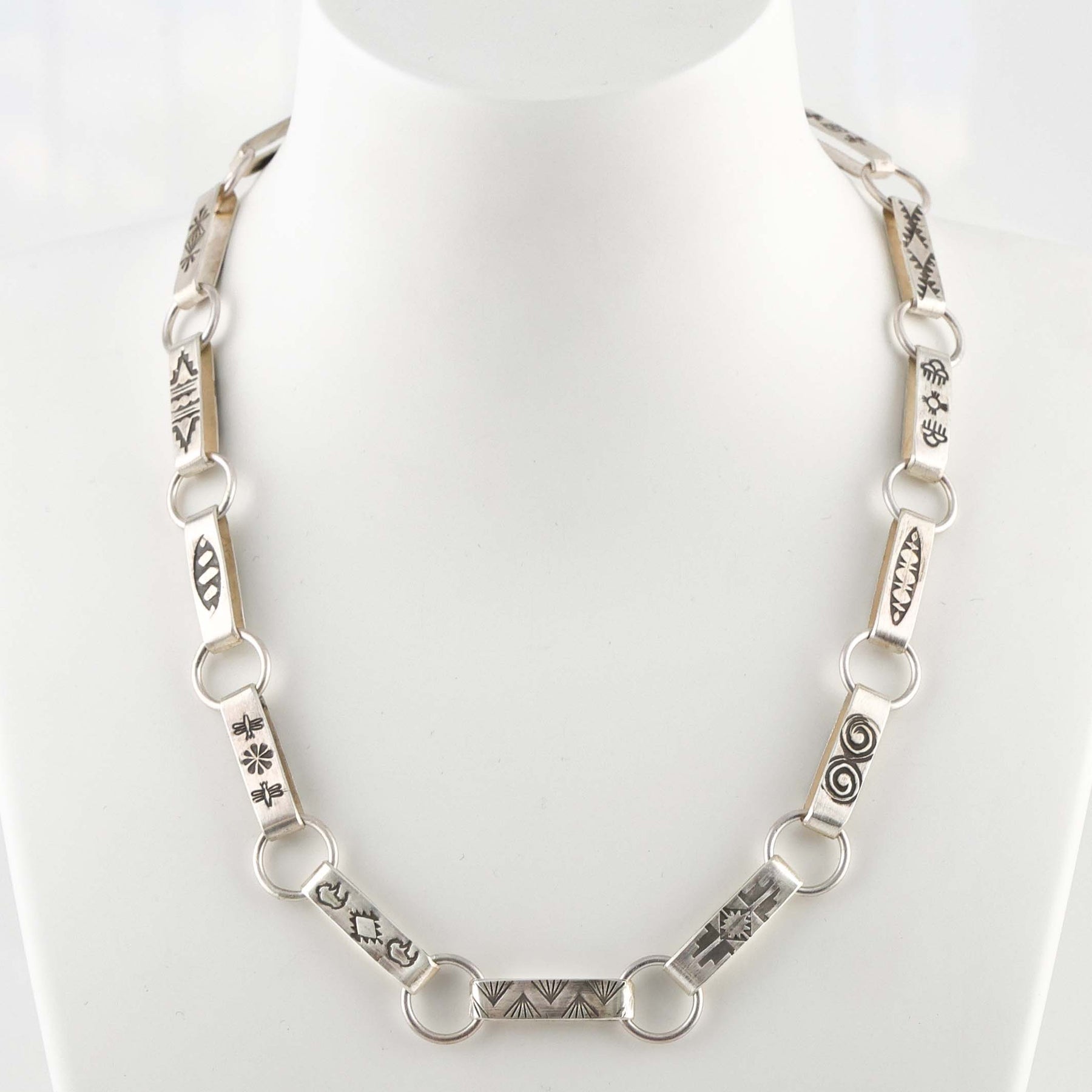 Handmade Sterling Silver Link Necklace with Various Hand-Stamped Designs.