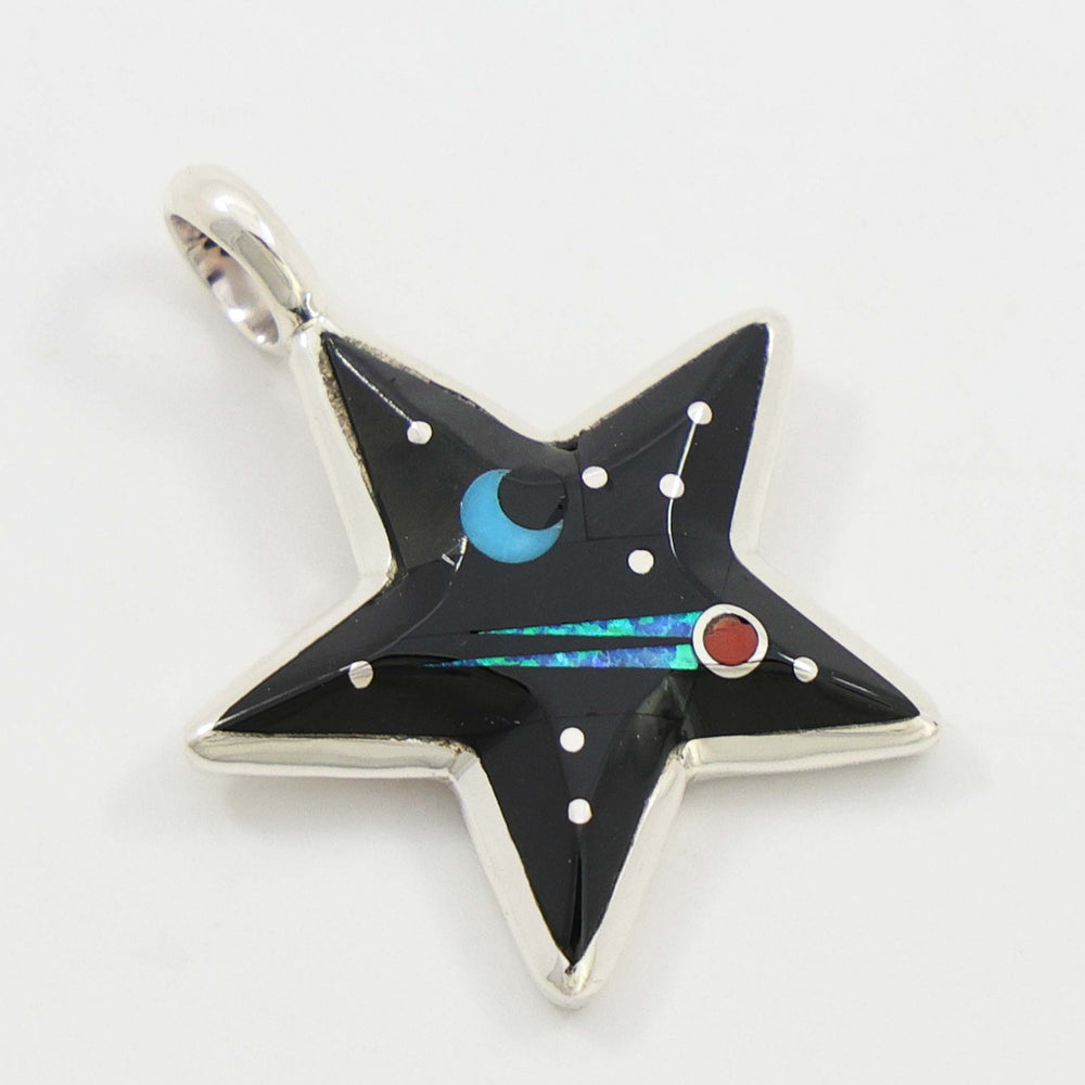 Sterling Silver Star Pendant with Inlaid Jet, Turquoise, Coral, and Lab Opal.