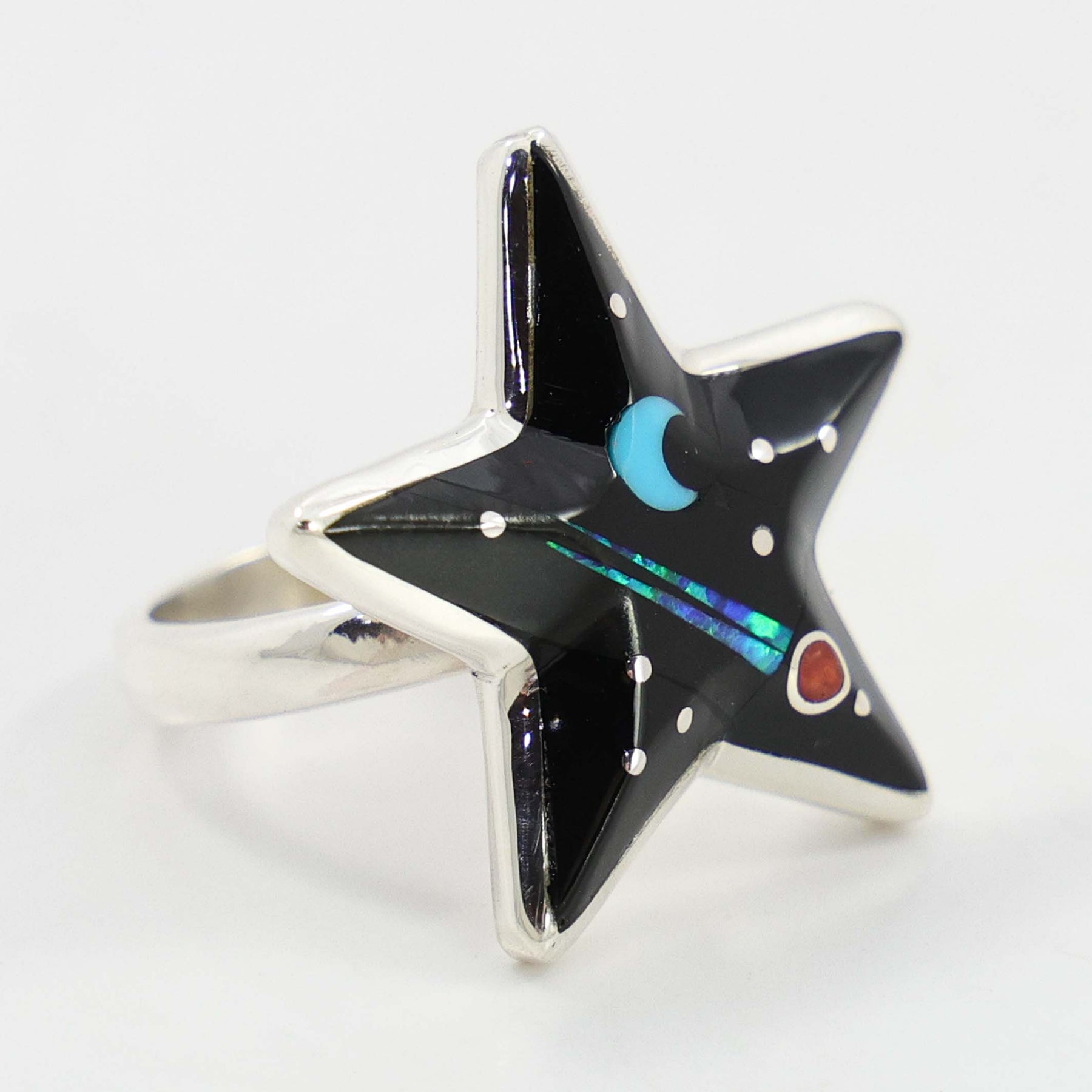 Sterling Silver Star Ring with Inlaid Jet, Turquoise, Coral, and Lab Opal.