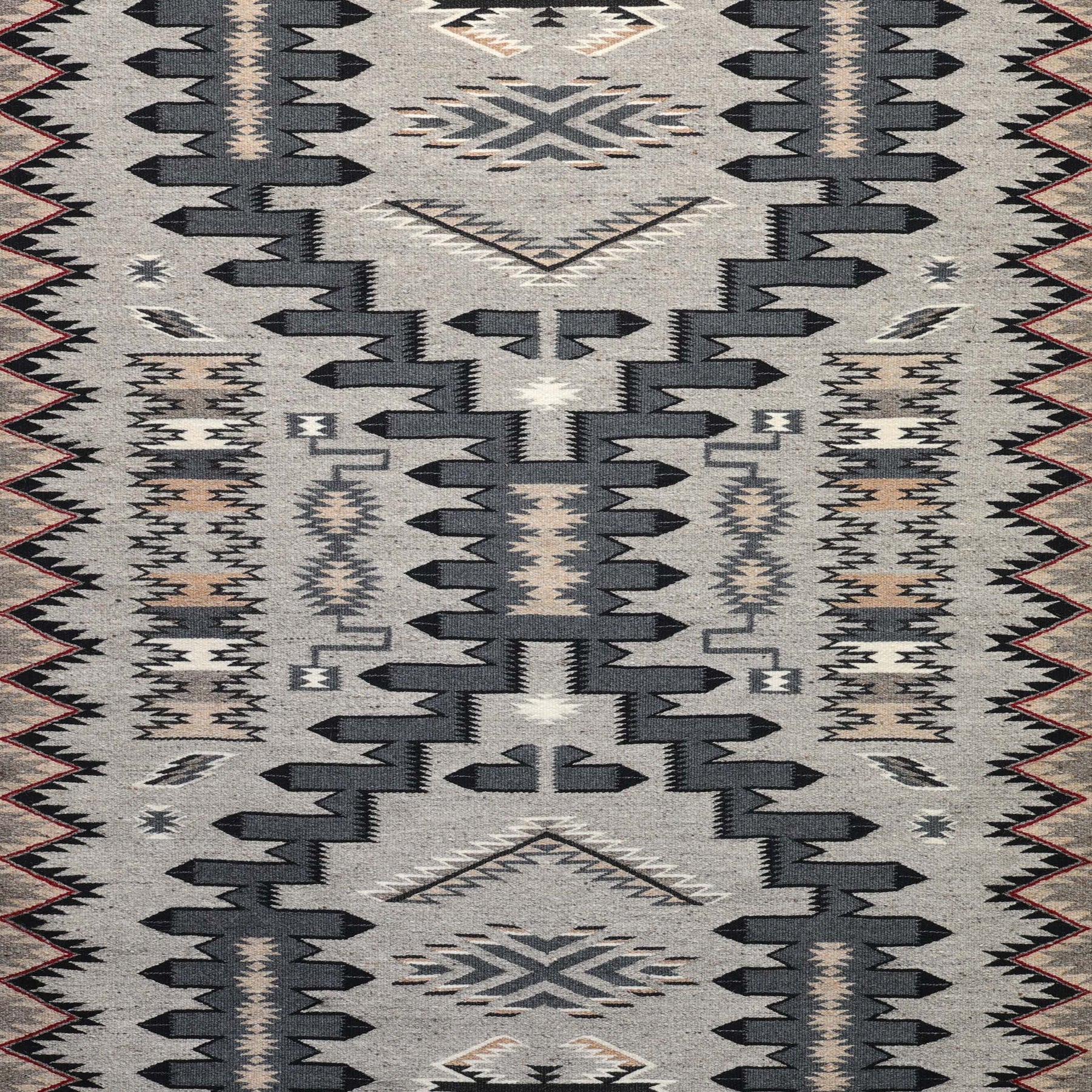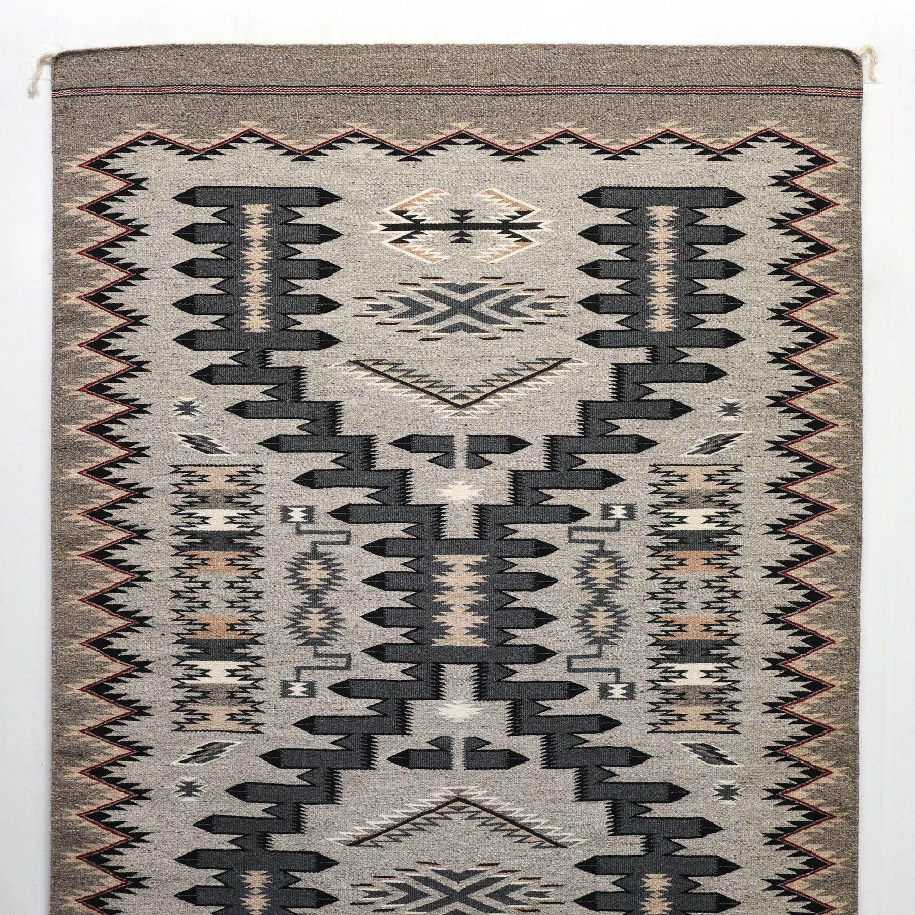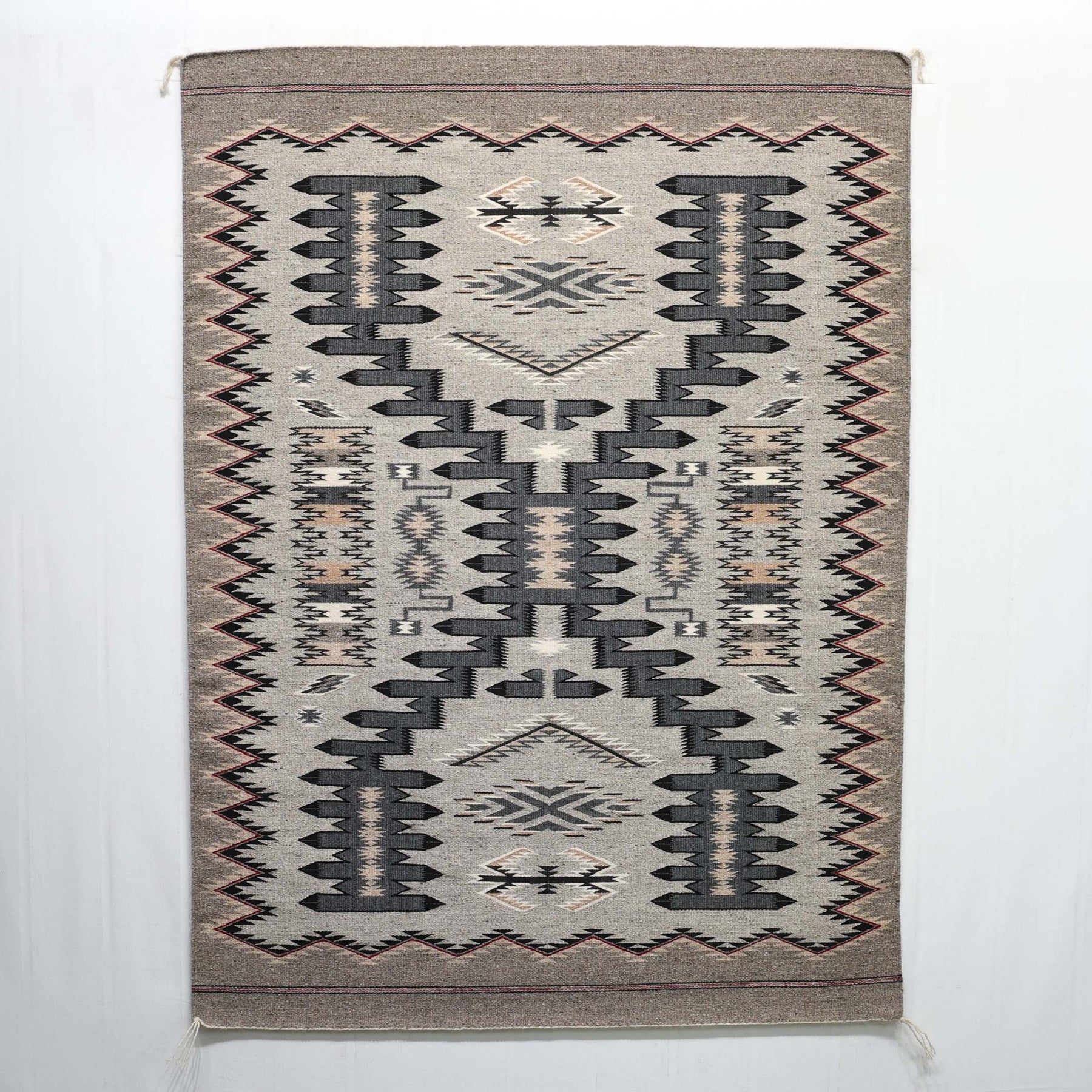 A classic Storm Pattern weaving by accomplished Navajo artist Louise McCabe, handwoven with processed wool in subtle natural tones of gray, beige, cream, black, and soft browns, this piece highlights precise geometric forms, including stylized water bugs, feathers, and arrows, all rendered with exceptional tightness and detail.