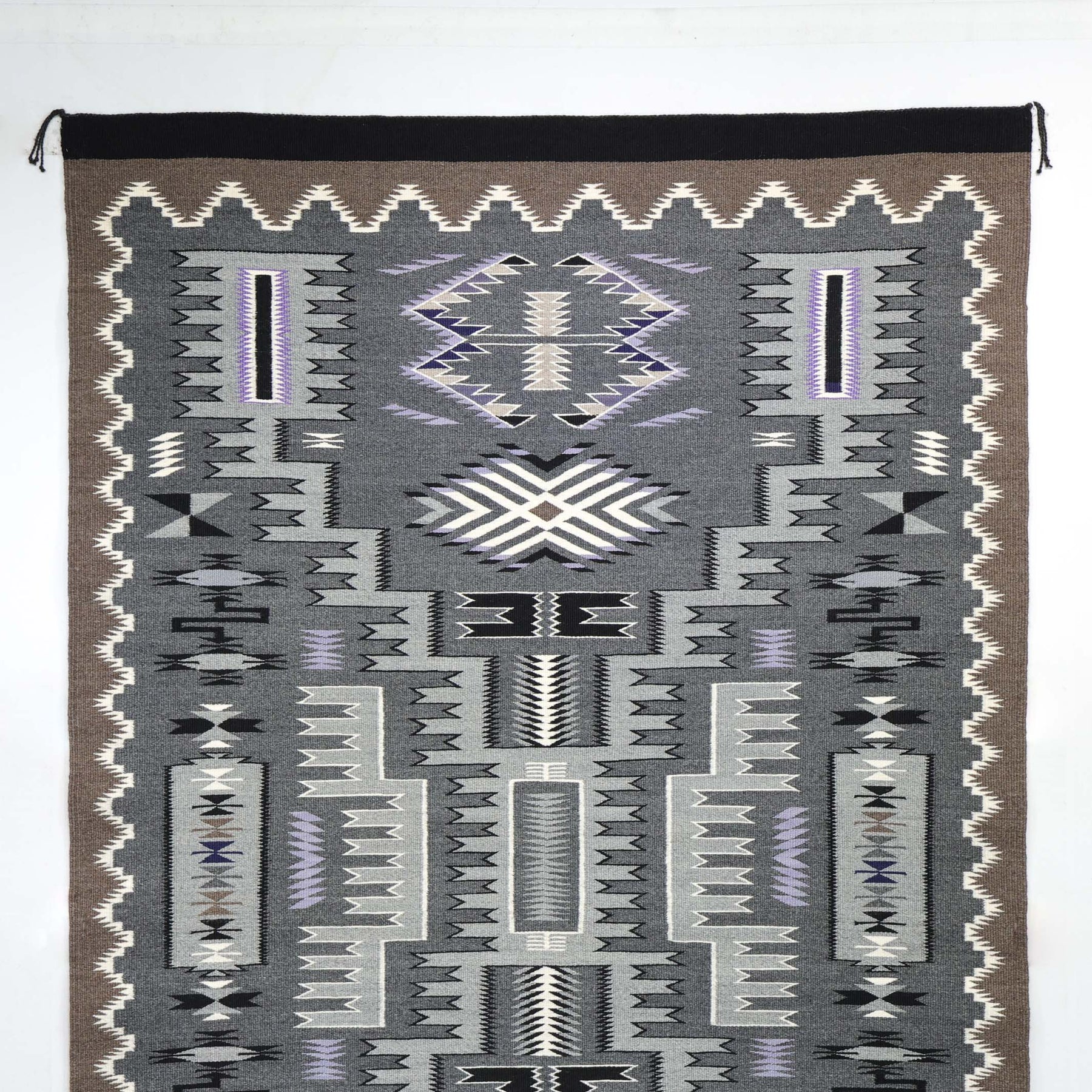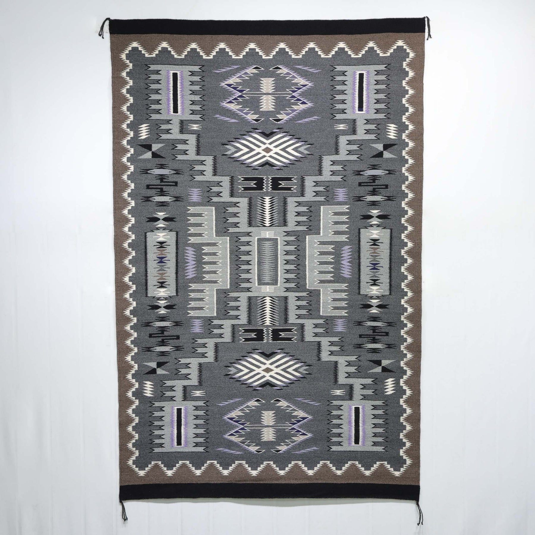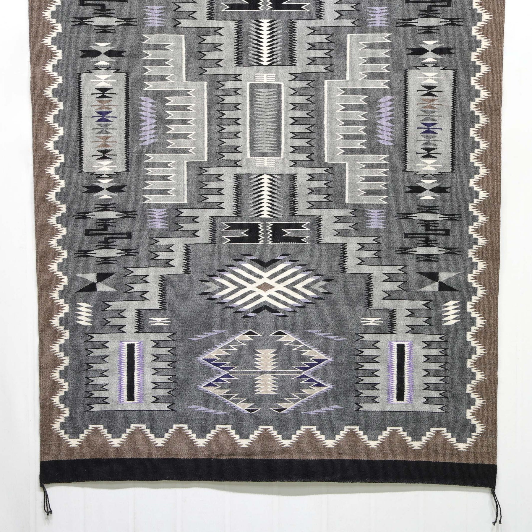 This elegant Storm Pattern weaving by accomplished Navajo artist Susie Slowtalker, handwoven with processed wool using only natural undyed colors in shades of charcoal gray, soft lavender, cream, taupe, black, and subtle browns, this piece demonstrates a tight weave, crisp edges, and refined tonal harmony that highlight the weaver's mastery.