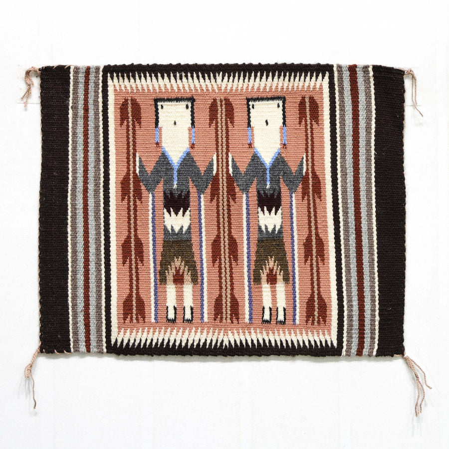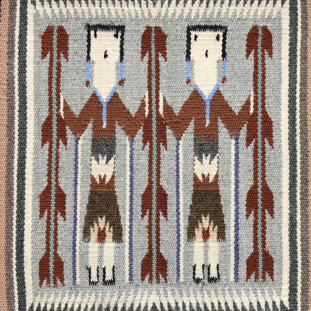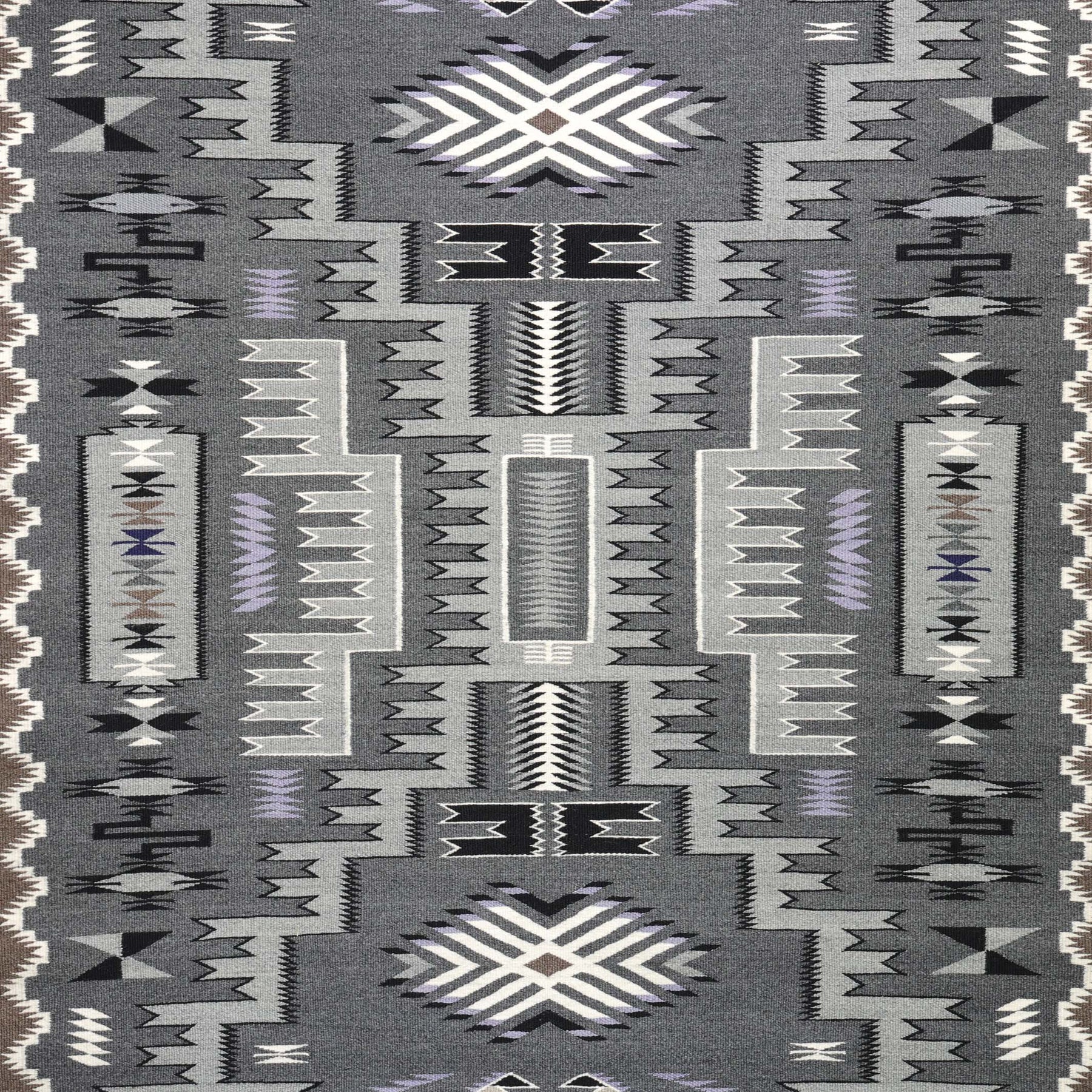 This elegant Storm Pattern weaving by accomplished Navajo artist Susie Slowtalker, handwoven with processed wool using only natural undyed colors in shades of charcoal gray, soft lavender, cream, taupe, black, and subtle browns, this piece demonstrates a tight weave, crisp edges, and refined tonal harmony that highlight the weaver's mastery.