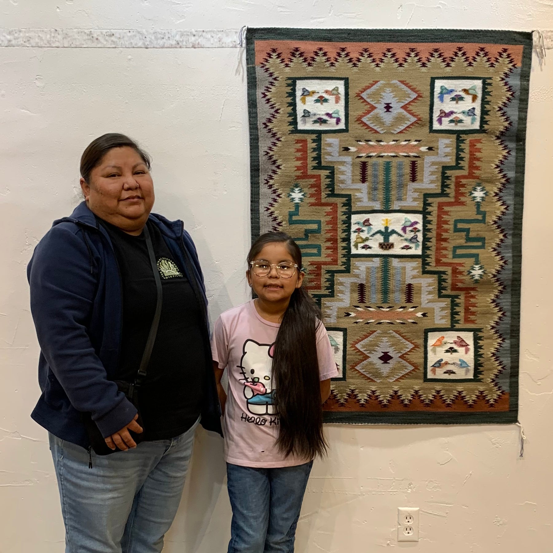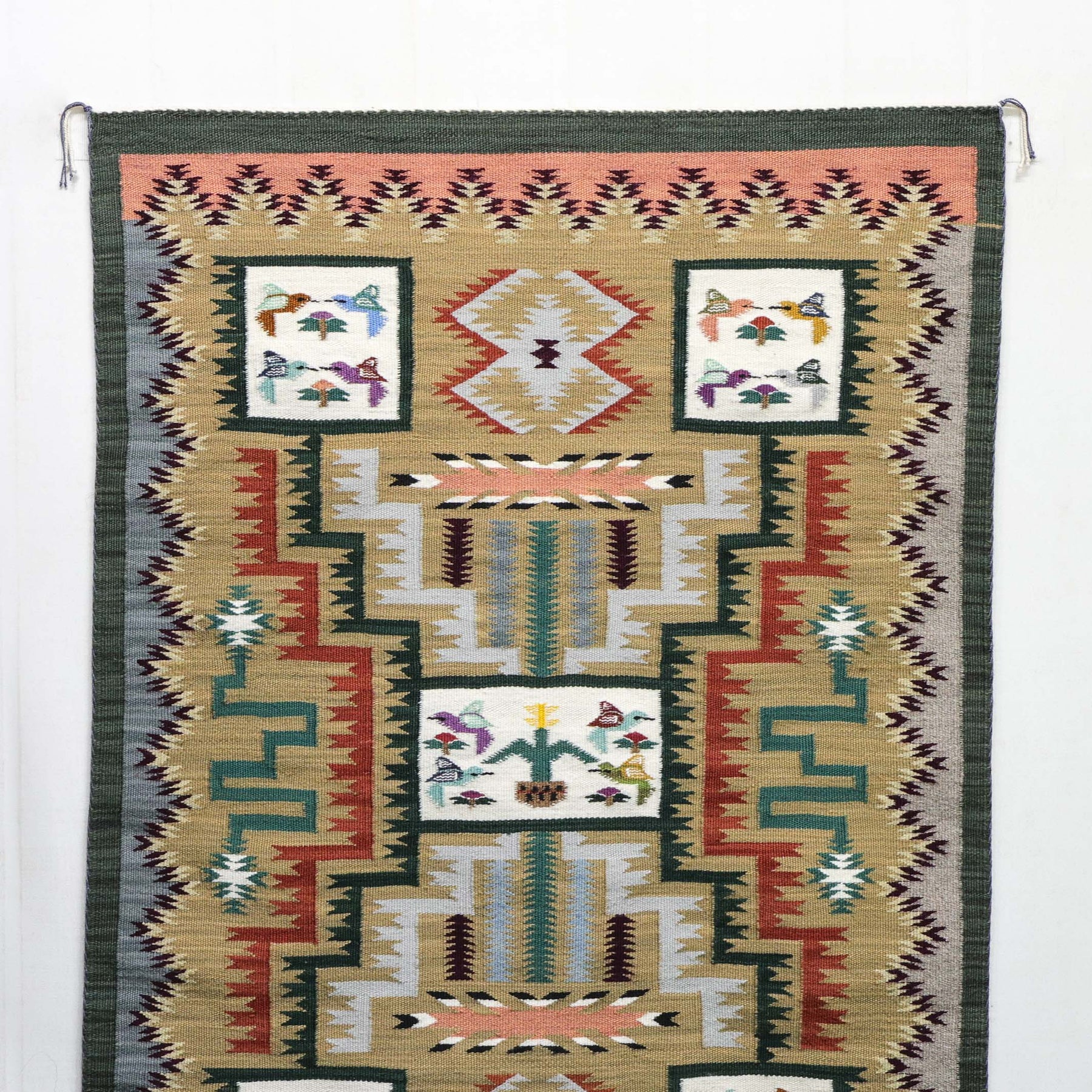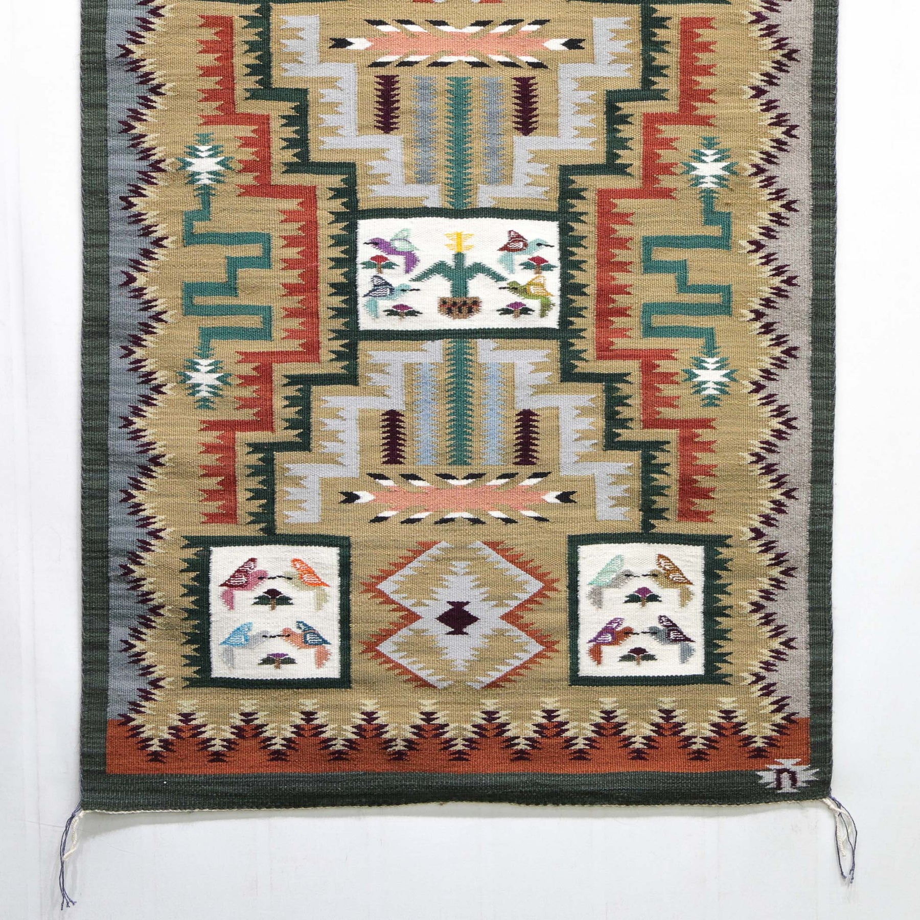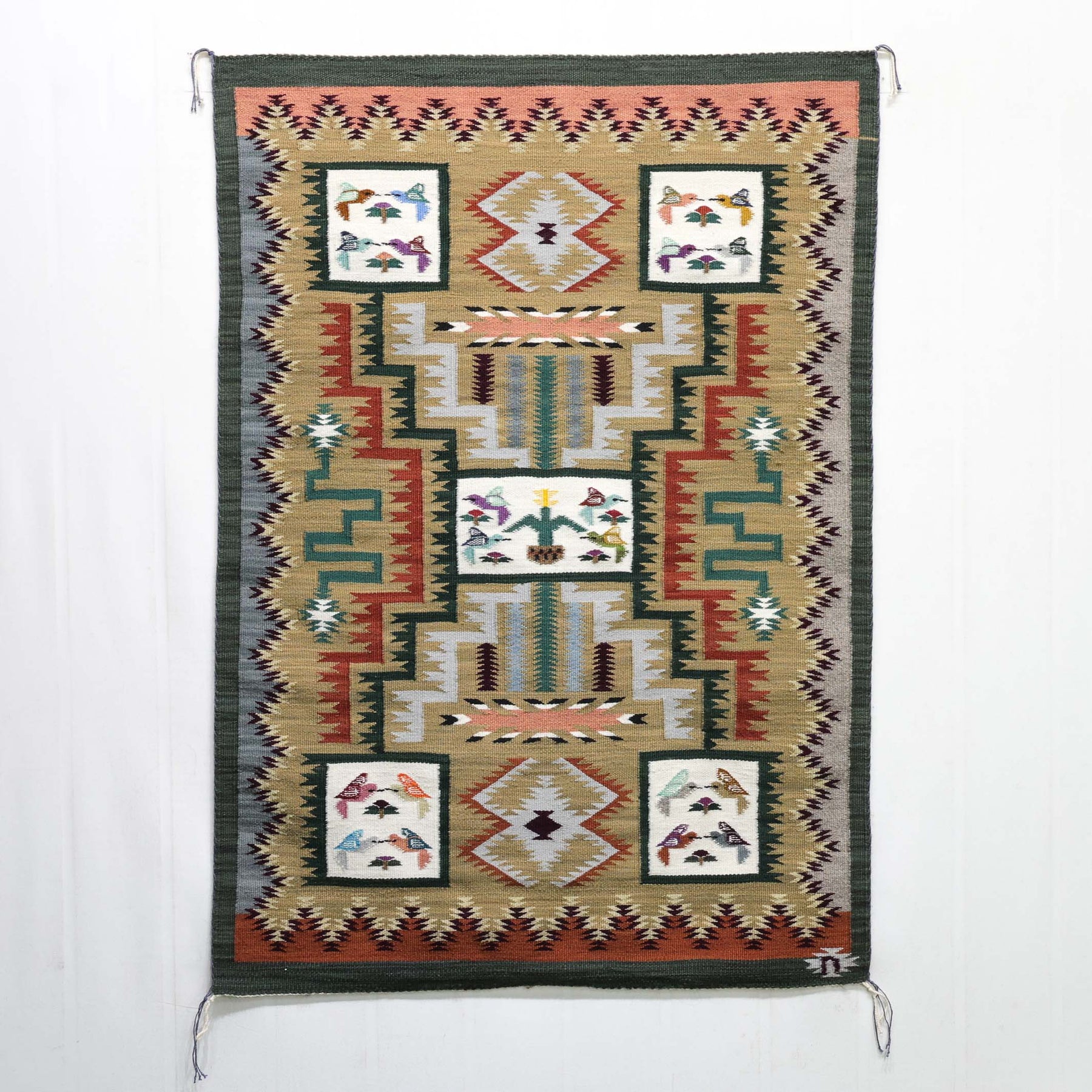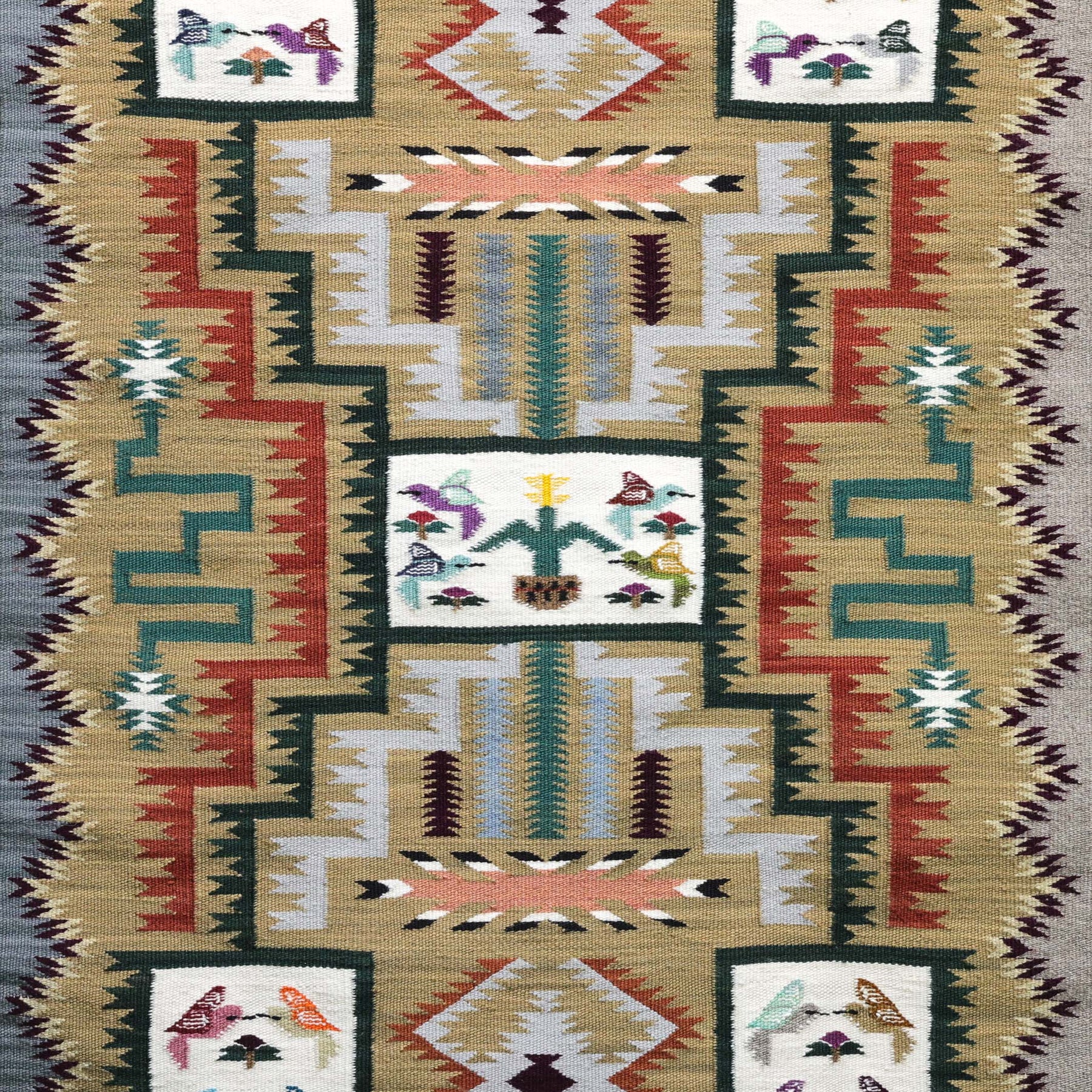 Unique Navajo Storm Pattern Weaving by Nadina Nez, daughter of notable weavers, Bruce and Nadine Nez. This weaving features the traditional storm pattern design with special details, including a tree of life cornstalk in the center and birds in each of the four corners. Handwoven with handspun wool using rich vegetal dyes.