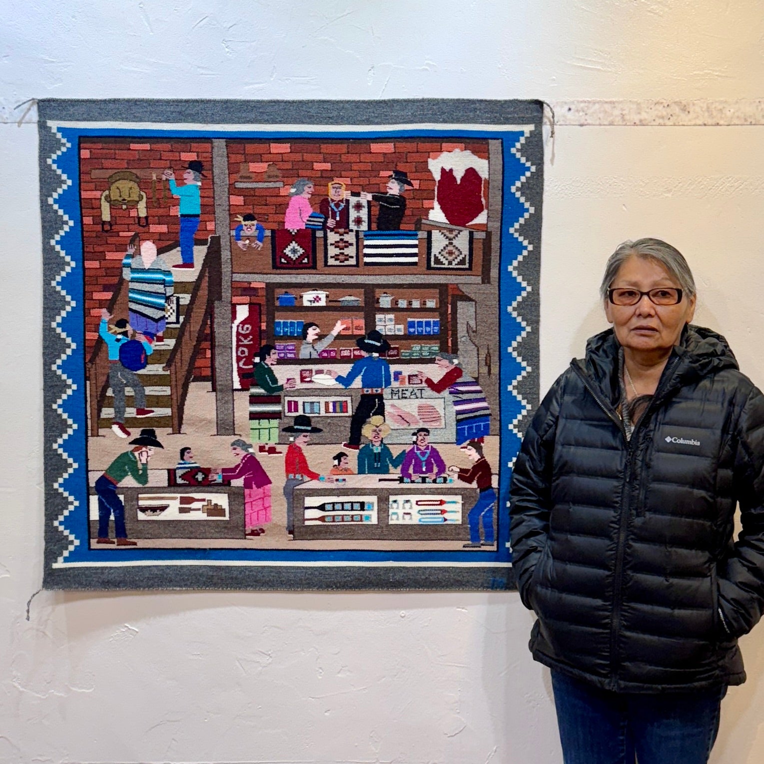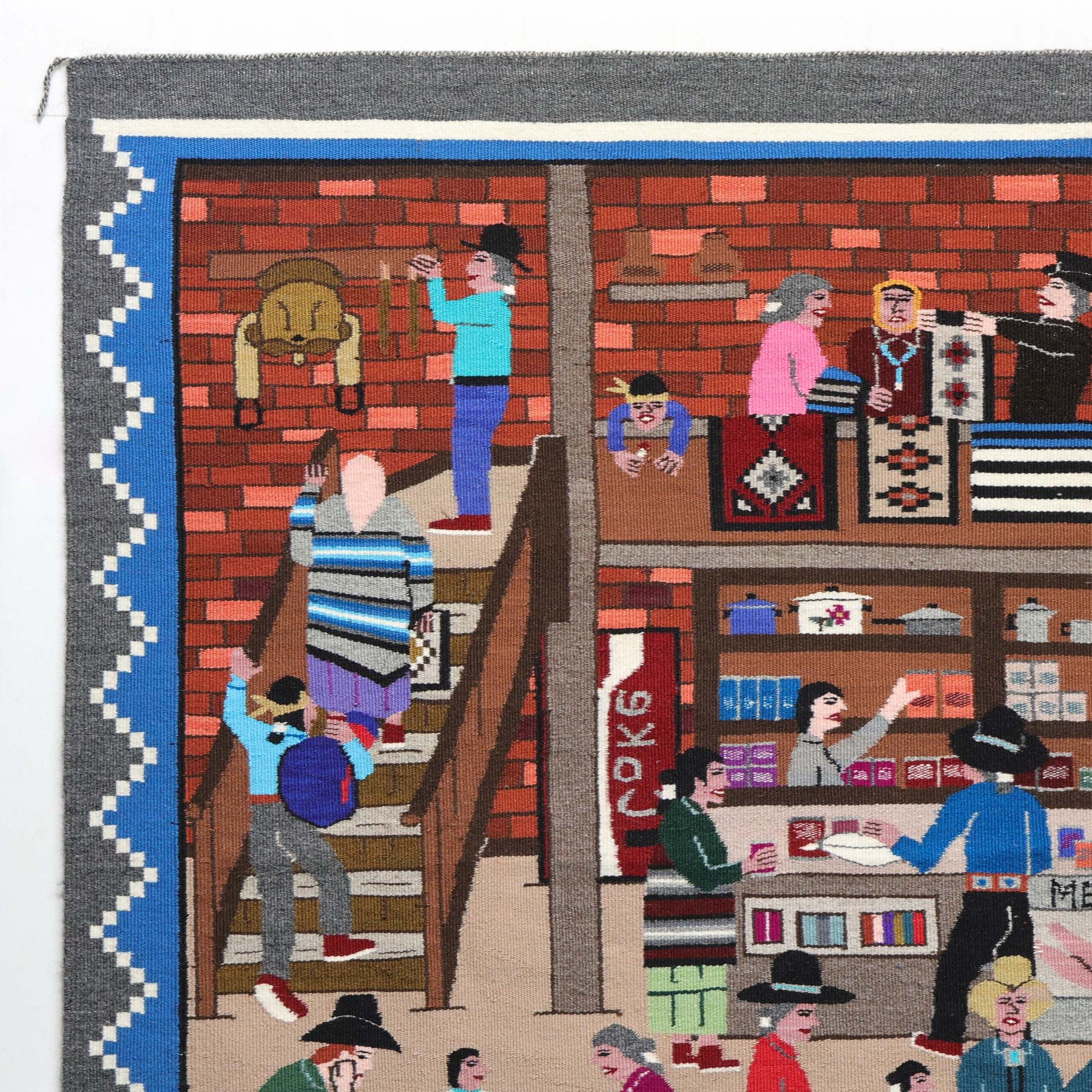 In this piece, Navajo vendors are shown selling jewelry and rugs inside the trading post, set against a meticulously rendered brick background that adds depth and texture to the building's architecture, all rendered with remarkable precision and detail. A clever detail is the reversed spelling on the "Coke" machine and "Meat" sign, intentionally allowing one to read correctly from one side of the weaving and the other to read correctly from the opposite side.
