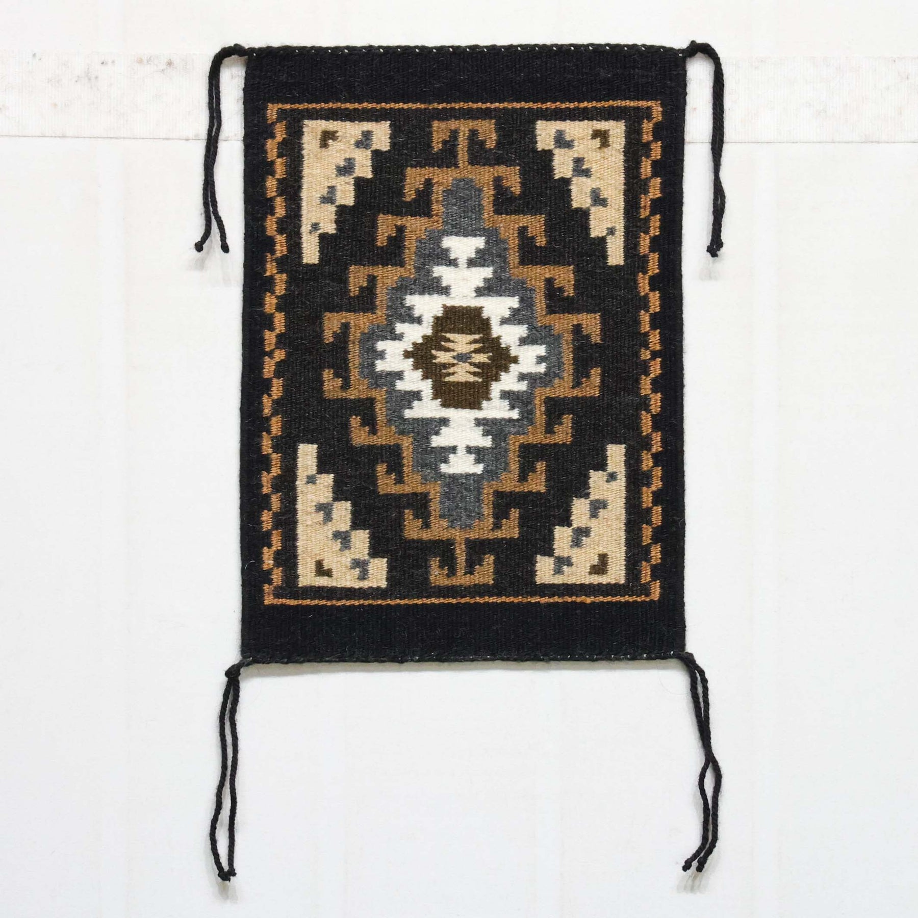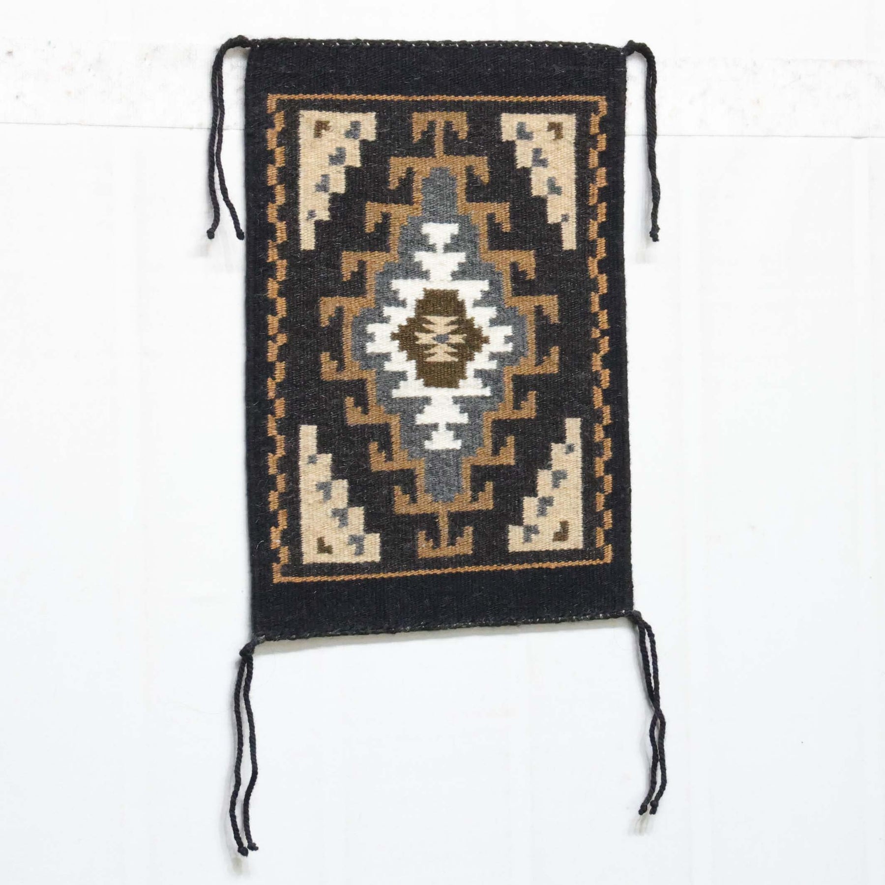 Handwoven Navajo Weaving in the Two Grey Hills Regional Style with Light Brown Accents on a Black Background.
