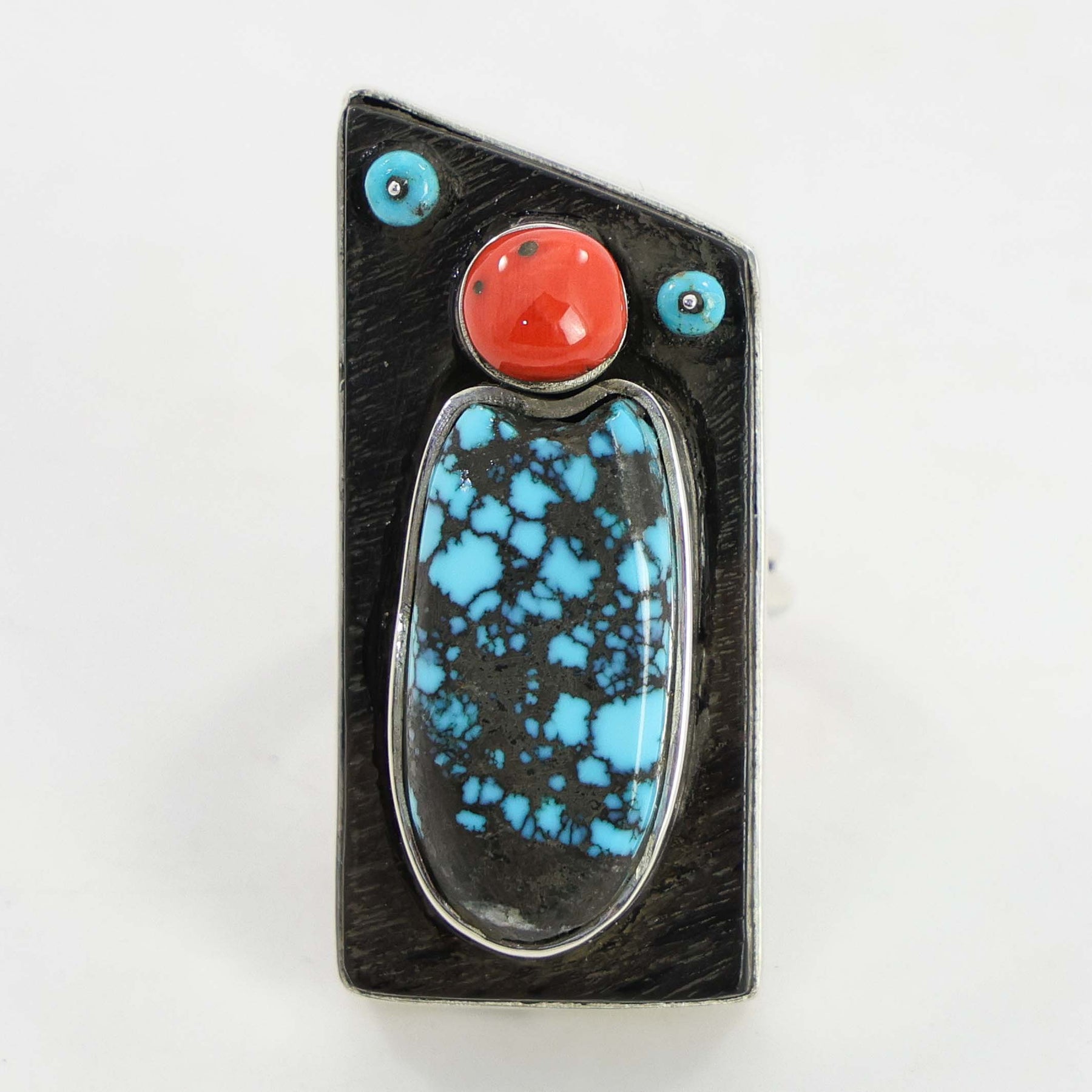Sterling Silver Ring with a Yei (Navajo Healing Spirit) Design using Natural Black Widow Turquoise from Nevada, Ebony, and Coral.