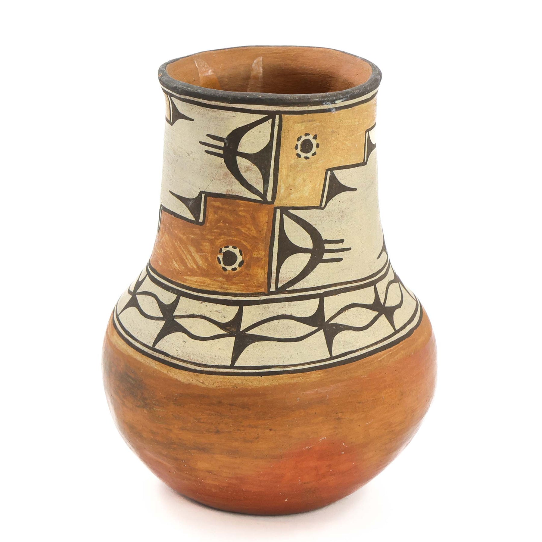 1940s Hand-Coiled and Traditionally Fired Zia Olla with Hand-Painted Polychrome Design. This piece of pottery is in excellent overall condition.