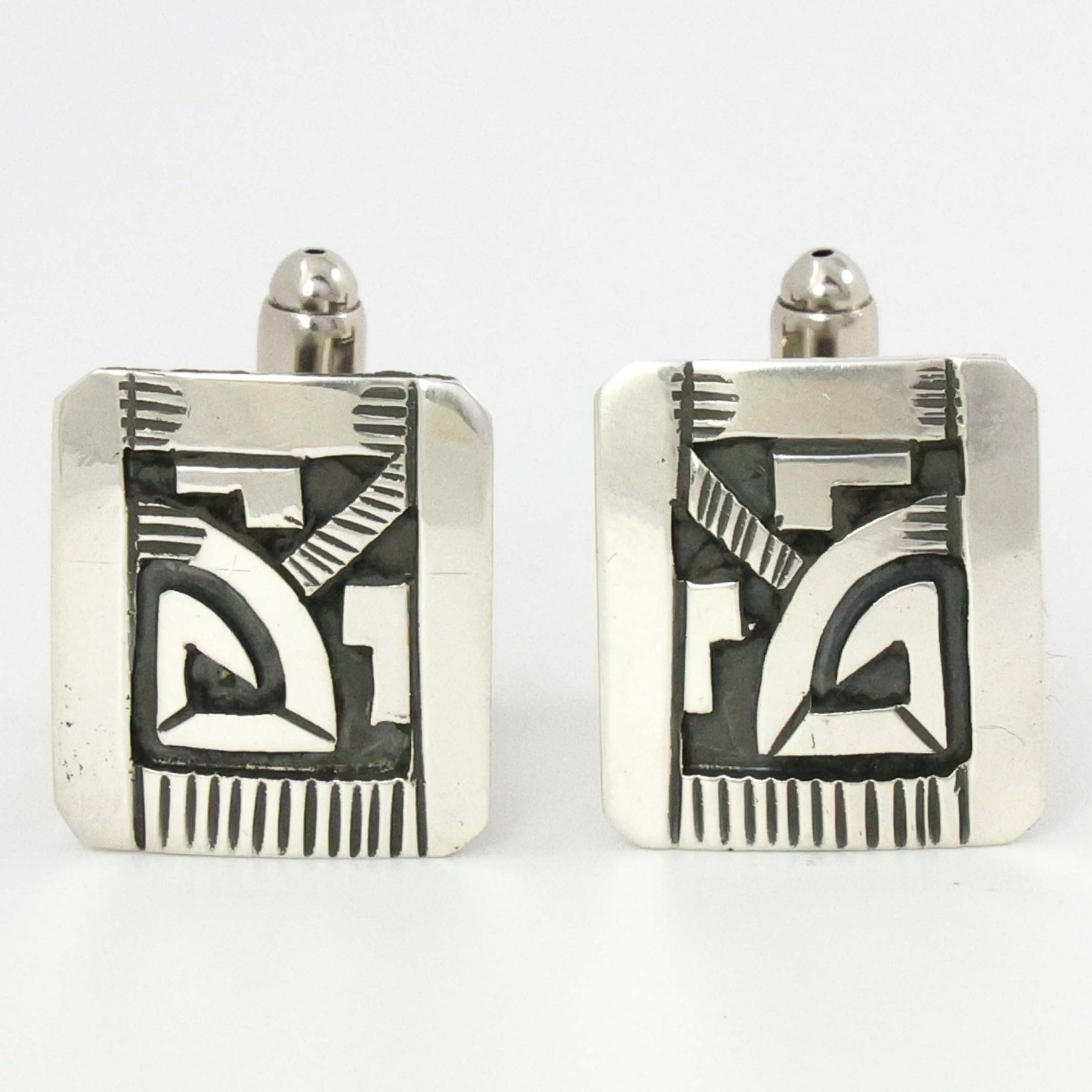 Sterling Silver Cuff Links with Navajo Overlaid Design Elements.
