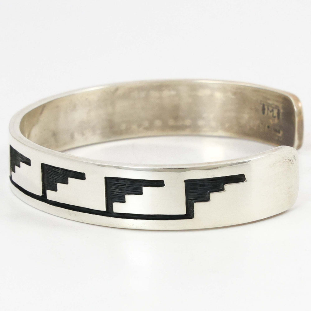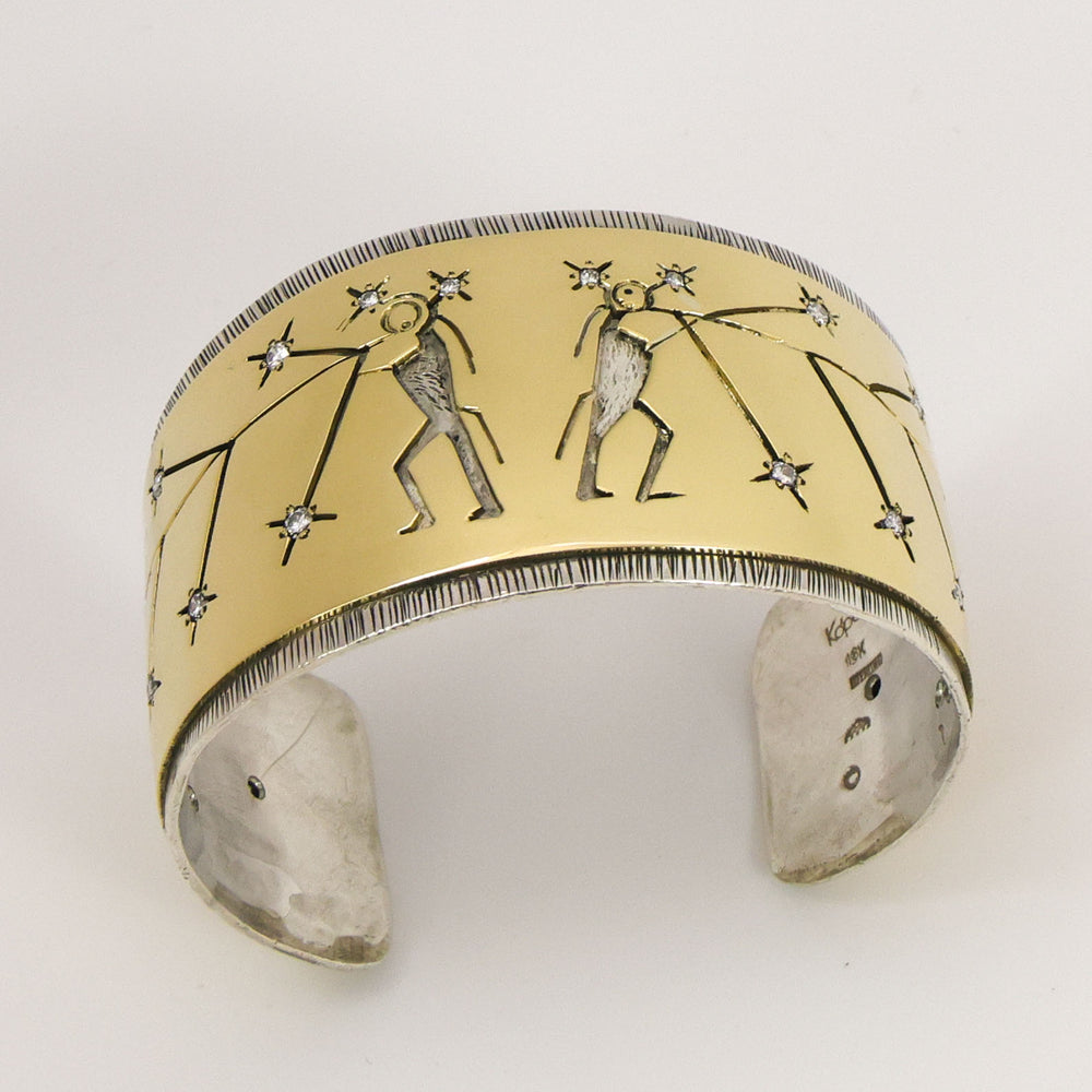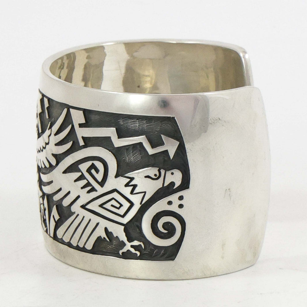 Overlay describes a piece of silver with a design cut out of it – a negative design – laid over a second piece of silver or gold and soldered together. First, the artist carefully cuts a design out of silver, and keeps the part that is leftover. The designs must be carefully sawed out, making this the most painstaking and intricate step in the whole process. This piece of silver is then soldered onto a sheet of plain silver and the inside of the design (the cutout area) is oxidized to show up black beneath the polished silver layer.