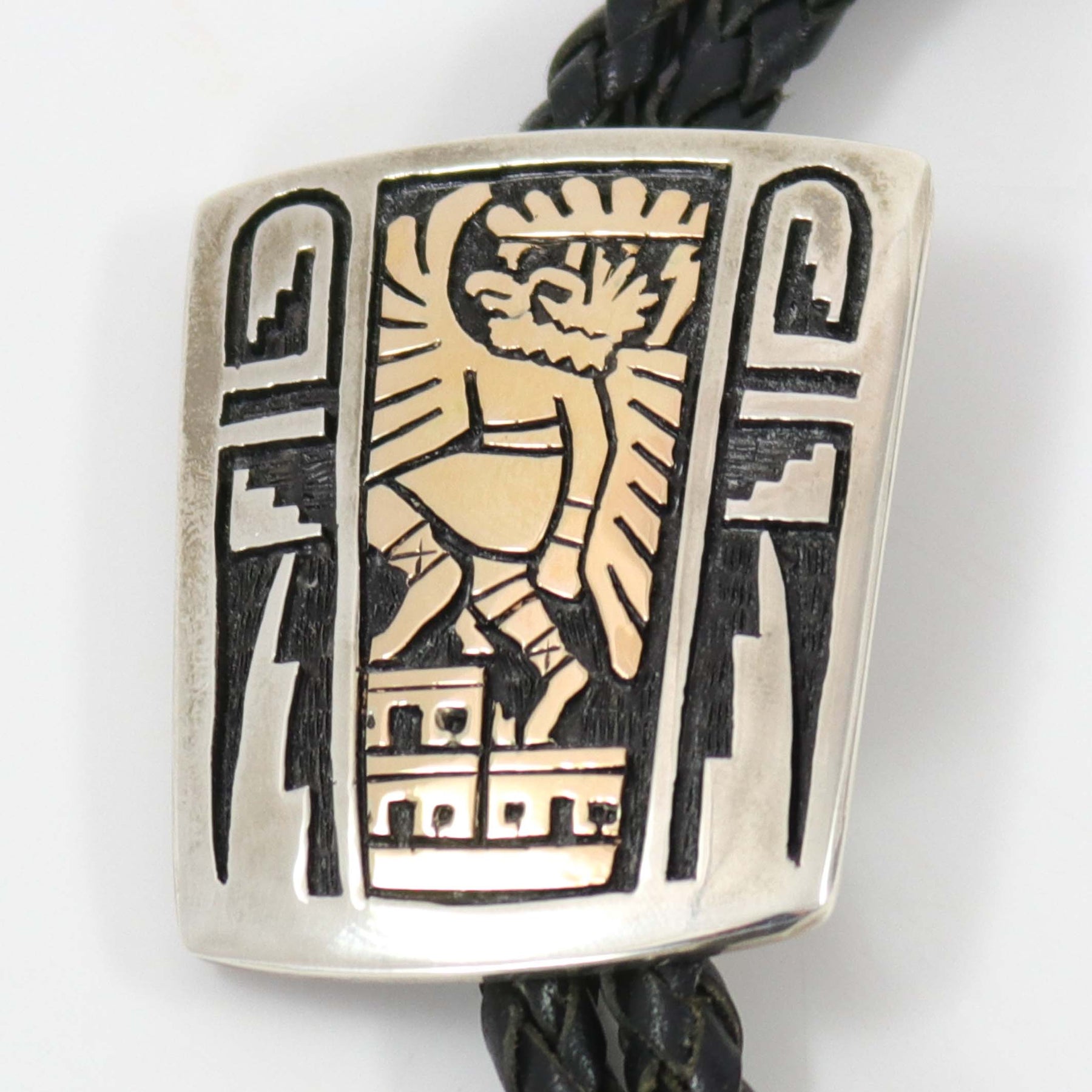 14k Gold on Sterling Silver Bola Tie featuring a Hopi Overlaid Design of an Eagle Dancer Kachina and Pueblo Scene, crafted in the 2010s by Hopi artist Watson Honanie, who passed away in 2023.