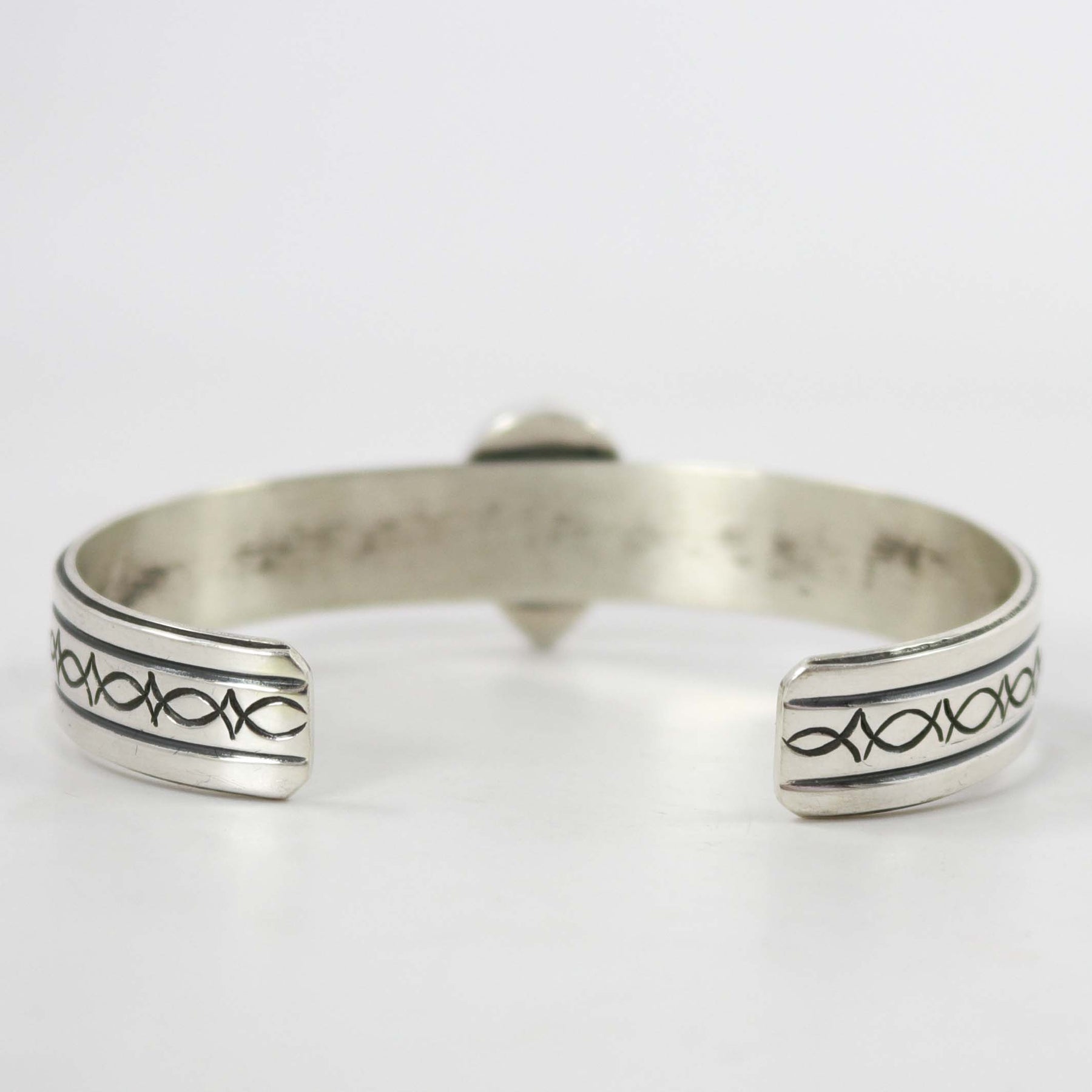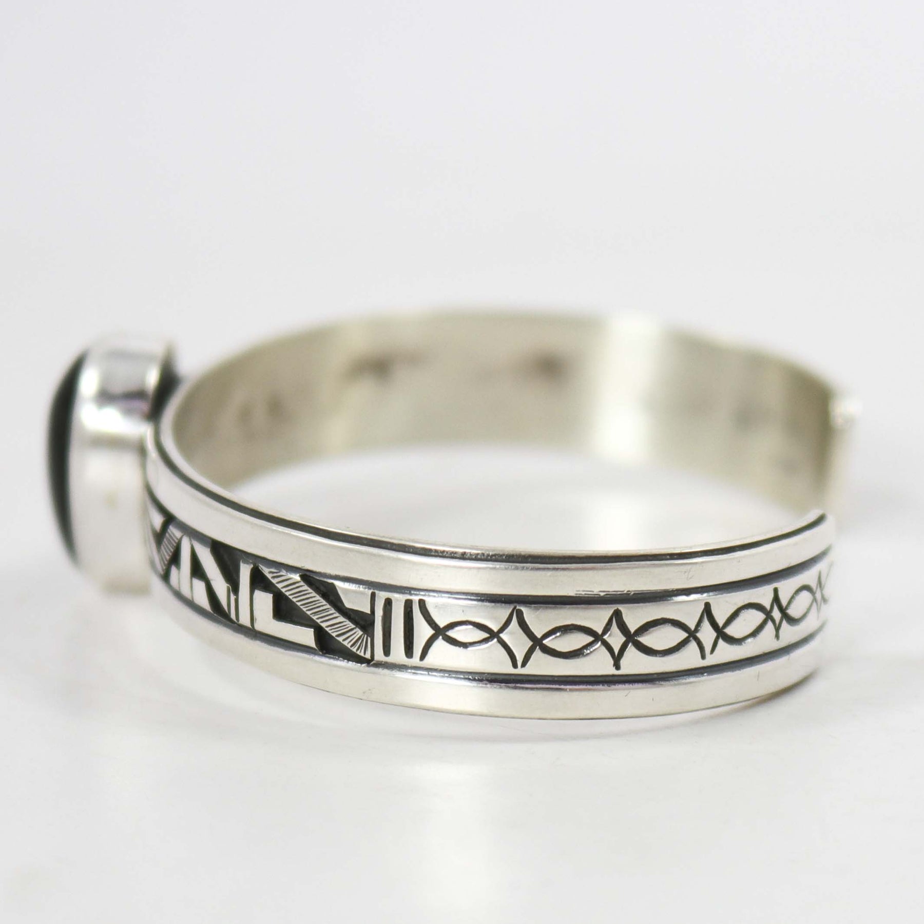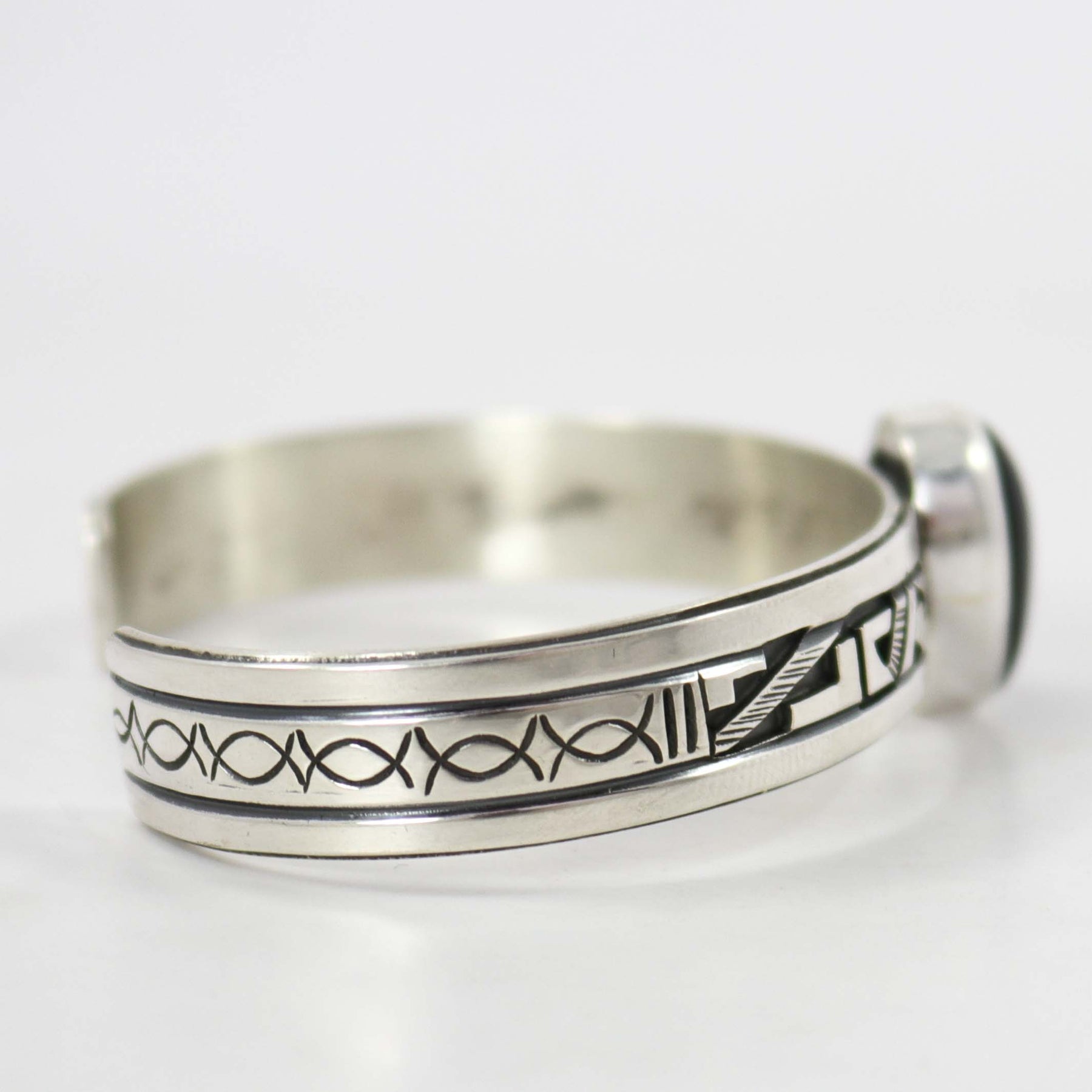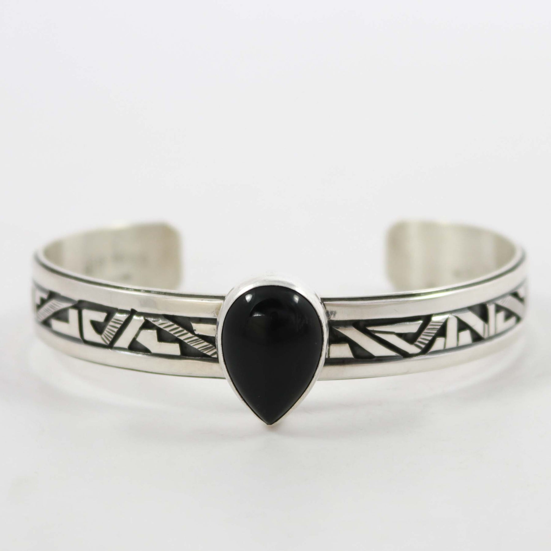 Sterling Silver Cuff Bracelet with Overlaid Designs and set with Onyx.