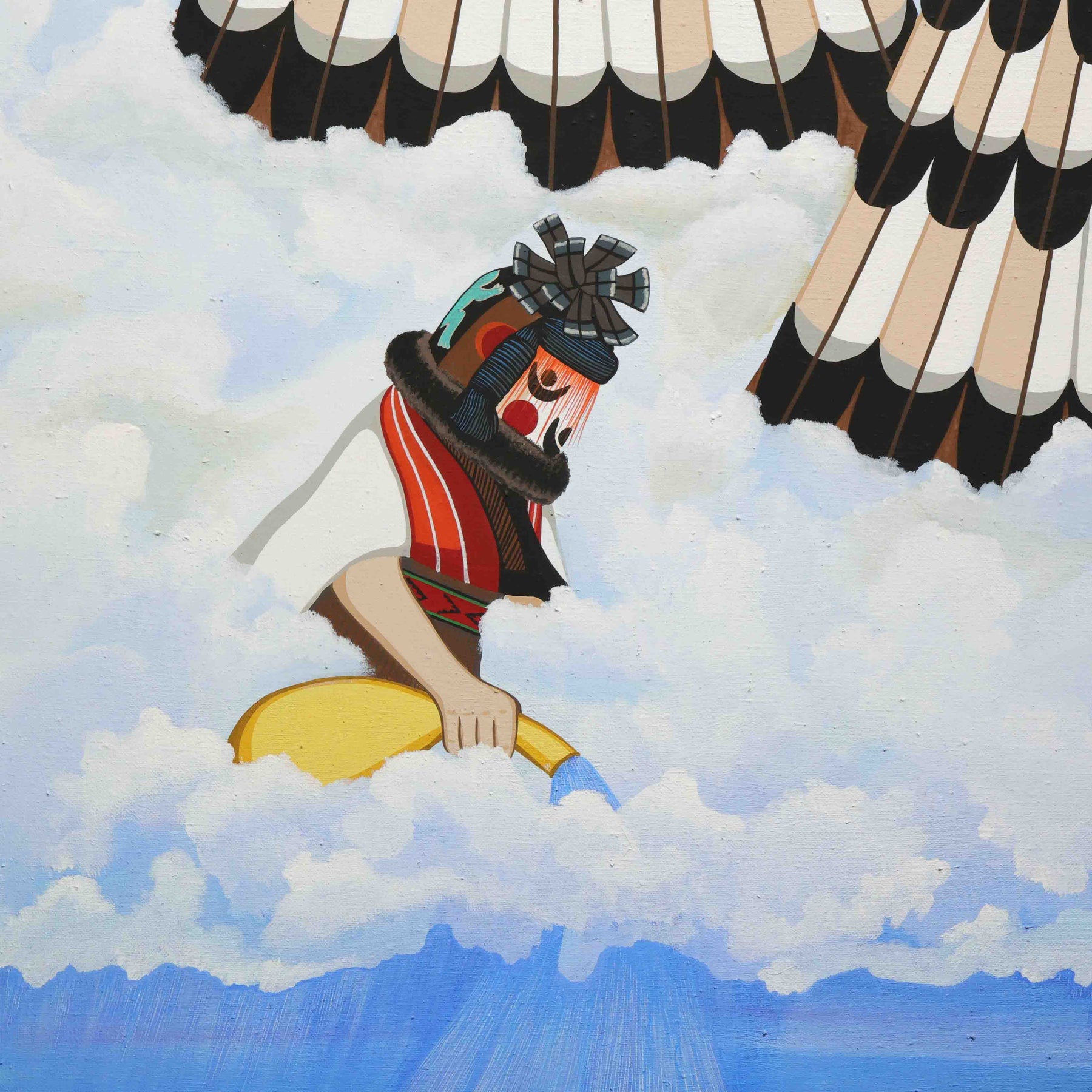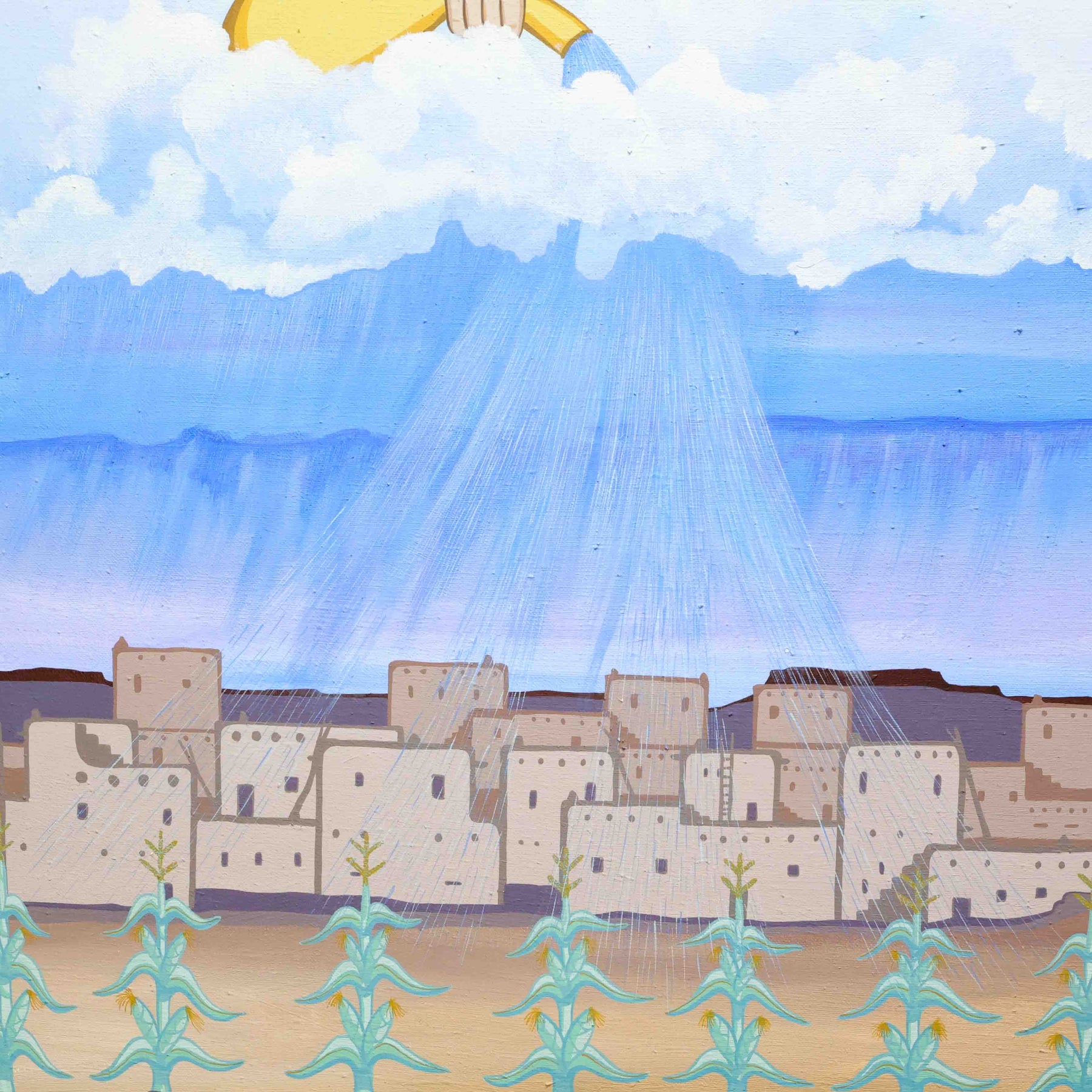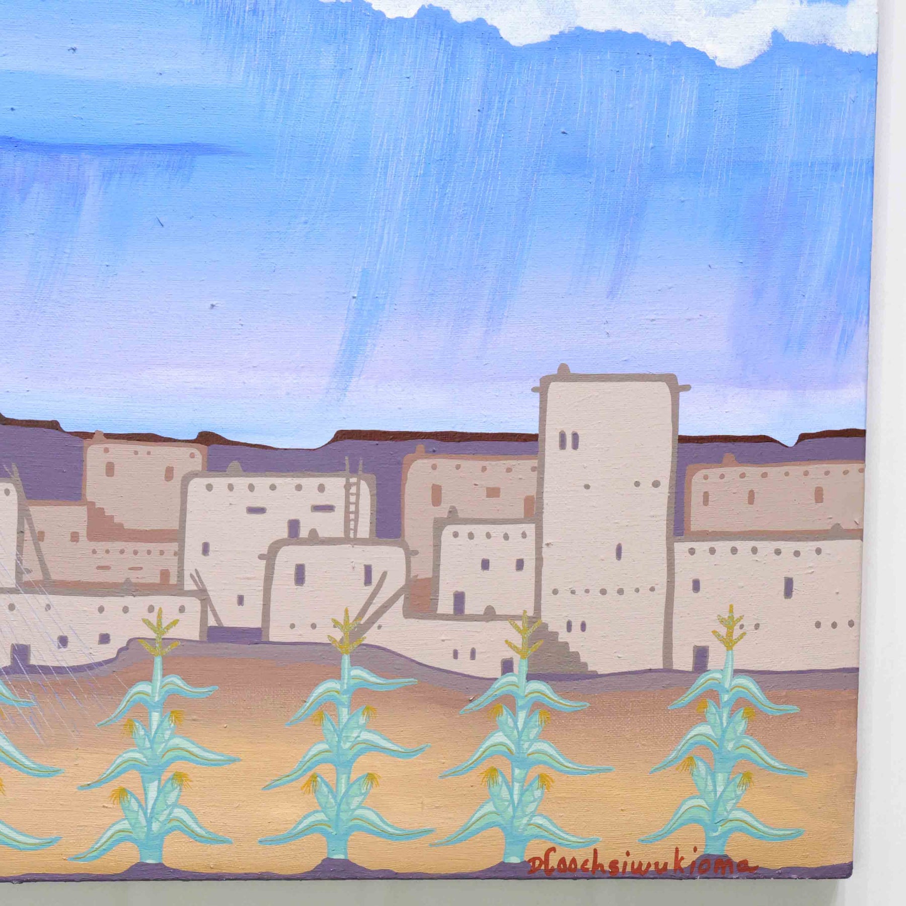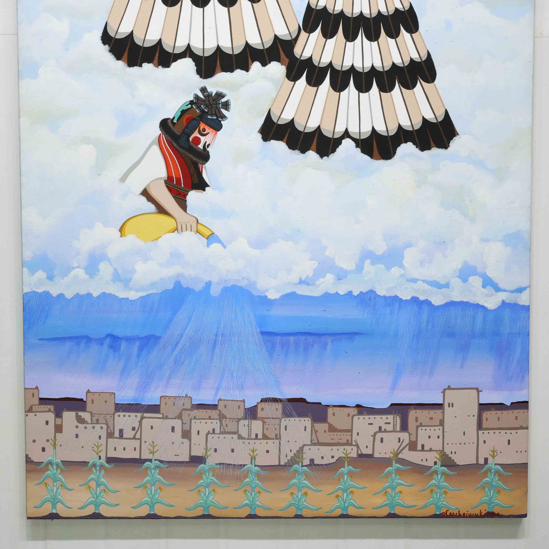 Acrylic on canvas painting by Hopi artist Delbridge Honanie depicting Shungopavi Village on Second Mesa with corn plants in the foreground. Above the pueblo, Hahai Wuhti (Grandmother Kachina) appears in the clouds, pouring water from a gourd to bring rain and blessings to the people. Flanking her are a male and female pair of Shalako Kachinas, their tall headdresses symbolizing rain clouds, with feathers radiating outward as prayer feathers. Together, these kachinas represent prayers for more rain and snow to nourish the crops and sustain the community.