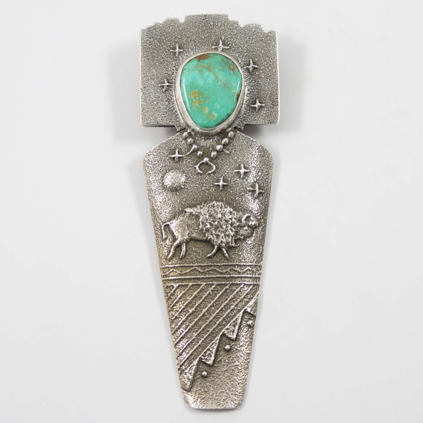 Tufa Cast Sterling Maiden Pin and Pendant with a Buffalo Design and set with Natural Royston Turquoise from Nevada.
