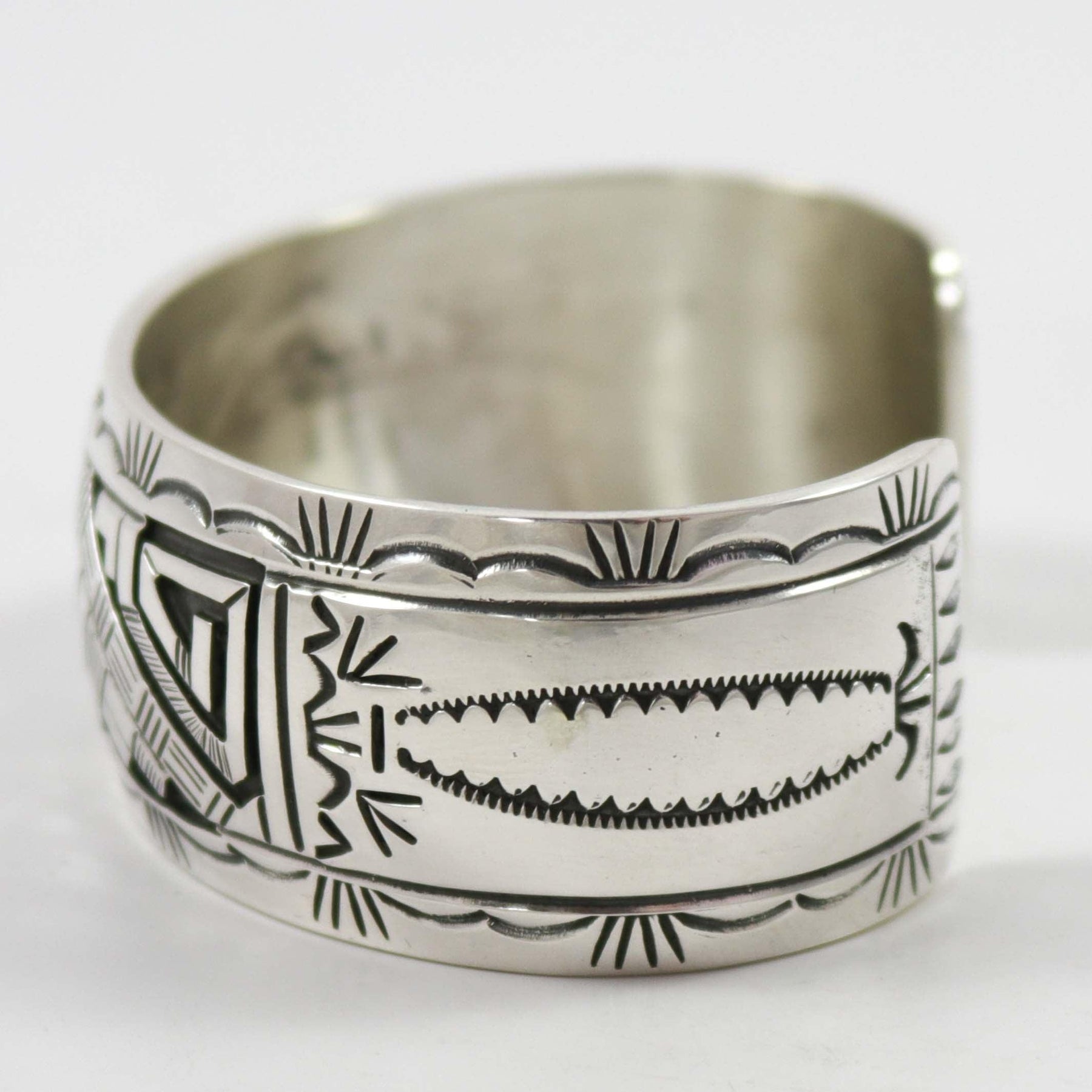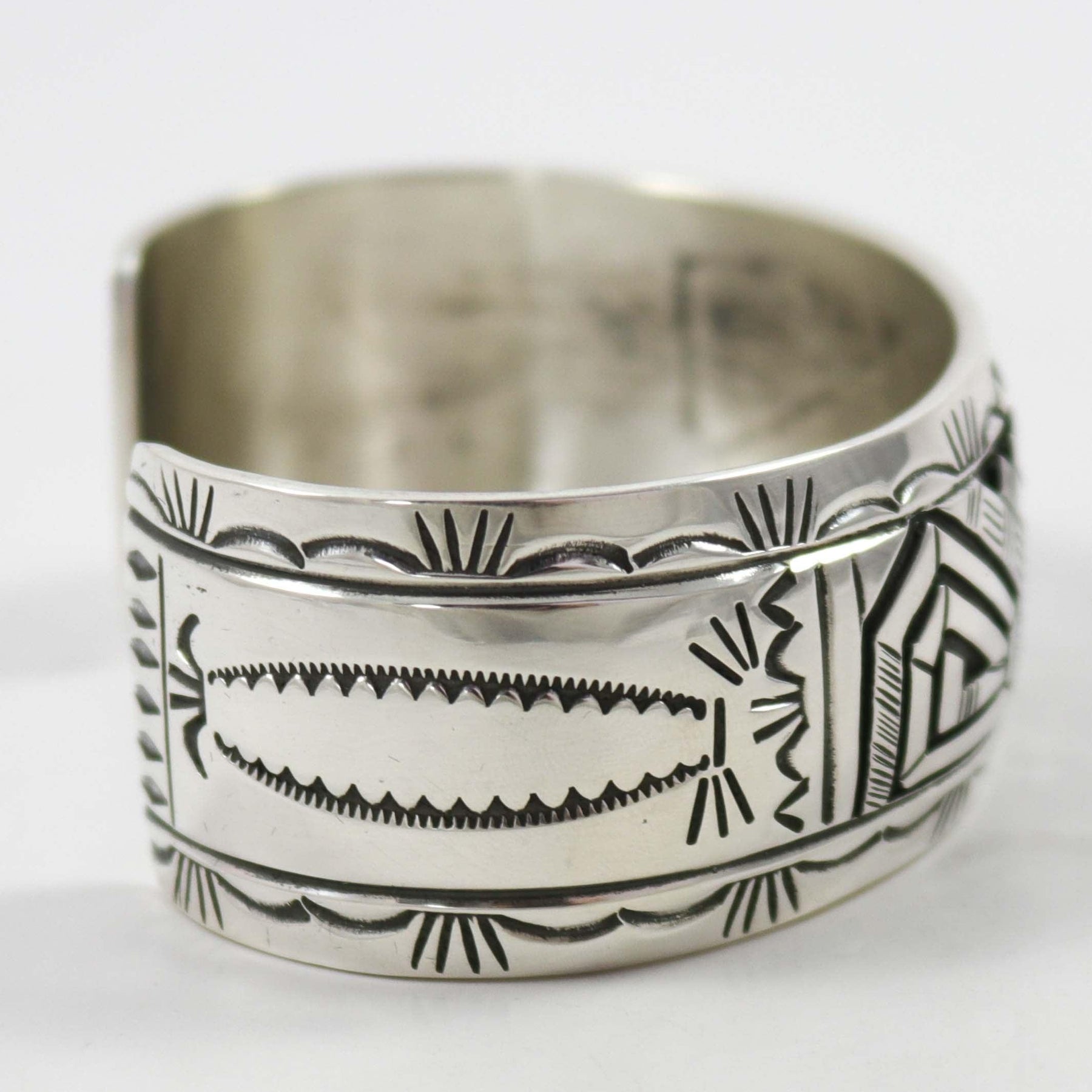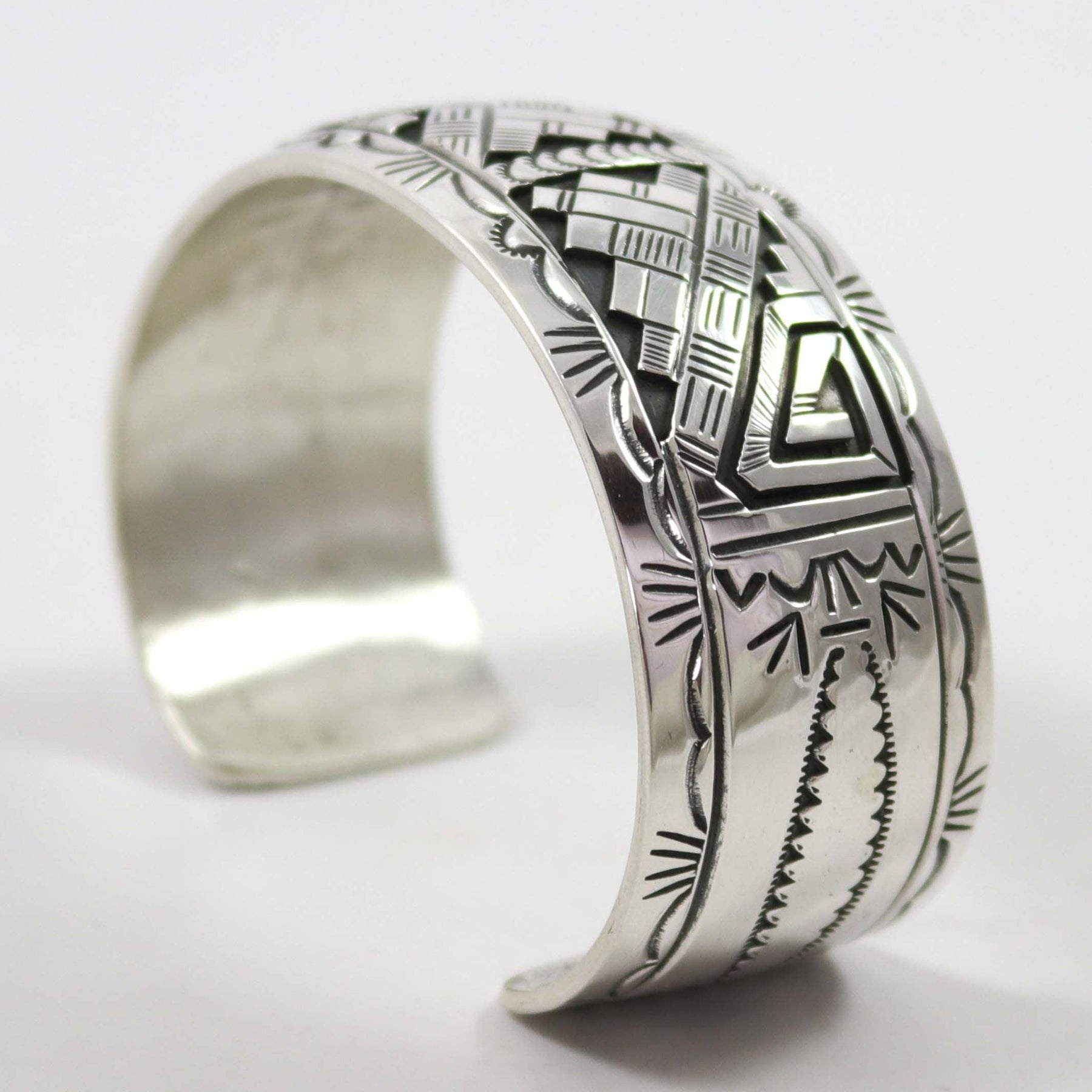 Sterling Silver Cuff Bracelet with Hand Stamped and Overlaid Geometric Designs.