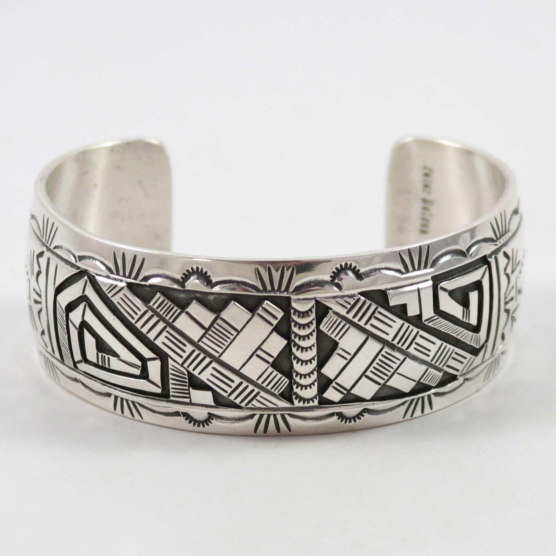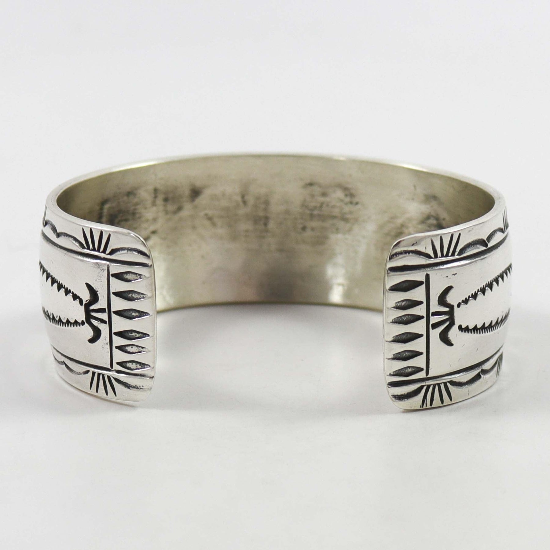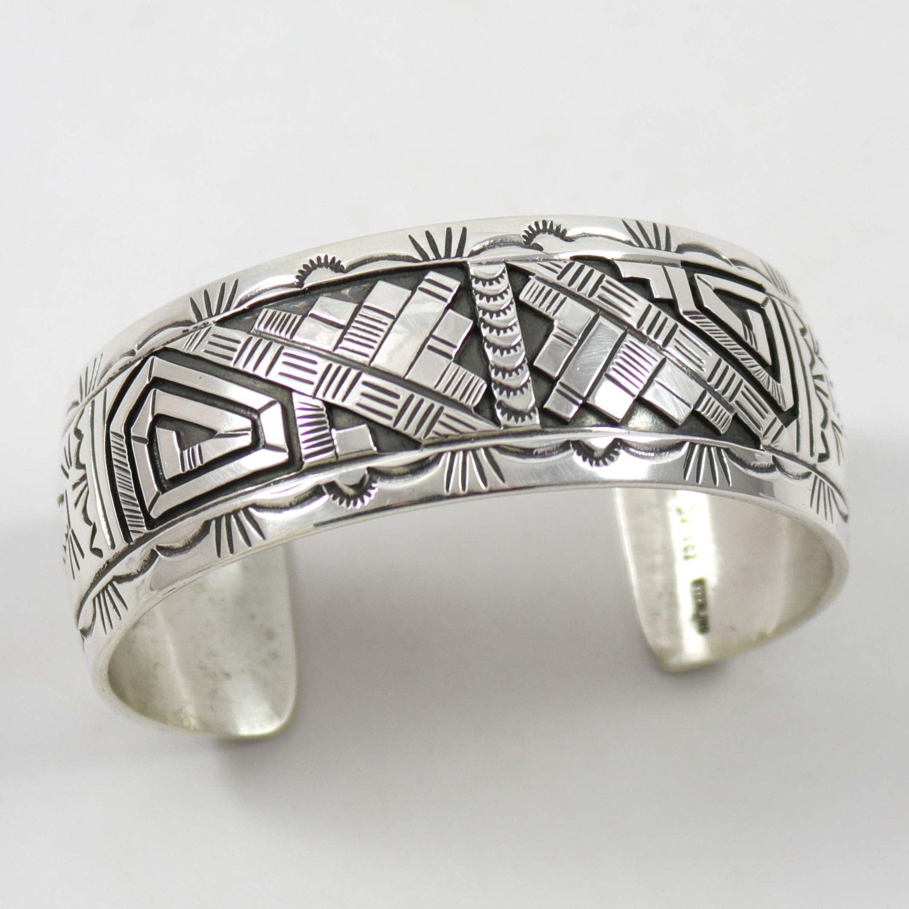 Sterling Silver Cuff Bracelet with Hand Stamped and Overlaid Geometric Designs.