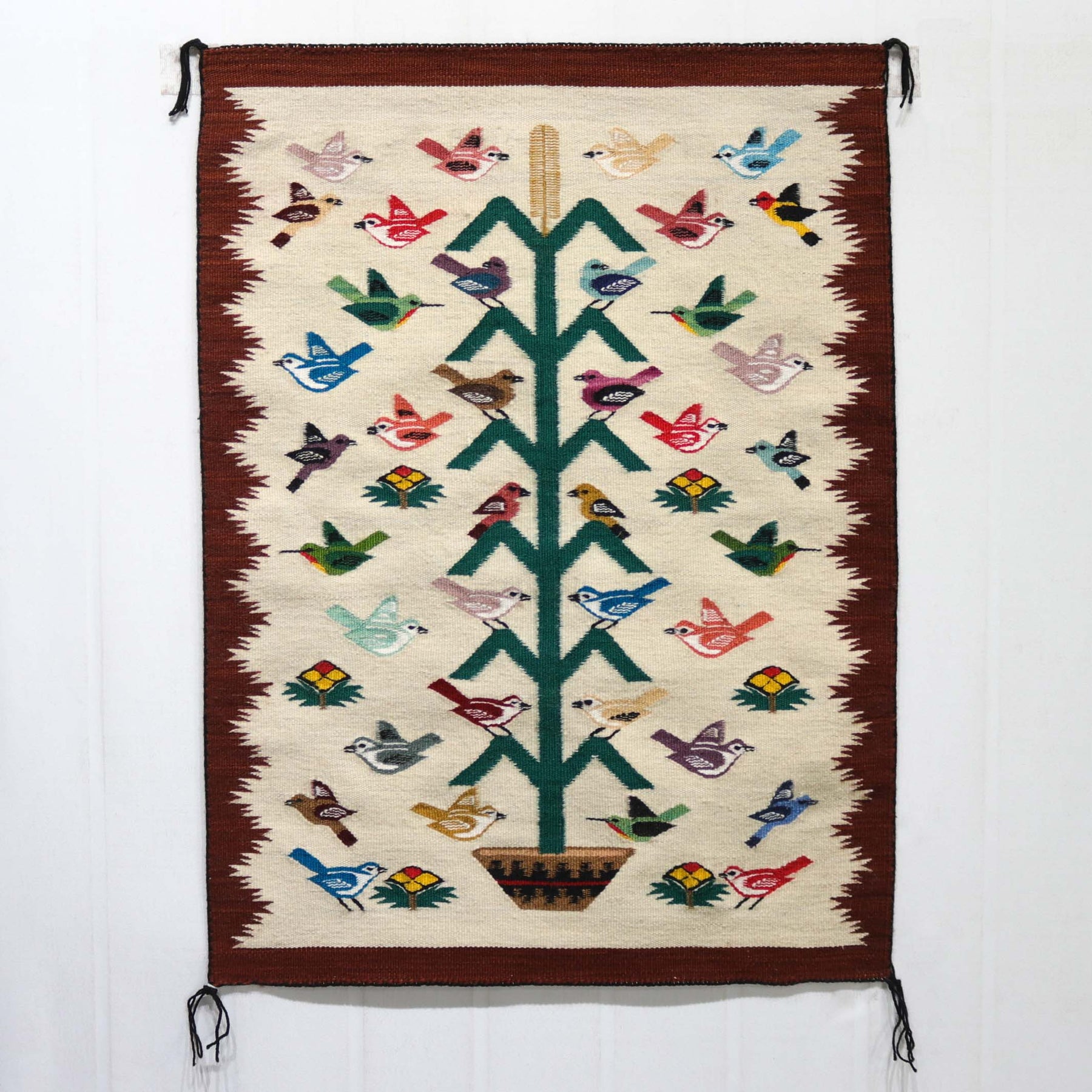 Fine Navajo Bird Pictorial Weaving with a Central Corn Stalk and Thirty Eight Birds. This weaving features hand-carded and spun wool.
