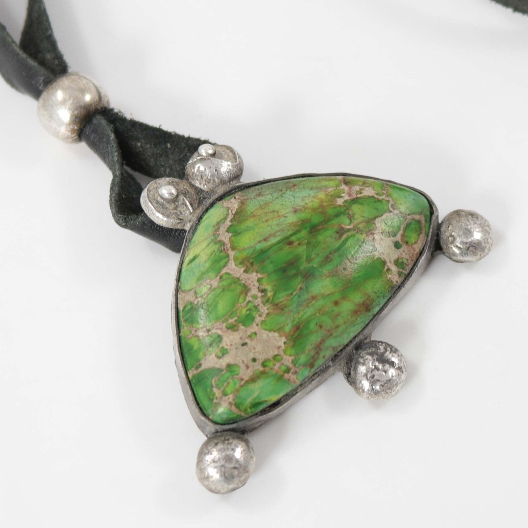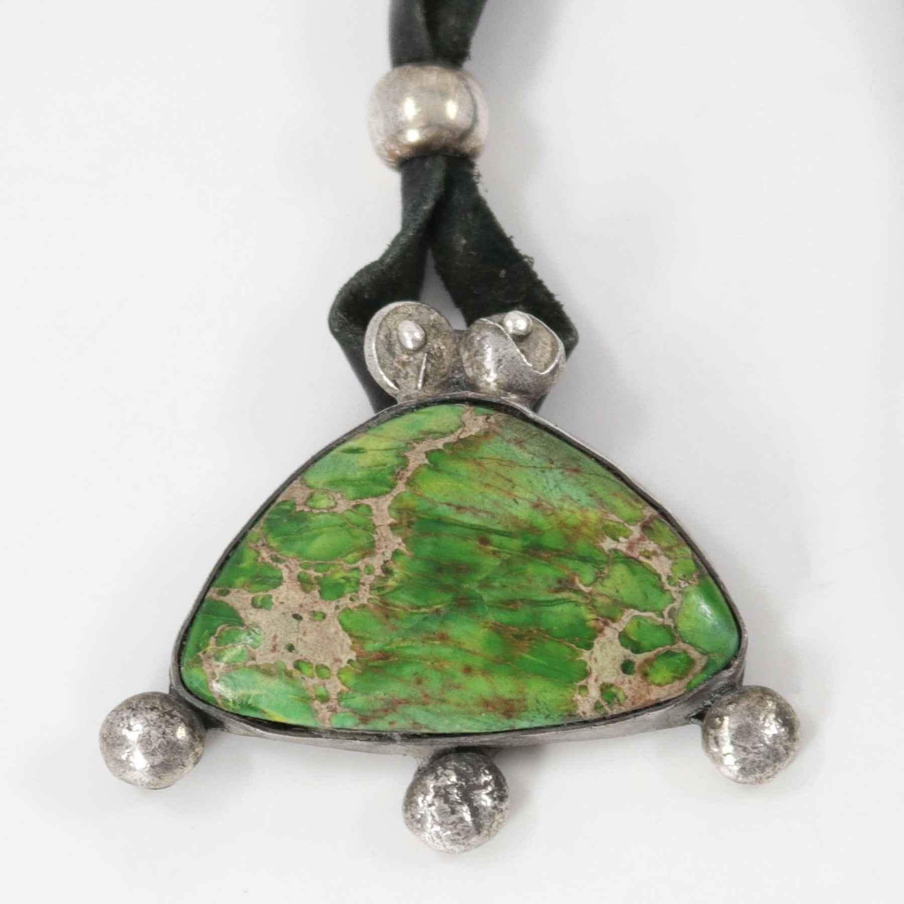 Hand Forged Coin Silver Bug Pendant set with Gaspeite. This pendant is on a 34” black leather cord with a silver bead for adjusting the length.