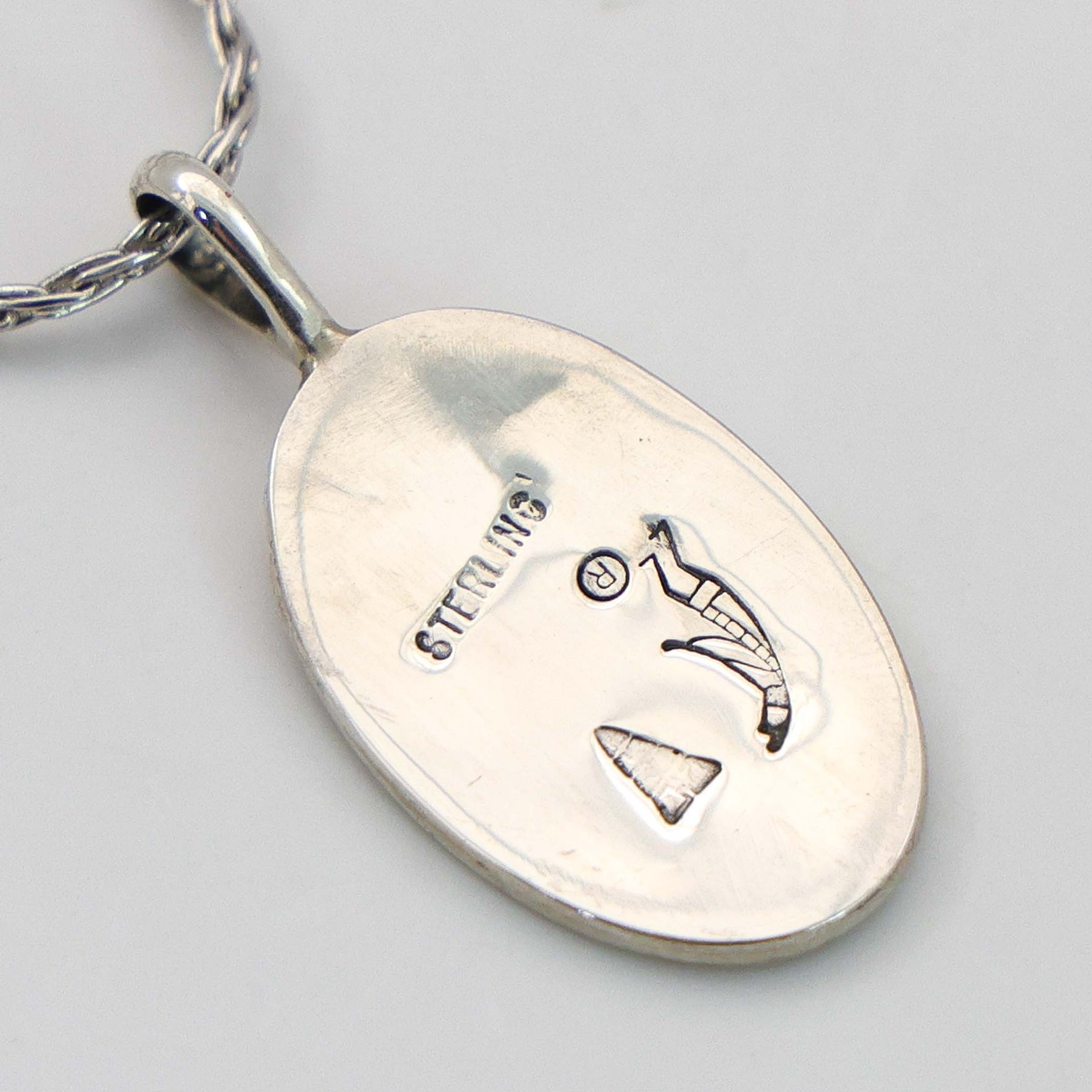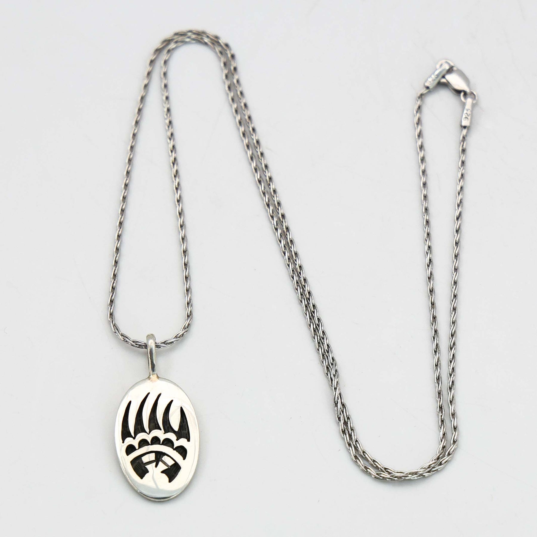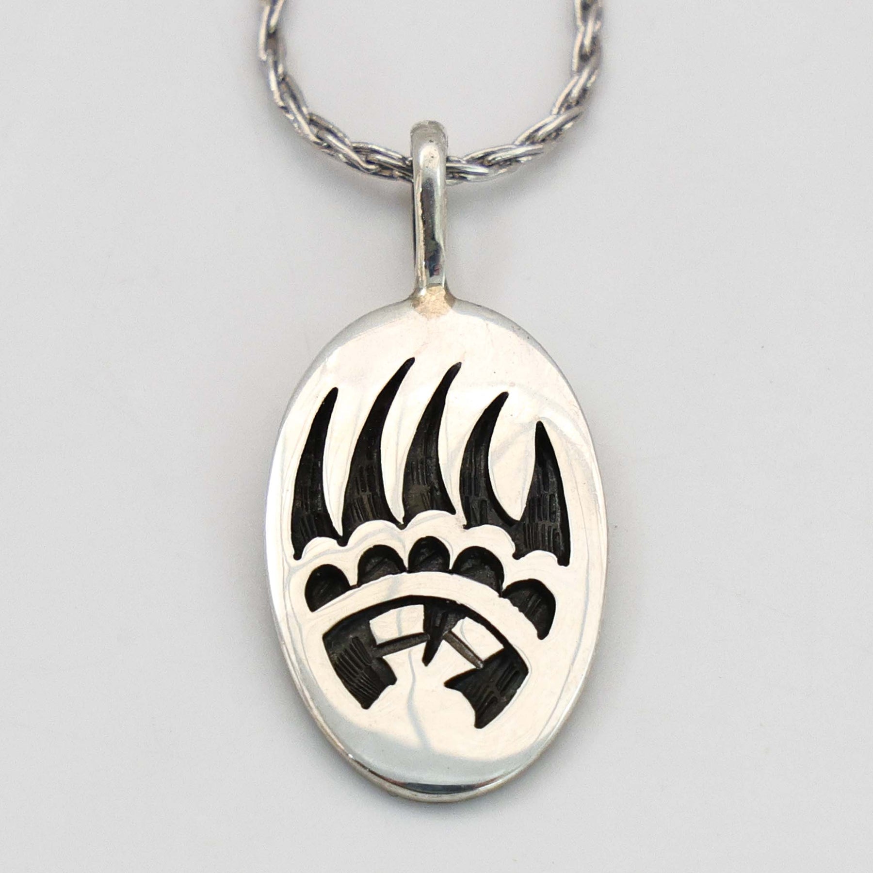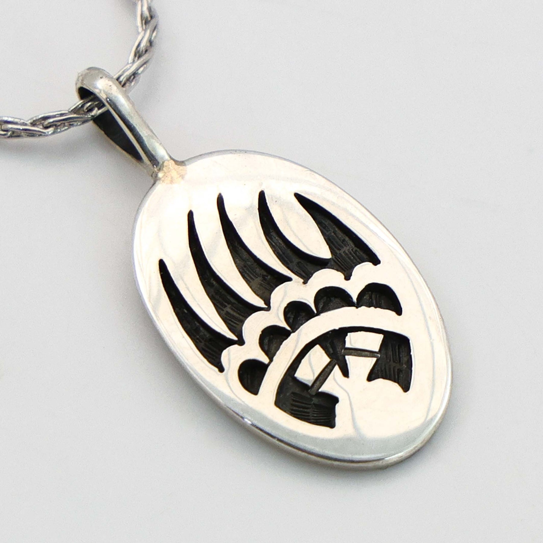 Sterling Silver Pendant with Hopi Overlaid Bear Paw Design with Prayer Feathers (Pahos) on a 20” sterling silver chain by Raymie Namingha.