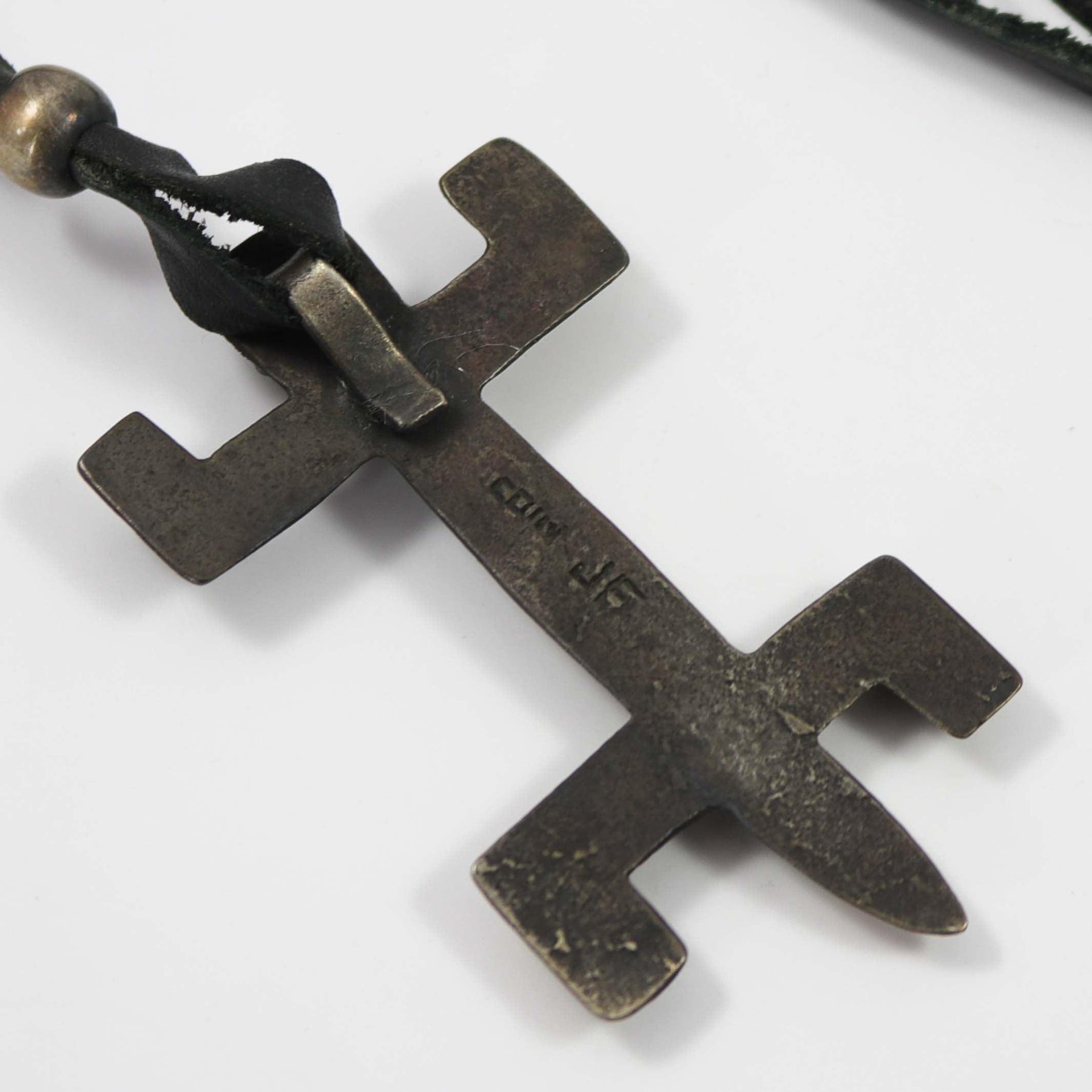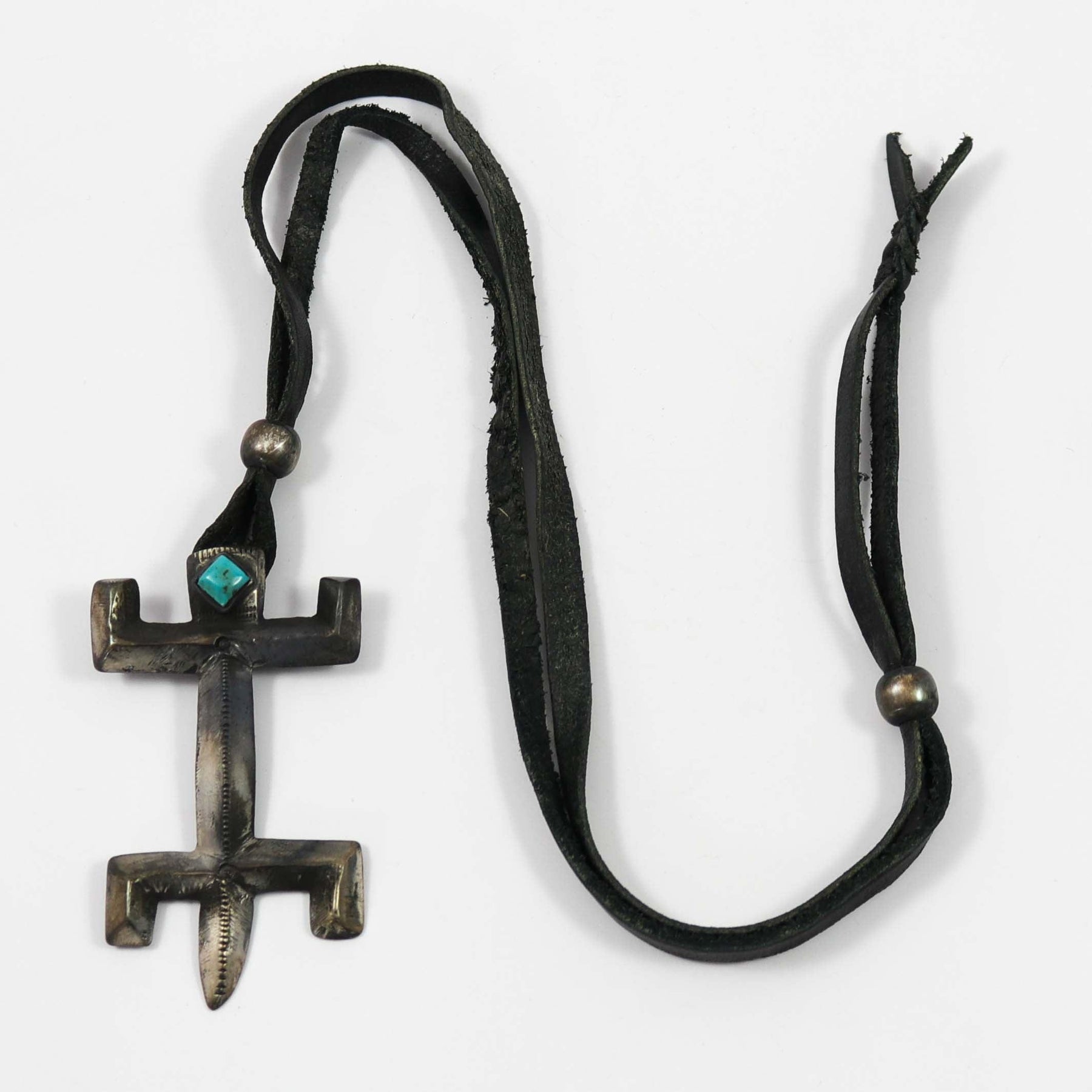 Hand Forged Coin Silver Petroglyph Human Figure Pendant set with Natural Kingman Turquoise on a 31” Leather Cord with Coin Silver Beads for Adjusting the Length.
