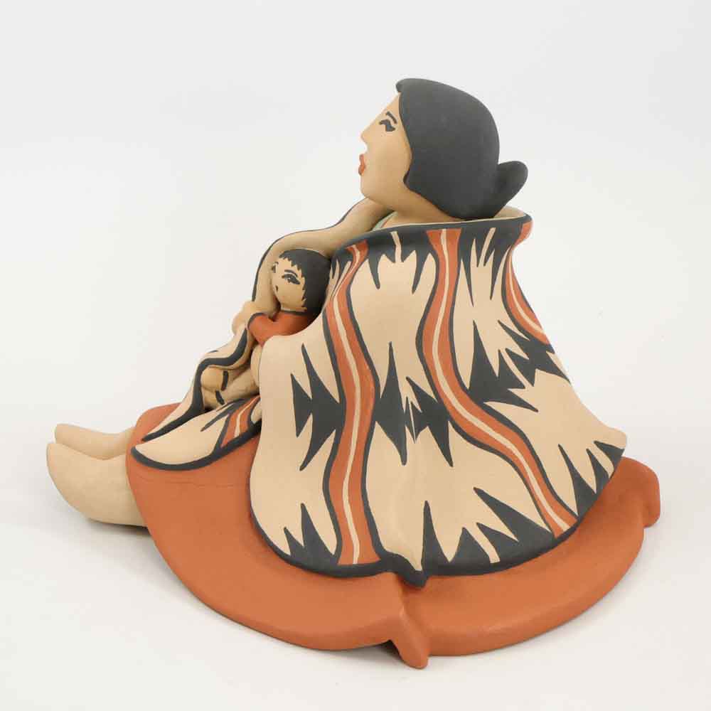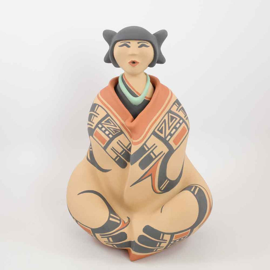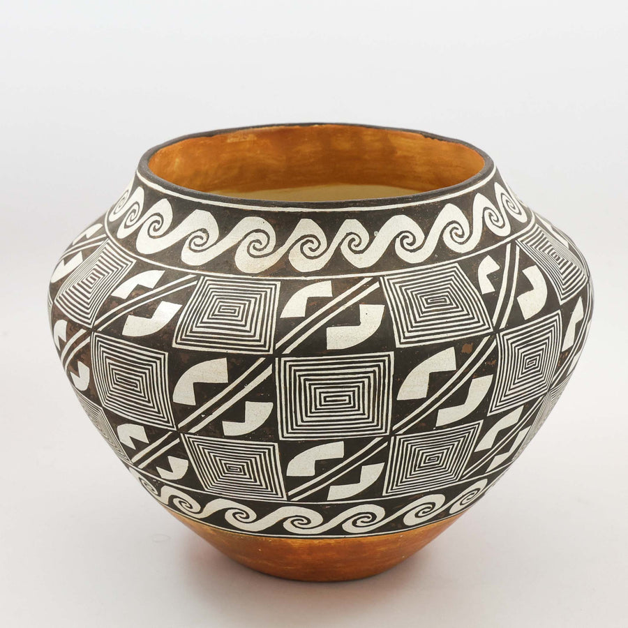 The clay to make the pots is still being gathered at historic sites near their pueblos. After gathering the clay and painstakingly preparing it, the potters form the coils, or ropes, of clay and shape the pot coil by coil. Then the pot is dried, scraped with a piece of gourd, sanded, and slipped with a fine clay mixture. The pot is polished over and over with a polishing stone often handed down from generation to generation. The skillful polisher gives the pot its lasting and beautiful sheen. Pueblo pottery is hand-coiled, and no wheel is used – which makes the perfect symmetry of the pots even more impressive. Pots are still traditionally fired in an open pit fire outdoors utilizing slabs of wood for fuel. The fire can be smothered with sheep manure to turn the clay a deep black color.