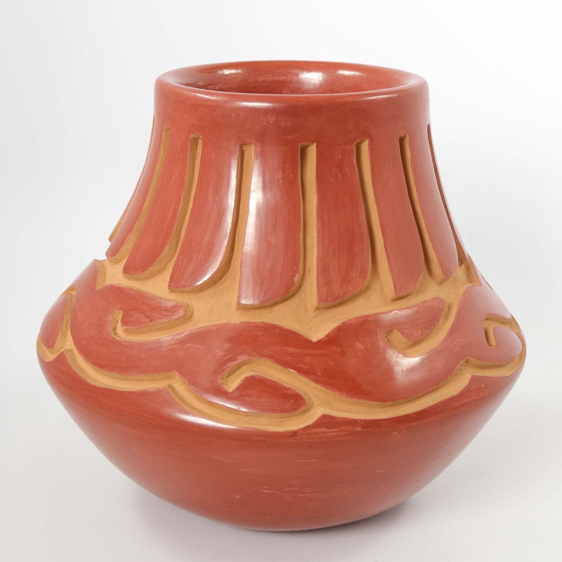Hand-Coiled and Traditionally Fired Red Santa Clara Vase with Carved Eagle Feathers and an Avanyu design. The Avanyu, or water serpent, is a powerful symbol in Pueblo and Southwestern art, representing water, rain, and the life-giving forces of nature. Often depicted with flowing curves and horns, it serves as a guardian of water and a reminder of nature’s balance and power.