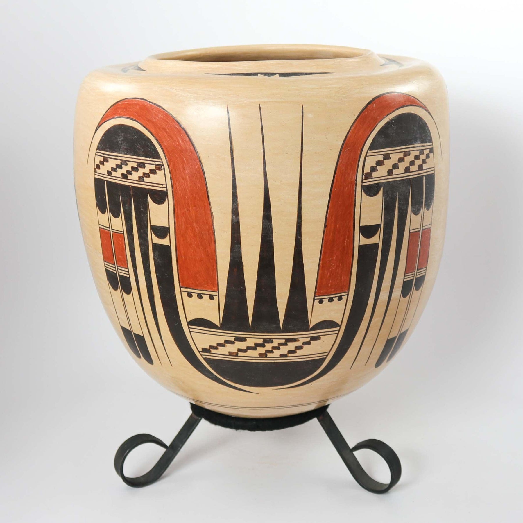 1990s Hand-Coiled and Traditionally Fired Hopi Jar with Hand-Painted Polychrome Design Elements.