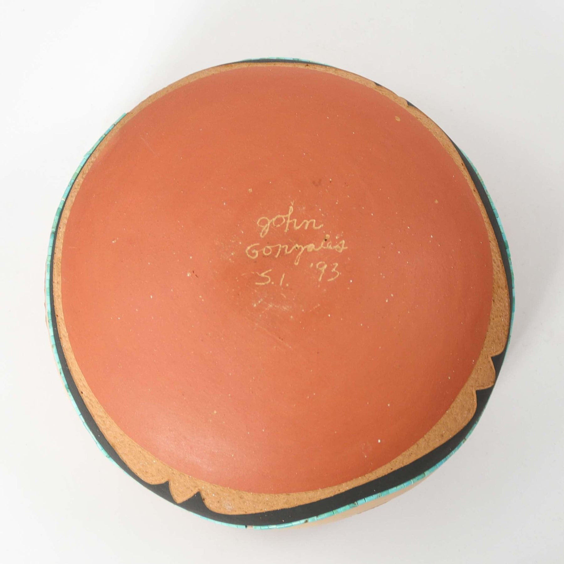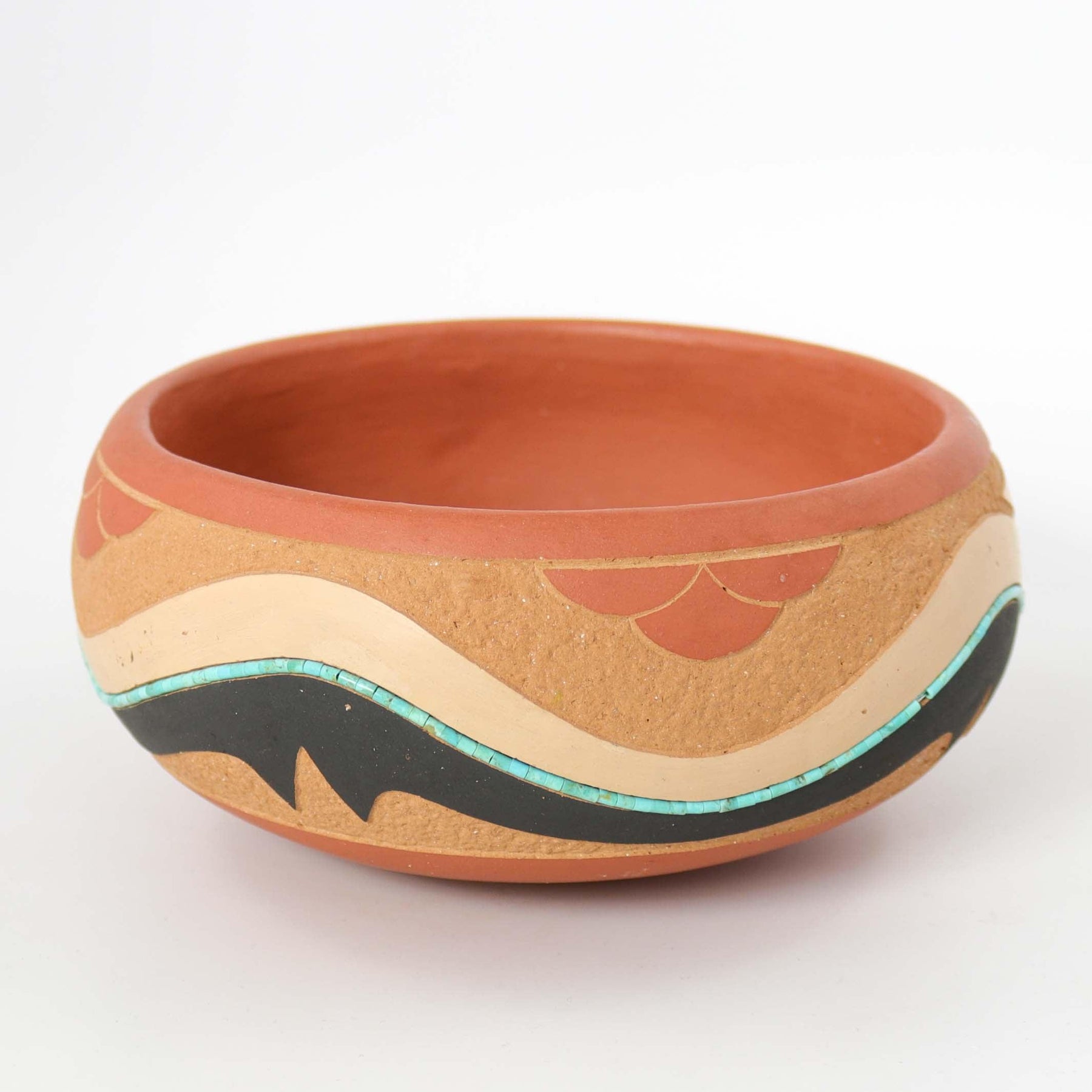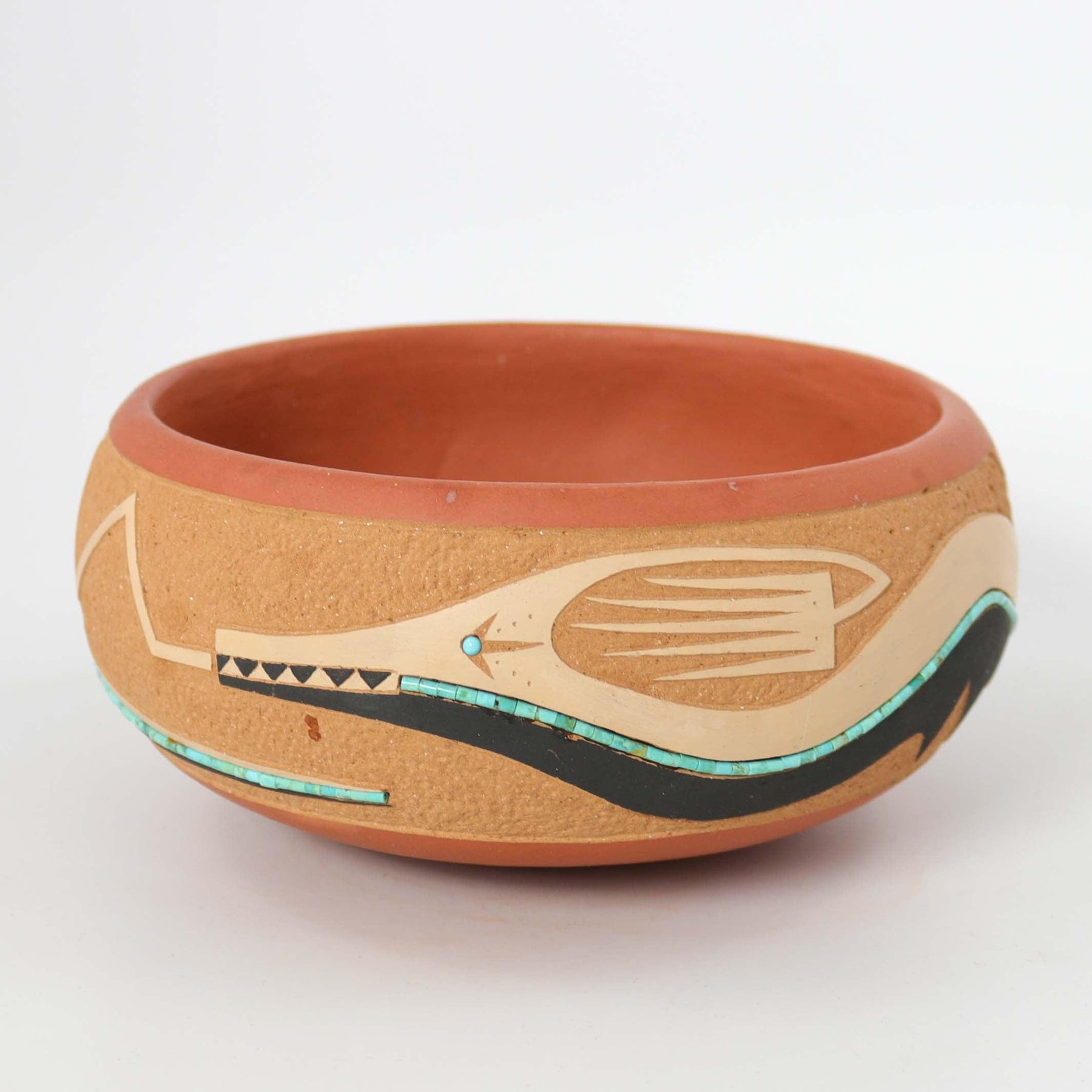 1993 Hand-Coiled and Traditionally Fired San Ildefonso Bowl with Hand-Carved and Painted Water Serpent Designs Elements. This piece of pottery features inlaid turquoise heishi beads.