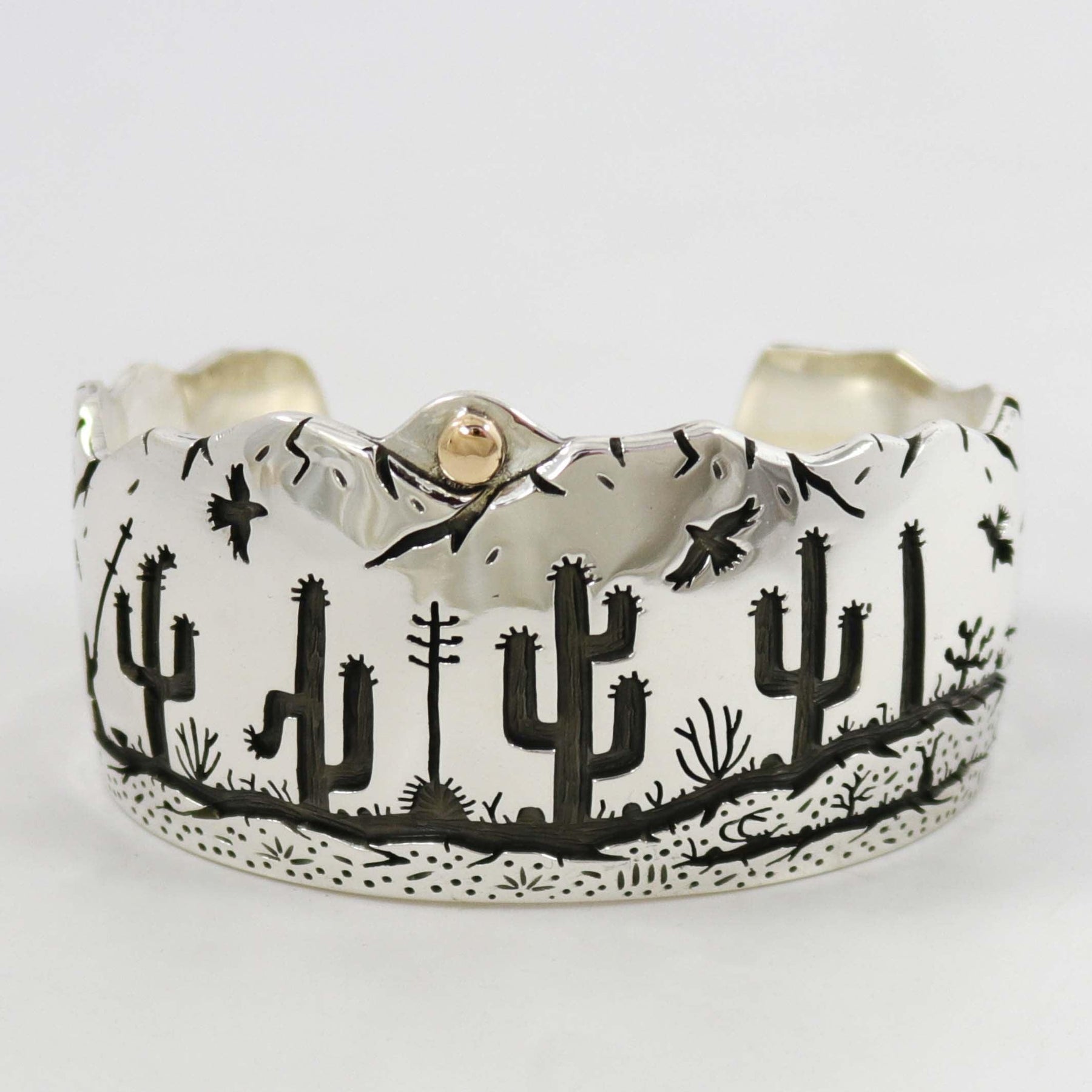Sterling Silver Cuff Bracelet with an Intricate Overlaid Desert Scene Design including a 14k Gold Sun in the Sky by Tohono O’Odham and Akmel O’Odham Silversmith, Rick Manuel.