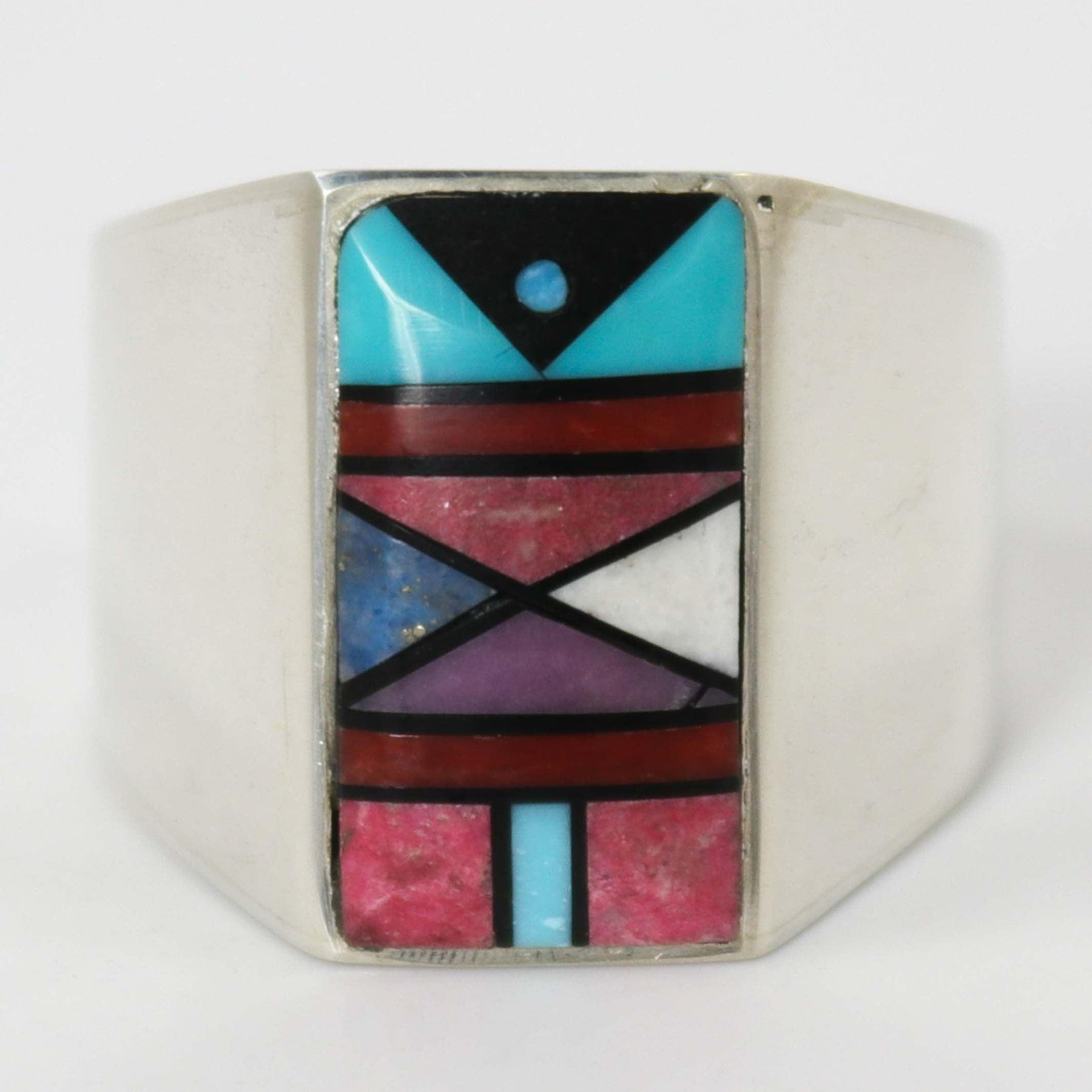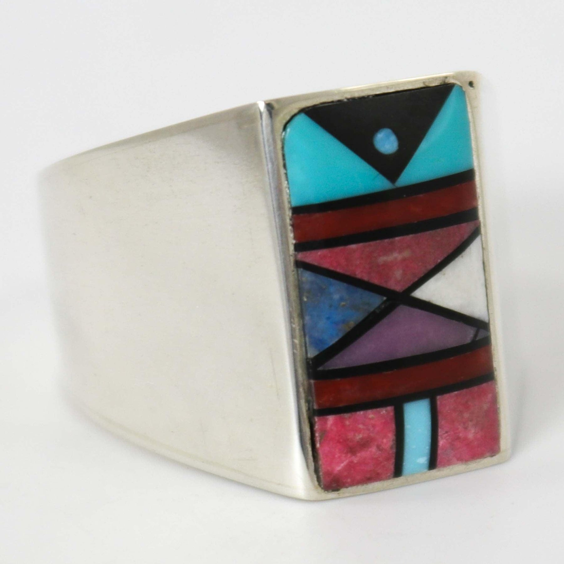 Sterling Silver Ring with Mosaic Inlaid Turquoise, Jet, Mediterranean Coral, Rhodochrosite, Phosphosiderite, White Marble, and Lapis.