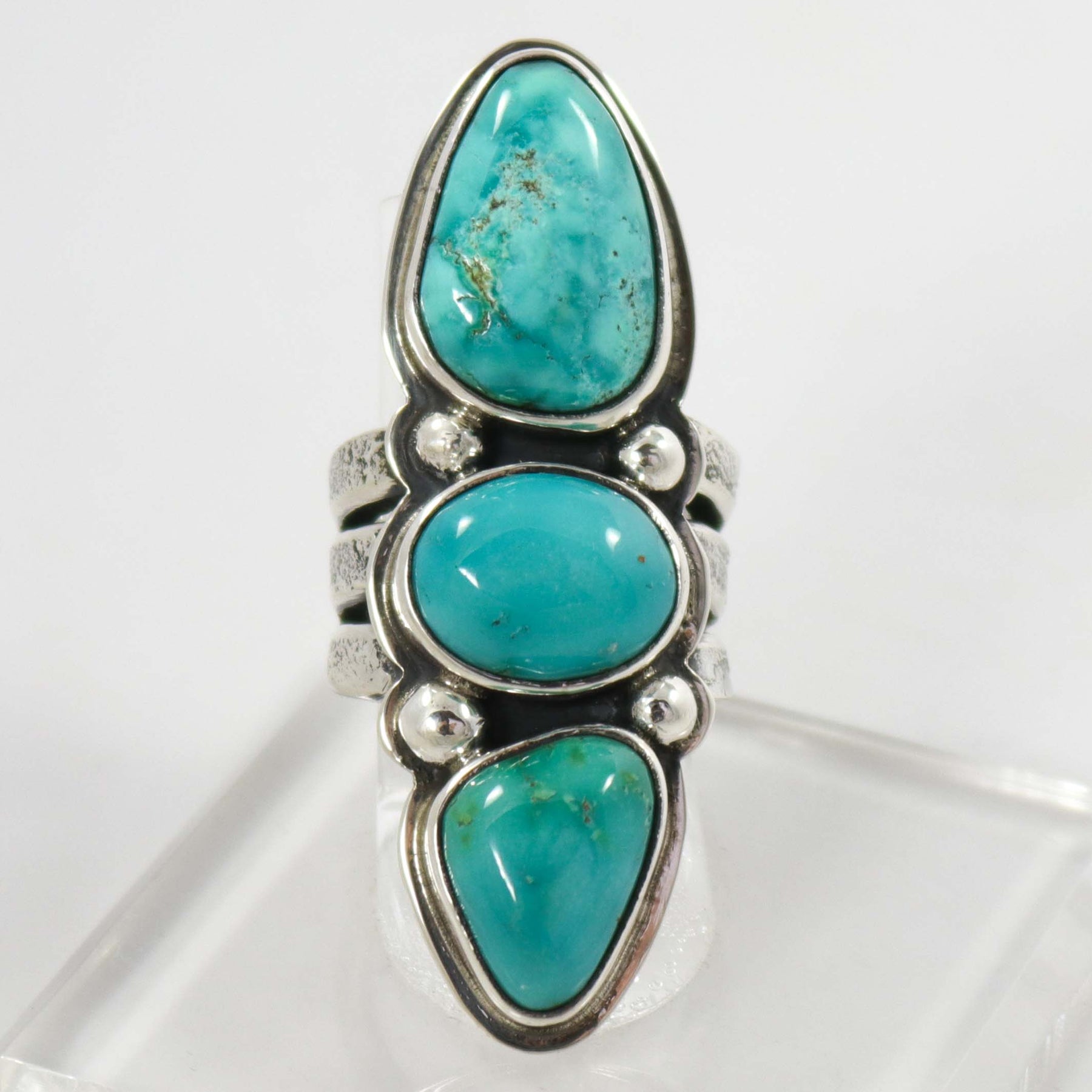 Sterling Silver Ring with a Tufa Cast Split Band and set with Natural Fox Turquoise from Nevada.