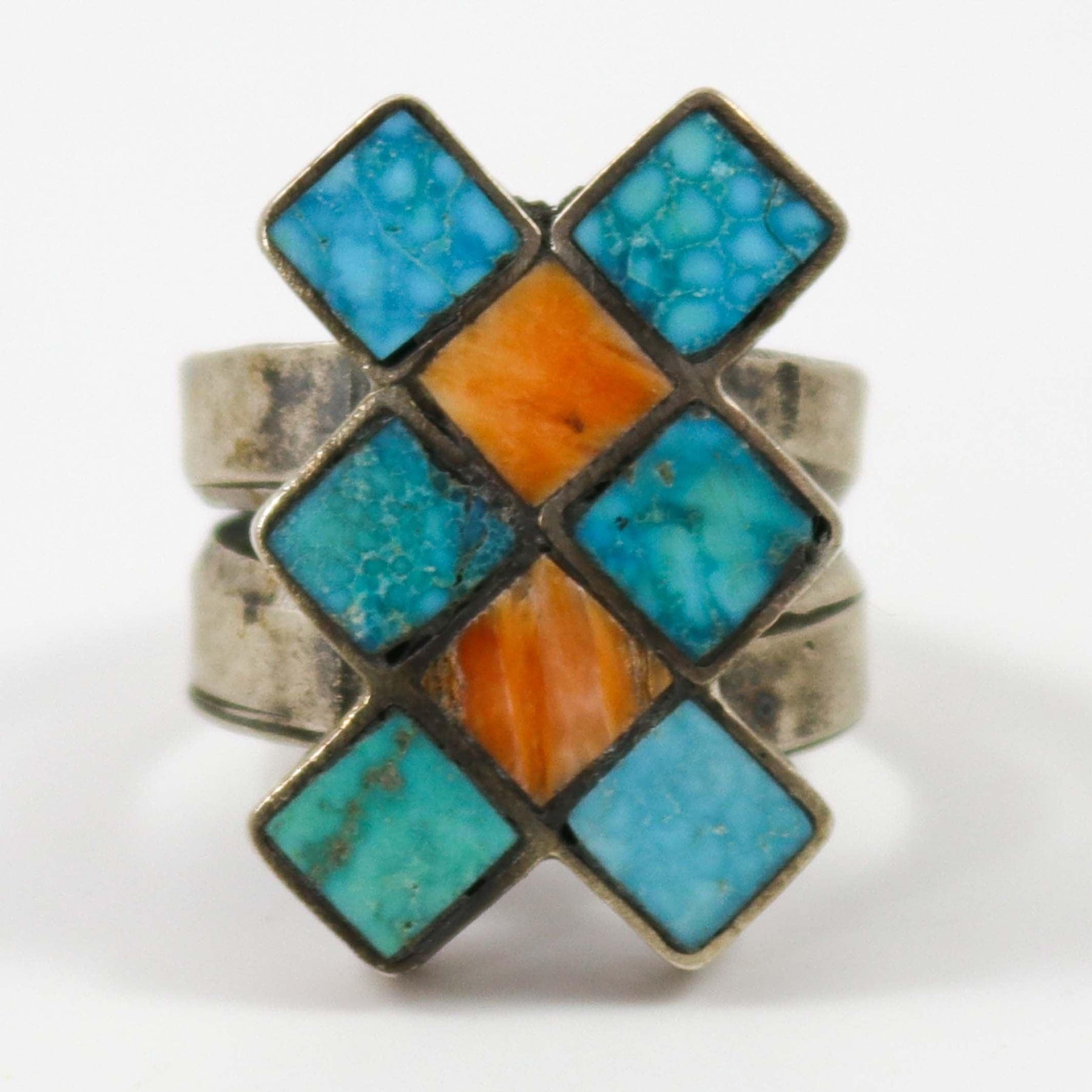 Hand-Forged Coin Silver Ring with Hand-Stamped Designs and Inlaid Natural Turquoise and Spiny Oyster Shell.